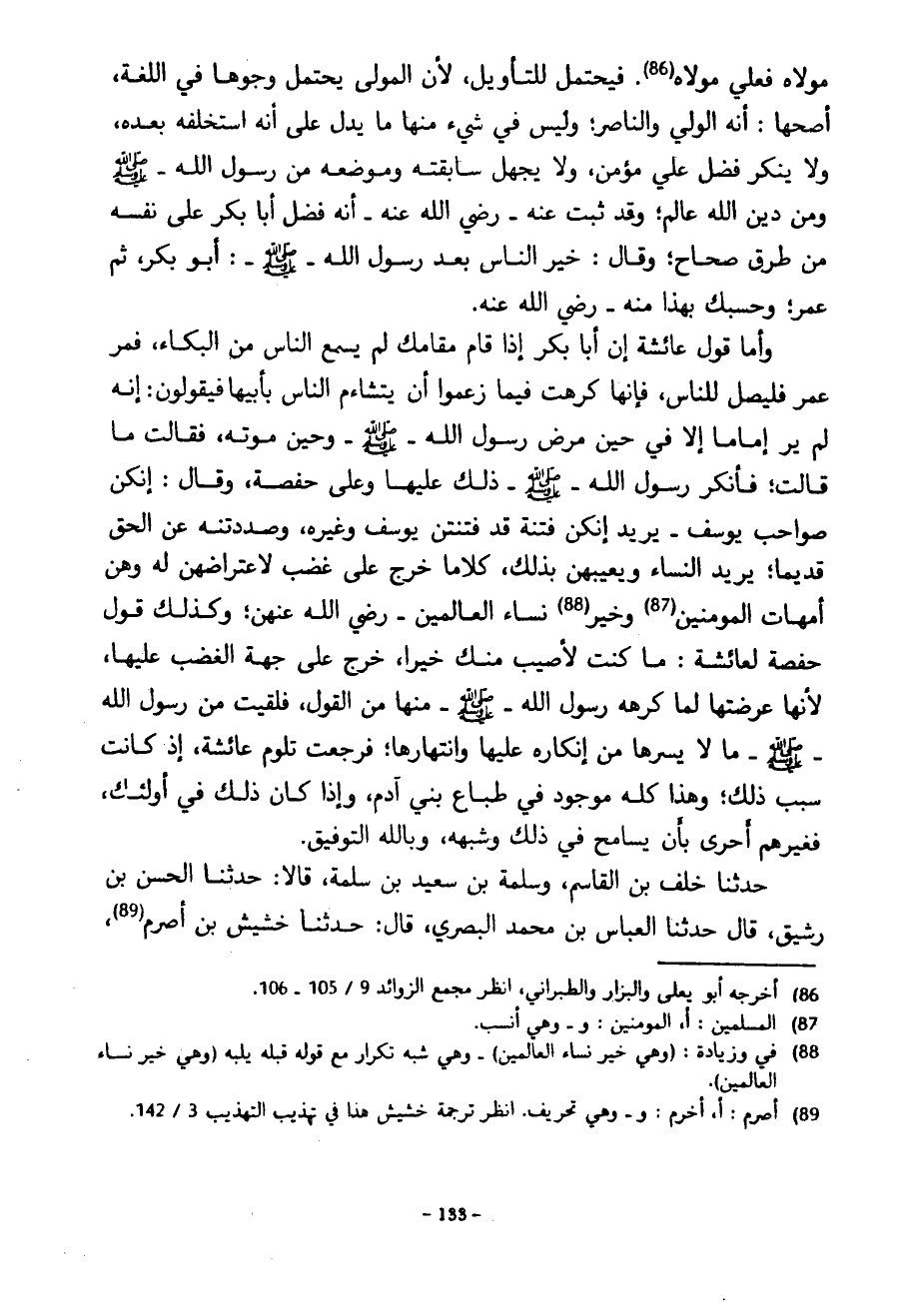 مَوْلَاهُ فَعَلِيٌّ مَوْلَاهُ فَيُحْتَمَلُ لِلتَّأْوِيلِ لِأَنَّ الْمَوْلَى يَحْتَمِلُ وُجُوهًا فِي اللُّغَةِ أَصَحُّهَا أَنَّهُ الْوَلِيُّ وَالنَّاصِرُ وَلَيْسَ فِي شَيْءٍ مِنْهَا مَا يَدُلُّ عَلَى أَنَّهُ اسْتَخْلَفَهُ بَعْدَهُ وَلَا يُنْكِرُ فَضْلَ عَلِيٍّ مُؤْمِنٌ وَلَا يَجْهَلُ سَابِقَتَهُ وَمَوْضِعَهُ مِنْ رَسُولِ اللَّهِ صَلَّى اللَّهُ عَلَيْهِ وَسَلَّمَ وَمِنْ دِينِ اللَّهِ عَالِمٌ وَقَدْ ثَبَتَ عَنْهُ رَضِيَ اللَّهُ عَنْهُ أَنَّهُ فَضَّلَ أَبَا بَكْرٍ عَلَى نَفْسِهِ مِنْ طُرُقٍ صِحَاحٍ وَقَالَ خَيْرُ النَّاسِ بَعْدَ رَسُولِ اللَّهِ صَلَّى اللَّهُ عَلَيْهِ وَسَلَّمَ أَبُو بَكْرٍ ثُمَّ عُمَرُ وَحَسْبُكَ بِهَذَا مِنْهُ رَضِيَ اللَّهُ عَنْهُ وَأَمَّا قَوْلُ عَائِشَةَ إِنَّ أَبَا بَكْرٍ إِذَا قَامَ مَقَامَكَ لَمْ يُسْمِعِ النَّاسَ مِنَ الْبُكَاءِ فَمُرْ عُمَرَ فَلْيُصَلِّ لِلنَّاسِ فَإِنَّهَا كَرِهَتْ فِيمَا زَعَمُوا أَنْ يَتَشَاءَمَ النَّاسُ بِأَبِيهَا فَيَقُولُونَ إِنَّهُ لَمْ يُرَ إِمَامًا إِلَّا فِي حِينِ مَرِضَ رَسُولُ اللَّهِ صَلَّى اللَّهُ عَلَيْهِ وَسَلَّمَ وَحِينَ مَوْتِهِ فَقَالَتْ مَا قَالَتْ فَأَنْكَرَ رَسُولُ اللَّهِ صَلَّى اللَّهُ عَلَيْهِ وَسَلَّمَ ذَلِكَ عَلَيْهَا وَعَلَى حَفْصَةَ وَقَالَ إِنَّكُنَّ صَوَاحِبُ يُوسُفَ يُرِيدُ إِنَّكُنَّ فِتْنَةٌ قَدْ فَتَنْتُنَّ يُوسُفَ وَغَيْرَهُ وَصَدَدْتُنَّهُ عَنِ الْحَقِّ قَدِيمًا يُرِيدُ النِّسَاءَ وَيَعِيبُهُنَّ بِذَلِكَ كَلَامًا خَرَجَ عَلَى غَضَبٍ لِاعْتِرَاضِهِنَّ لَهُ وَهُنَّ أُمَّهَاتُ الْمُؤْمِنِينَ وَخَيْرُ نِسَاءِ الْعَالَمِينَ رَضِيَ اللَّهُ عَنْهُنَّ وَكَذَلِكَ قَوْلُ حَفْصَةَ لِعَائِشَةَ مَا كُنْتُ لِأُصِيبُ مِنْكِ خَيْرًا خَرَجَ عَلَى جِهَةِ الْغَضَبِ عَلَيْهَا لِأَنَّهَا عَرَّضَتْهَا لِمَا كَرِهَهُ رَسُولُ اللَّهِ صَلَّى اللَّهُ عَلَيْهِ وَسَلَّمَ مِنْهَا مِنَ الْقَوْلِ فَلَقِيَتْ مِنْ رَسُولِ اللَّهِ صَلَّى اللَّهُ عَلَيْهِ وَسَلَّمَ مَا لَا يَسُرُّهَا مِنْ إِنْكَارِهِ عَلَيْهَا وَانْتِهَارِهَا فَرَجَعَتْ تَلُومُ عَائِشَةَ إِذْ كَانَتْ سَبَبَ ذَلِكَ وَهَذَا كُلُّهُ مَوْجُودٌ فِي طِبَاعِ بَنِي آدَمَ وَإِذَا كَانَ ذَلِكَ فِي أُولَئِكَ فَغَيْرُهُمْ أَحْرَى بِأَنْ يُسَامِحَ فِي ذَلِكَ وَشِبْهِهِ وَبِاللَّهِ التَّوْفِيقُ حَدَّثَنَا خَلَفُ بْنُ الْقَاسِمِ وَسَلَمَةُ بْنُ سَعِيدِ بْنِ سَلَمَةَ قَالَا حَدَّثَنَا الْحَسَنُ بْنُ رَشِيقٍ قَالَ حَدَّثَنَا الْعَبَّاسُ بْنُ مُحَمَّدٍ الْبَصْرِيُّ قَالَ حَدَّثَنَا خُشَيْشُ بْنُ أَصْرَمَ