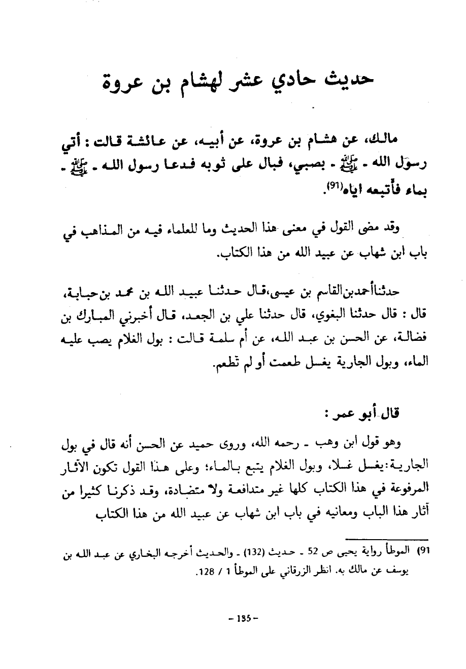 حَدِيثٌ حَادِيَ عَشَرَ لِهِشَامِ بْنِ عُرْوَةَ مَالِكٍ عَنْ هِشَامِ بْنِ عُرْوَةَ عَنْ أَبِيهِ عن عَائِشَةَ قَالَتْ أُتِيَ رَسُولُ اللَّهِ صَلَّى اللَّهُ عَلَيْهِ وَسَلَّمَ بِصَبِيٍّ فَبَالَ عَلَى ثَوْبِهِ فَدَعَا رَسُولُ اللَّهِ صَلَّى اللَّهُ عَلَيْهِ وَسَلَّمَ بِمَاءٍ فَأَتْبَعَهُ إِيَّاهُ وَقَدْ مَضَى الْقَوْلُ فِي مَعْنَى هَذَا الْحَدِيثِ وَمَا لِلْعُلَمَاءِ فِيهِ مِنَ الْمَذَاهِبِ فِي بَابِ ابْنِ شِهَابٍ عَنْ عَبْدِ اللَّهِ مِنْ هَذَا الْكِتَابِ حَدَّثَنَا أَحْمَدُ بْنُ الْقَاسِمِ بْنِ عِيسَى قَالَ حَدَّثَنَا عُبَيْدُ اللَّهِ بْنُ مُحَمَّدِ بْنِ حَبَابَةَ قَالَ قَالَ حَدَّثَنَا الْبَغَوِيُّ قَالَ حَدَّثَنَا عَلِيُّ بْنُ الْجَعْدِ قَالَ أَخْبَرَنِي الْمُبَارَكُ بْنُ فَضَالَةَ عَنِ الْحَسَنِ بْنِ عَبْدِ اللَّهِ عَنْ أُمِّ سَلَمَةَ قَالَتْ بَوْلُ الْغُلَامِ يُصَبُّ عَلَيْهِ الْمَاءُ وَبَوْلُ الْجَارِيَةِ يُغْسَلُ طَعِمَتْ أَوْ لَمْ تَطْعَمْ قَالَ أَبُو عُمَرَ وَهُوَ قَوْلُ ابْنِ وَهْبٍ رَحِمَهُ اللَّهُ وَرَوَى حُمَيْدٌ عَنِ الْحَسَنِ أَنَّهُ قَالَ فِي بَوْلِ الْجَارِيَةِ يُغْسَلُ غَسْلًا وَبَوْلُ الْغُلَامِ يُتْبَعُ بِالْمَاءِ وَعَلَى هَذَا الْقَوْلِ تَكُونُ الْآثَارُ الْمَرْفُوعَةُ فِي هَذَا الكتاب كلها غَيْرَ مُتَدَافِعَةٍ وَلَا مُتَضَادَّةً وَقَدْ ذَكَرْنَا كَثِيرًا مِنْ آثَارِ هَذَا الْبَابِ وَمَعَانِيهِ فِي بَابِ ابْنِ شِهَابٍ عَنْ عُبَيْدِ اللَّهِ مِنْ هَذَا الكتاب