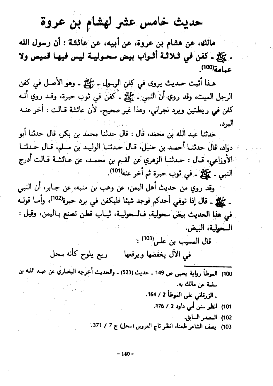 حديث خامس عشر لهشام بن عروة ملاك عَنْ هِشَامِ بْنِ عُرْوَةَ عَنْ أَبِيهِ عَنْ عَائِشَةَ أَنَّ رَسُولَ اللَّهِ صَلَّى اللَّهُ عَلَيْهِ وَسَلَّمَ كُفِّنَ فِي ثَلَاثَةِ أَثْوَابٍ بِيضٍ سُحُولِيَّةٍ لَيْسَ فِيهَا قَمِيصٌ وَلَا عِمَامَةٌ هَذَا أَثْبَتُ حَدِيثٍ يُرْوَى فِي كَفَنِ الرَّسُولِ صَلَّى اللَّهُ عَلَيْهِ وَسَلَّمَ وَهُوَ الْأَصْلُ فِي كَفَنِ الرَّجُلِ الْمَيِّتِ وَقَدْ رُوِيَ أَنَّ النَّبِيَّ صَلَّى اللَّهُ عَلَيْهِ وَسَلَّمَ كُفِّنَ فِي ثَوْبٍ حِبَرَةٍ وَقَدْ رُوِيَ أَنَّهُ كُفِّنَ فِي رَيْطَتَيْنِ وَبُرْدٍ نَجْرَانِيٍّ وَهَذَا غَيْرُ صَحِيحٍ لِأَنَّ عَائِشَةَ قَالَتْ أُخِّرَ عَنْهُ الْبُرْدُ حَدَّثَنَا عَبْدُ اللَّهِ بْنُ مُحَمَّدٍ قَالَ قَالَ حَدَّثَنَا مُحَمَّدُ بْنُ بَكْرٍ قَالَ حَدَّثَنَا أَبُو دَاوُدَ قَالَ حَدَّثَنَا أَحْمَدُ بْنُ حَنْبَلٍ قَالَ حَدَّثَنَا الْوَلِيدُ بْنُ مُسْلِمٍ قَالَ حَدَّثَنَا الأوزاعي قال حدثنا الزهري عن القسم بْنِ مُحَمَّدٍ عَنْ عَائِشَةَ قَالَتْ أُدْرِجَ النَّبِيُّ صَلَّى اللَّهُ عَلَيْهِ وَسَلَّمَ فِي ثَوْبٍ حِبَرَةٍ ثُمَّ أُخِّرَ عَنْهُ وَقَدْ رُوِيَ مِنْ حَدِيثِ أَهْلِ الْيَمَنِ عَنْ وَهْبِ بْنِ مُنَبِّهٍ عَنْ جَابِرٍ أَنَّ النَّبِيَّ صَلَّى اللَّهُ عَلَيْهِ وَسَلَّمَ قَالَ إِذَا تُوُفِّيَ أَحَدُكُمْ فَوَجَدَ شَيْئًا فَلْيُكَفَّنْ فِي بُرْدٍ حِبَرَةٍ وَأَمَّا قَوْلُهُ فِي هَذَا الْحَدِيثِ بِيضٌ سَحُولِيَّةٌ فَالسَّحُولِيَّةُ ثِيَابُ قُطْنٍ تُصْنَعُ باليمن وَقِيلَ السَّحُولِيَّةُ الْبِيضُ قَالَ الْمُسَيَّبُ بْنُ عَلْسٍ ... فِي الْآلِ يَخْفِضُهَا وَيَرْفَعُهَا ... ... رِيعٌ يَلُوحُ كَأَنَّهُ سحل