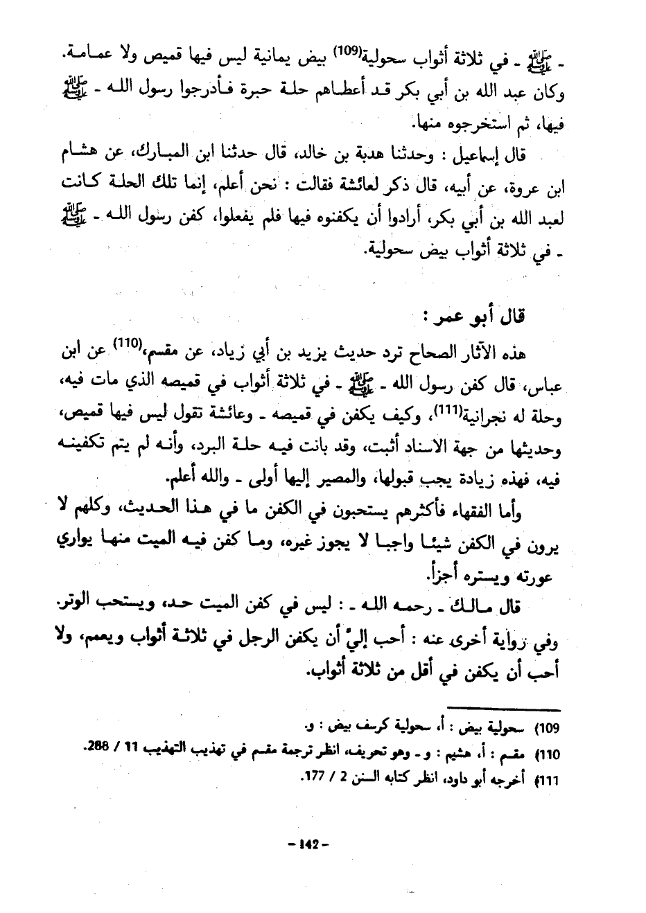 صَلَّى اللَّهُ عَلَيْهِ وَسَلَّمَ فِي ثَلَاثَةِ أَثْوَابٍ سَحُولِيَّةٍ بَيْضٍ يَمَانِيَّةٍ لَيْسَ فِيهَا قَمِيصٌ وَلَا وَكَانَ عَبْدُ اللَّهِ بْنُ أَبِي بَكْرٍ قَدْ أَعْطَاهُمْ حُلَّةً حِبَرَةً فَأَدْرَجُوا رَسُولُ اللَّهِ صَلَّى اللَّهُ عَلَيْهِ وَسَلَّمَ فِيهَا ثُمَّ اسْتَخْرَجُوهُ مِنْهَا قَالَ إِسْمَاعِيلُ وَحَدَّثَنَا هُدْبَةُ بْنُ خَالِدٍ قَالَ حدثنا ابن المبارك عن هشام ابن عُرْوَةَ عَنْ أَبِيهِ قَالَ ذُكِرَ لِعَائِشَةَ فَقَالَتْ نَحْنُ أَعْلَمُ إِنَّمَا تِلْكَ الْحُلَّةُ كَانَتْ لِعَبْدِ اللَّهِ بْنِ أَبِي بَكْرٍ أَرَادُوا أَنْ يُكَفِّنُوهُ فِيهَا فَلَمْ يَفْعَلُوا كُفِّنَ رَسُولُ اللَّهِ صَلَّى اللَّهُ عَلَيْهِ وَسَلَّمَ فِي ثَلَاثَةِ أَثْوَابٍ بِيضٍ سَحُولِيَّةٍ قَالَ أَبُو عُمَرَ هَذِهِ الْآثَارُ الصِّحَاحُ تَرُدُّ حَدِيثَ يَزِيدَ بْنِ أَبِي زِيَادٍ عَنْ مِقْسَمٍ عَنِ ابْنِ عَبَّاسٍ قَالَ كُفِّنَ رَسُولُ اللَّهِ صَلَّى اللَّهُ عَلَيْهِ وَسَلَّمَ فِي ثَلَاثَةِ أَثْوَابٍ فِي قَمِيصُهُ الَّذِي مَاتَ فِيهِ وَحُلَّةٌ لَهُ نَجْرَانِيَّةٌ وَكَيْفَ يُكَفَّنُ فِي قَمِيصِهِ وَعَائِشَةُ تَقُولُ لَيْسَ فِيهَا قَمِيصٌ وَحَدِيثُهَا مِنْ جِهَةِ الْإِسْنَادِ أَثْبَتُ وَقَدْ بَانَتْ فِيهِ حُلَّةُ الْبَرْدِ وَأَنَّهُ لَمْ يَتِمَّ تَكْفِينُهُ فِيهِ فَهَذِهِ زِيَادَةٌ يَجِبُ قَبُولُهَا وَالْمَصِيرُ إِلَيْهَا أَوْلَى وَاللَّهُ أَعْلَمُ وَأَمَّا الْفُقَهَاءُ فَأَكْثَرُهُمْ يَسْتَحِبُّونَ فِي الْكَفَنِ مَا في هذا الحديث وكلهم لا يرون فِي الْكَفَنِ شَيْئًا وَاجِبًا لَا يَجُوزُ غَيْرُهُ وَمَا كُفِّنَ فِيهِ الْمَيِّتُ مِنْهَا يُوَارِي عَوْرَتَهُ وَيَسْتُرُهُ أَجْزَأَ قَالَ مَالِكٌ رَحِمَهُ اللَّهُ لَيْسَ فِي كَفَنِ الْمَيِّتِ حَدٌّ وَيُسْتَحَبُّ الْوَتْرُ وَفِي رِوَايَةٍ أُخْرَى عَنْهُ أَحَبُّ إِلَيَّ أَنْ يُكَفَّنَ الرَّجُلُ فِي ثَلَاثَةِ أَثْوَابٍ وَيُعَمَّمُ وَلَا أُحِبُّ أَنْ يُكَفَّنَ فِي أَقَلِّ مِنْ ثَلَاثَةِ أَثْوَابٍ