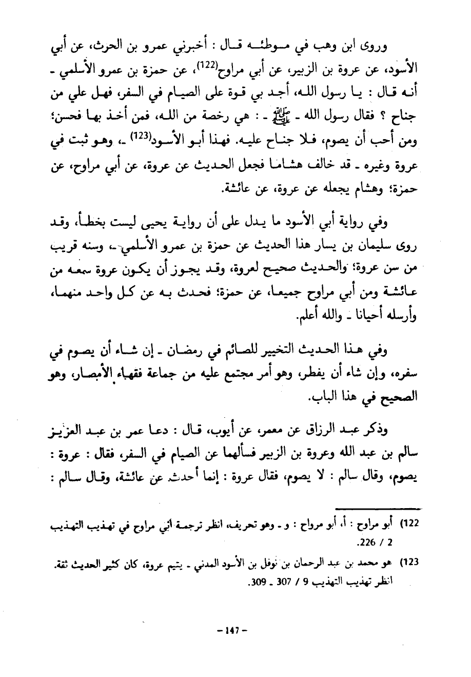 وَرَوَى ابْنُ وَهْبٍ فِي مُوَطَّئِهِ قَالَ أَخْبَرَنِي عمرو بن الحرث عَنْ أَبِي الْأَسْوَدِ عَنْ عُرْوَةَ بْنِ الزُّبَيْرِ عَنْ أَبِي مُرَاوِحٍ عَنْ حَمْزَةَ بْنِ عَمْرٍو الْأَسْلَمِيِّ أَنَّهُ قَالَ يَا رَسُولَ اللَّهِ أَجِدُ بِي قُوَّةً عَلَى الصِّيَامِ فِي السَّفَرِ فَهَلْ عَلَيَّ مِنْ جُنَاحٍ فَقَالَ رَسُولُ اللَّهِ صَلَّى اللَّهُ عَلَيْهِ وَسَلَّمَ هِيَ رُخْصَةٌ مِنَ اللَّهِ فَمَنْ أَخَذَ بِهَا فَحَسُنٌ وَمَنْ أَحَبَّ أَنْ يَصُومَ فَلَا جُنَاحَ عَلَيْهِ فَهَذَا أَبُو الْأَسْوَدِ وَهُوَ ثَبَتٌ فِي عُرْوَةَ وَغَيْرِهِ قَدْ خَالَفَ هِشَامًا فَجَعَلَ الْحَدِيثَ عَنْ عُرْوَةَ عَنْ أَبِي مُرَاوِحٍ عَنْ حَمْزَةَ وَهُشَامٌ يَجْعَلُهُ عَنْ عُرْوَةَ عَنْ عَائِشَةَ وَفِي رِوَايَةِ أَبِي الْأَسْوَدِ مَا يَدُلُّ عَلَى أَنَّ رِوَايَةَ يَحْيَى لَيْسَتْ بِخَطَأٍ وَقَدْ رَوَى سُلَيْمَانُ بْنُ يَسَارٍ هَذَا الْحَدِيثَ عَنْ حَمْزَةَ بْنِ عَمْرٍو الْأَسْلَمِيِّ وَسِنُّهُ قَرِيبٌ مِنْ سِنِّ عُرْوَةَ وَالْحَدِيثُ صَحِيحٌ لِعُرْوَةَ وَقَدْ يَجُوزُ أَنْ يَكُونَ عُرْوَةُ سَمِعَهُ مِنْ عَائِشَةَ وَمِنْ أَبِي مُرَاوِحٍ جَمِيعًا عَنْ حَمْزَةَ فَحَدَّثَ بِهِ عَنْ كُلِّ وَاحِدٍ مِنْهُمَا وَأَرْسَلَهُ أَحْيَانًا وَاللَّهُ أَعْلَمُ وَفِي هَذَا الْحَدِيثِ التَّخْيِيرُ لِلصَّائِمِ فِي رَمَضَانَ إِنْ شَاءَ أَنْ يَصُومَ فِي سَفَرِهِ وَإِنْ شَاءَ أَنْ يُفْطِرَ وَهُوَ أَمْرٌ مُجْتَمَعٌ عَلَيْهِ مِنْ جَمَاعَةِ فُقَهَاءِ الْأَمْصَارِ وَهُوَ الصَّحِيحُ فِي هَذَا الْبَابِ وَذَكَرَ عَبْدُ الرَّزَّاقِ عَنْ مَعْمَرٍ عَنْ أَيُّوبَ قَالَ دَعَا عُمَرُ بْنُ عَبْدِ الْعَزِيزِ سَالِمَ بْنَ عَبْدِ اللَّهِ وَعُرْوَةَ بْنَ الزُّبَيْرِ فَسَأَلَهُمَا عَنِ الصِّيَامِ فِي السَّفَرِ فَقَالَ عُرْوَةُ يَصُومُ وَقَالَ سَالِمٌ لَا يَصُومُ فَقَالَ عُرْوَةُ إِنَّمَا أُحَدِّثُ عَنْ عَائِشَةَ وقال سالم