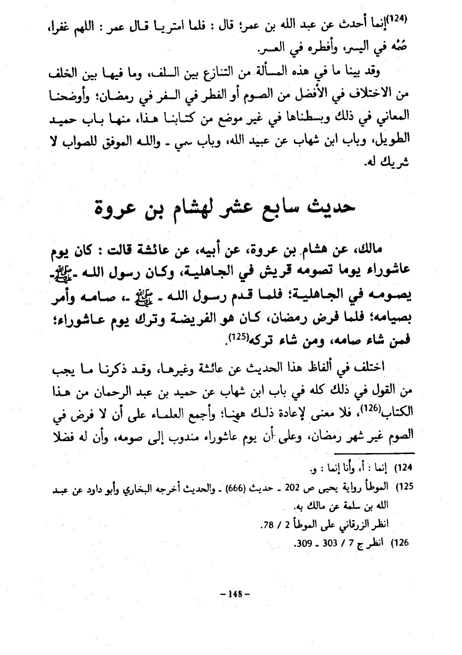 حَدِيثٌ سَابِعَ عشر لِهِشَامِ بْنِ عُرْوَةَ مَالِكٍ عَنْ هِشَامِ بْنِ عُرْوَةَ عَنْ أَبِيهِ عن عائشة قالت كَانَ يَوْمُ عَاشُورَاءَ يَوْمًا تَصُومُهُ قُرَيْشٌ فِي الْجَاهِلِيَّةِ وَكَانَ رَسُولُ اللَّهِ صَلَّى اللَّهُ عَلَيْهِ وَسَلَّمَ يَصُومُهُ فِي الْجَاهِلِيَّةِ فَلَمَّا قَدِمَ رَسُولُ اللَّهِ صَلَّى اللَّهُ عَلَيْهِ وَسَلَّمَ صَامَهُ وَأَمَرَ بِصِيَامِهِ فَلَمَّا فُرِضَ رَمَضَانُ كَانَ هُوَ الْفَرِيضَةَ وَتُرِكَ يَوْمُ عَاشُورَاءَ فَمَنْ شَاءَ صَامَهُ وَمَنْ شَاءَ تَرَكَهُ اخْتُلِفَ فِي أَلْفَاظِ هَذَا الْحَدِيثِ عَنْ عَائِشَةَ وَغَيْرِهَا وَقَدْ ذَكَرْنَا مَا يَجِبُ مِنَ الْقَوْلِ فِي ذَلِكَ كُلَّهُ فِي بَابِ ابْنِ شِهَابٍ عَنْ حُمَيْدِ بْنِ عبد الرحمان مِنْ هَذَا الْكِتَابِ فَلَا مَعْنَى لِإِعَادَةِ ذَلِكَ ههنا وَأَجْمَعَ الْعُلَمَاءُ عَلَى أَنْ لَا فَرْضَ فِي الصَّوْمِ غَيْرُ شَهْرِ رَمَضَانَ وَعَلَى أَنَّ يَوْمَ عَاشُورَاءَ مَنْدُوبٌ إِلَى صَوْمِهِ وَأَنَّ لَهُ فَضْلًا