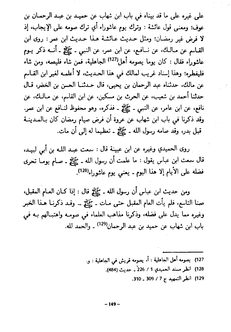عَلَى غَيْرِهِ عَلَى مَا قَدْ بَيَّنَّاهُ فِي بَابِ ابْنِ شِهَابٍ عَنْ حُمَيْدِ بْنِ عَبْدِ الرحمان بْنِ عَوْفٍ وَمَعْنَى قَوْلِ عَائِشَةَ وَتُرِكَ يَوْمُ عَاشُورَاءَ أَيْ تُرِكَ صَوْمُهُ عَلَى الْإِيجَابِ إِذْ لَا فَرْضَ غَيْرُ رَمَضَانَ وَمِثْلُ حَدِيثِ عَائِشَةَ هَذَا حَدِيثُ ابْنِ عُمَرَ رَوَى ابْنُ الْقَاسِمِ عَنْ مَالِكٍ عَنْ نَافِعٍ عَنِ ابْنِ عُمَرَ عَنِ النَّبِيِّ صَلَّى اللَّهُ عَلَيْهِ وَسَلَّمَ أَنَّهُ ذَكَرَ يَوْمَ عَاشُورَاءَ فَقَالَ كَانَ يَوْمًا يَصُومُهُ أَهْلُ الْجَاهِلِيَّةِ فَمَنْ شَاءَ فَلْيَصُمْهُ وَمَنْ شَاءَ فَلْيُفْطِرْهُ وَهَذَا إِسْنَادٌ غَرِيبٌ لِمَالِكٍ فِي هَذَا الْحَدِيثِ لَا أَعْلَمُهُ لِغَيْرِ ابْنِ الْقَاسِمِ عَنْ مالك حدثناه عبد الرحمان بْنُ يَحْيَى قَالَ حَدَّثَنَا الْحَسَنُ بْنُ الْخَضِرِ قال حدثنا أحمد بن شعيب عن الحرث بْنِ مِسْكِينٍ عَنِ ابْنِ الْقَاسِمِ عَنْ مَالِكٍ عَنْ نَافِعٍ عَنِ ابْنِ عَامِرٍ عَنِ النَّبِيِّ صَلَّى اللَّهُ عَلَيْهِ وَسَلَّمَ فَذَكَرَهُ وَهُوَ مَحْفُوظٌ لِنَافِعٍ عَنِ ابْنِ عُمَرَ وَقَدْ ذَكَرْنَا فِي بَابِ ابْنِ شِهَابٍ عَنْ عُرْوَةَ أَنَّ فَرْضَ صِيَامِ رَمَضَانَ كَانَ بِالْمَدِينَةِ قَبْلَ بَدْرٍ وَقَدْ صَامَهُ رَسُولُ اللَّهِ صَلَّى اللَّهُ عَلَيْهِ وَسَلَّمَ تَعْظِيمًا لَهُ إِلَى أَنْ مَاتَ رَوَى الْحُمَيْدِيُّ وَغَيْرُهُ عَنِ ابْنِ عُيَيْنَةَ قَالَ سَمِعْتُ عَبْدَ اللَّهِ بْنَ أَبِي لَبِيدٍ قَالَ سَمِعْتُ ابْنَ عَبَّاسٍ يَقُولُ مَا عَلِمْتُ أَنَّ رَسُولَ اللَّهِ صَلَّى اللَّهُ عَلَيْهِ وَسَلَّمَ صَامَ يَوْمًا تَحَرَّى فَضْلَهُ عَلَى الْأَيَّامِ إِلَّا هَذَا الْيَوْمَ يَعْنِي يَوْمَ عَاشُورَاءَ وَمِنْ حَدِيثِ ابْنِ عَبَّاسٍ أَنَّ رَسُولَ اللَّهِ صَلَّى اللَّهُ عَلَيْهِ وَسَلَّمَ قَالَ إِذَا كَانَ الْعَامُ الْمُقْبِلُ صُمْنَا التَّاسِعَ فَلَمْ يَأْتِ الْعَامُ الْمُقْبِلُ حَتَّى مَاتَ صَلَّى اللَّهُ عَلَيْهِ وَسَلَّمَ وَقَدْ ذَكَرْنَا هَذَا الْخَبَرَ وَغَيْرَهُ مما يدل عل فَضْلِهِ وَذَكَرْنَا مَذَاهِبَ الْعُلَمَاءِ فِي صَوْمِهِ وَاهْتِبَالَهُمْ بِهِ فِي بَابِ ابْنِ شِهَابٍ عَنْ حُمَيْدِ بْنِ عبد الرحمان والحمد لله