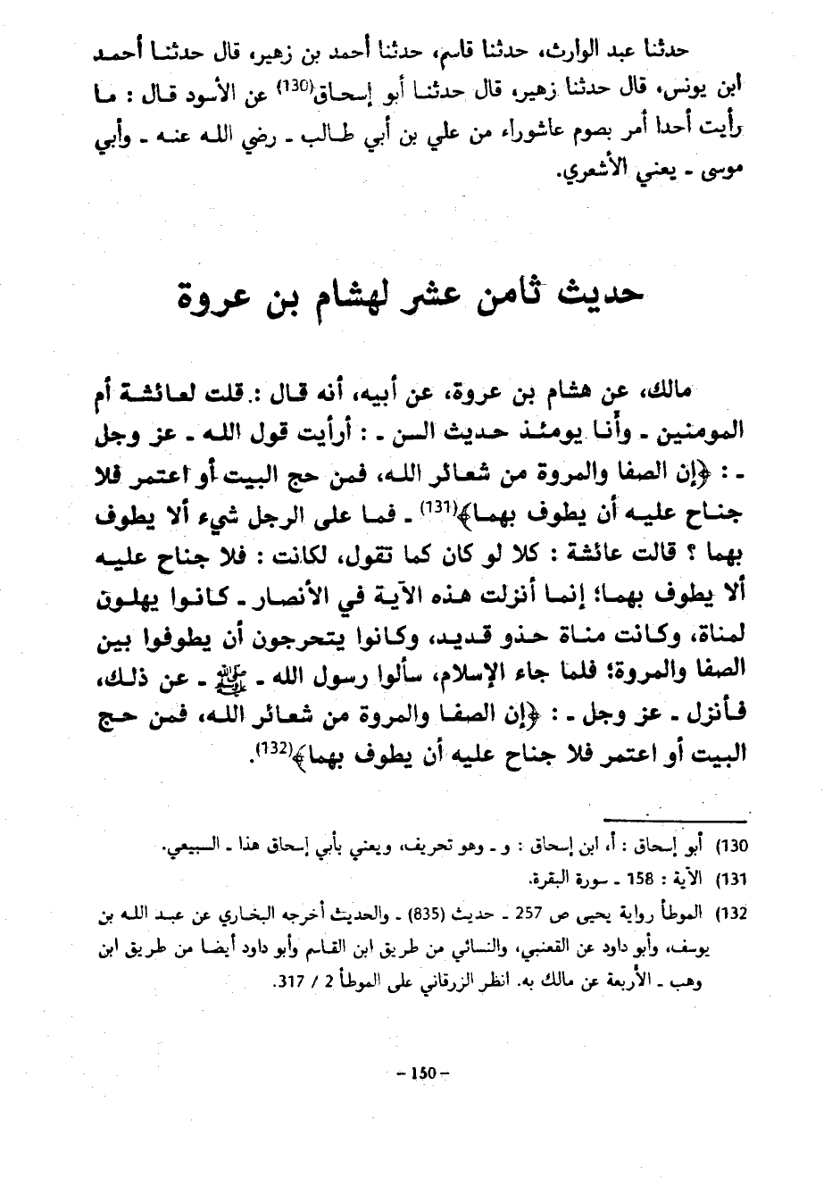 حَدِيثٌ ثَامِنَ عَشَرَ لِهِشَامِ بْنِ عُرْوَةَ مَالِكٍ عَنْ هِشَامِ بْنِ عُرْوَةَ عَنْ أَبِيهِ أنه قال قلت لعائشة أم المؤمنين وَأَنَا يَوْمَئِذٍ حَدِيثُ السِّنِّ أَرَأَيْتِ قَوْلِ اللَّهِ عَزَّ وَجَلَّ إِنَّ الصَّفَا وَالْمَرْوَةَ مِنْ شَعَائِرِ اللَّهِ فَمَنْ حَجَّ الْبَيْتَ أَوِ اعْتَمَرَ فَلَا جُنَاحَ عَلَيْهِ أَنْ يَطَّوَّفَ بِهِمَا فَمَا عَلَى الرَّجُلِ شَيْءٌ أَلَّا يَطَّوَّفَ بِهِمَا قَالَتْ عَائِشَةُ كَلَّا لَوْ كَانَ كَمَا تَقُولُ لَكَانَتْ فَلَا جَنَاحَ عَلَيْهِ أَلَّا يَطَّوَّفَ بِهِمَا إِنَّمَا أُنْزِلَتْ هَذِهِ الْآيَةُ فِي الْأَنْصَارِ كَانُوا يُهِلُّونَ لِمَنَاةَ وَكَانَتْ مَنَاةُ حَذْوَ قُدَيْدٍ وَكَانُوا يَتَحَرَّجُونَ أَنْ يَطُوفُوا بَيْنَ الصَّفَا وَالْمَرْوَةِ فَلَمَّا جَاءَ الْإِسْلَامُ سَأَلُوا رَسُولَ اللَّهِ صَلَّى اللَّهُ عَلَيْهِ وَسَلَّمَ عَنْ ذَلِكَ فَأَنْزَلَ عَزَّ وَجَلَّ إِنَّ الصَّفَا وَالْمَرْوَةَ مِنْ شَعَائِرِ اللَّهِ فَمَنْ حَجَّ الْبَيْتَ أَوِ اعْتَمَرَ فَلَا جُنَاحَ عَلَيْهِ أَنْ يَطَّوَّفَ بهما