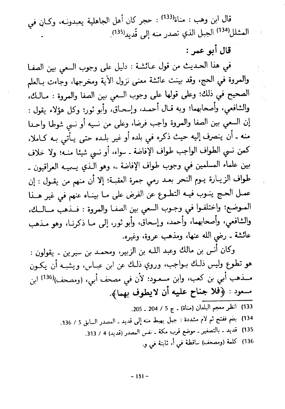 قَالَ ابْنُ وَهْبٍ مَنَاةُ حَجَرٌ كَانَ أَهْلُ الْجَاهِلِيَّةِ يَعْبُدُونَهُ وَكَانَ فِي الْمُشَلَّلِ الْجَبَلِ الَّذِي تَصْدُرُ مِنْهُ إِلَى قُدَيْدٍ قَالَ أَبُو عُمَرَ فِي هَذَا الْحَدِيثِ مِنَ قَوْلِ عَائِشَةَ دَلِيلٌ عَلَى وُجُوبِ السَّعْيِ بَيْنَ الصَّفَا وَالْمَرْوَةِ فِي الْحَجِّ وَقَدْ بَيَّنَتْ عَائِشَةُ مَعْنَى نُزُولِ الْآيَةِ وَمَخْرَجَهَا وَجَاءَتْ بِالْعِلْمِ الصَّحِيحِ فِي ذَلِكَ وَعَلَى قَوْلِهَا عَلَى وُجُوبِ السَّعْيِ بَيْنَ الصَّفَا وَالْمَرْوَةِ مَالِكٌ وَالشَّافِعِيُّ وَأَصْحَابُهُمَا وَبِهِ قَالَ أَحْمَدُ وَإِسْحَاقُ وَأَبُو ثَوْرٍ وَكُلُّ هَؤُلَاءِ يَقُولُ إِنَّ السَّعْيَ بَيْنَ الصَّفَا وَالْمَرْوَةِ وَاجِبٌ فَرْضًا وَعَلَى مَنْ نَسِيَهُ أَوْ نَسِيَ شَوْطًا وَاحِدًا مِنْهُ أَنْ يَنْصَرِفَ إِلَيْهِ حَيْثُ ذَكَرَهُ فِي بَلَدِهِ أَوْ غَيْرِ بَلَدِهِ حَتَّى يَأْتِيَ بِهِ كَامِلًا كَمَنْ نَسِيَ الطَّوَافَ الْوَاجِبَ طَوَافَ الْإِفَاضَةِ سَوَاءٌ أَوْ نَسِيَ شَيْئًا مِنْهُ وَلَا خِلَافَ بَيْنَ عُلَمَاءِ الْمُسْلِمِينَ فِي وُجُوبِ طَوَافِ الْإِفَاضَةِ وَهُوَ الَّذِي يُسَمِّيهِ الْعِرَاقِيُّونَ طَوَافَ الزِّيَارَةِ يَوْمَ النَّحْرِ بَعْدَ رَمْيِ جَمْرَةِ الْعَقَبَةِ إِلَّا أَنَّ مِنْهُمْ مَنْ يَقُولُ إِنَّ عَمَلَ الْحَجِّ يَنُوبُ فِيهِ التَّطَوُّعُ عَنِ الْفَرْضِ عَلَى مَا بَيَّنَّاهُ عَنْهُمْ فِي غَيْرِ هَذَا الْمَوْضِعِ وَاخْتَلَفُوا فِي وُجُوبِ السَّعْيِ بَيْنَ الصَّفَا وَالْمَرْوَةِ فَذَهَبَ مَالِكٌ وَالشَّافِعِيُّ وَأَصْحَابُهُمَا وَأَحْمَدُ وَإِسْحَاقُ وَأَبُو ثَوْرٍ إِلَى مَا ذَكَرْنَا وَهُوَ مَذْهَبُ عَائِشَةَ رَضِيَ اللَّهُ عَنْهَا وَمَذْهَبُ عُرْوَةَ وَغَيْرِهِ وَكَانَ أَنَسُ بْنُ مَالِكٍ وَعَبْدُ اللَّهِ بْنُ الزُّبَيْرِ وَمُحَمَّدُ بْنُ سِيرِينَ يَقُولُونَ هُوَ تَطَوُّعٌ وَلَيْسَ ذَلِكَ بِوَاجِبٍ وَرُوِيَ ذَلِكَ عَنِ ابْنِ عَبَّاسٍ وَيُشْبِهُ أَنْ يَكُونَ مَذْهَبَ أُبَيِّ بْنِ كَعْبٍ وَابْنِ مَسْعُودٍ لِأَنَّ فِي مُصْحَفِ أُبَيٍّ (وَمُصْحَفِ) ابْنِ مَسْعُودٍ فَلَا جُنَاحَ عَلَيْهِ أَنْ لَا يَطَّوَّفَ بِهِمَا