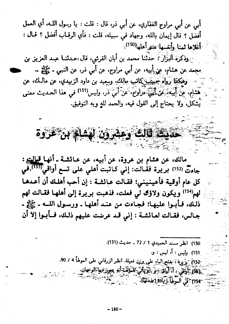 أَبِي عَنْ أَبِي مُرَاوِحٍ الْغِفَارِيِّ عَنْ أَبِي ذَرٍّ قَالَ قُلْتُ يَا رَسُولَ اللَّهِ أَيُّ الْعَمَلِ أَفْضَلُ قَالَ إِيمَانٌ بِاللَّهِ وَجِهَادٌ فِي سَبِيلِهِ قُلْتُ فَأَيُّ الرِّقَابِ أَفْضَلُ قَالَ أَغْلَاهَا ثَمَنًا وَأَنْفَسُهَا عِنْدَ أَهْلِهَا وَذَكَرَهُ الْبَزَّارُ حَدَّثَنَا محمد بن أبان القرشي قَالَ حَدَّثَنَا عَبْدُ الْعَزِيزِ بْنُ مُحَمَّدٍ عَنْ هِشَامٍ عَنْ أَبِيهِ عَنْ أَبِي مُرَاوِحٍ عَنْ أَبِي ذَرٍّ عَنِ النَّبِيِّ صَلَّى اللَّهُ عَلَيْهِ وَسَلَّمَ وَهَكَذَا رَوَاهُ حَبِيبٌ كَاتِبُ مَالِكٍ وَسَعِيدُ بْنُ دَاوُدَ الزُّبَيْدِيُّ عَنْ مَالِكٍ عَنْ هِشَامٍ عَنْ أَبِيهِ عَنْ أبي مرواح عَنْ أَبِي ذَرٍّ وَلَيْسَ فِي هَذَا الْحَدِيثِ مَعْنًى يُشْكِلُ وَلَا يُحْتَاجُ إِلَى الْقَوْلِ فِيهِ وَالْحَمْدُ لِلَّهِ وَبِهِ التَّوْفِيقُ