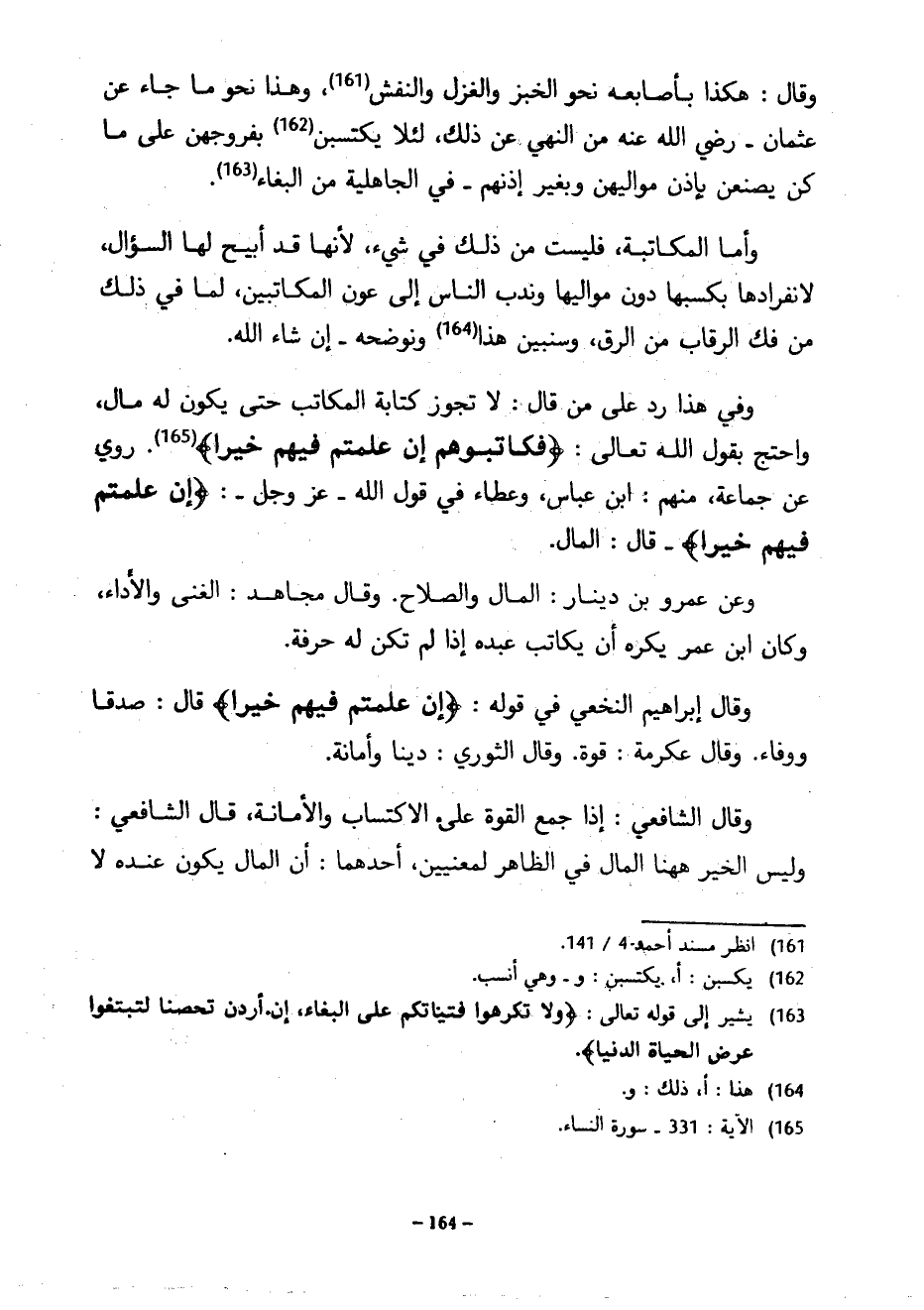 وَقَالَ هَكَذَا بِأَصَابِعِهِ نَحْوَ الْخُبْزِ وَالْغَزْلِ وَالنَّفْشِ وَهَذَا نَحْوُ مَا جَاءَ عَنْ عُثْمَانَ رَضِيَ اللَّهُ عَنْهُ مِنَ النَّهْيِ عَنْ ذَلِكَ لِئَلَّا يَكْتَسِبْنَ بِفُرُوجِهِنَّ عَلَى مَا كُنَّ يَصْنَعْنَ بِإِذْنِ مَوَالِيهِنَّ وَبِغَيْرِ إِذْنِهِمْ فِي الْجَاهِلِيَّةِ مِنَ الْبِغَاءِ وَأَمَّا الْمُكَاتَبَةُ فَلَيْسَتْ مِنْ ذَلِكَ فِي شَيْءٍ لِأَنَّهَا قَدْ أُبِيحَ لَهَا السُّؤَالُ لِانْفِرَادِهَا بِكَسْبِهَا دُونَ مَوَالِيهَا وَنَدَبَ النَّاسَ إِلَى عَوْنِ الْمُكَاتَبِينَ لِمَا فِي ذَلِكَ مِنْ فَكِّ الرِّقَابِ مِنَ الرِّقِّ وَسَنُبَيِّنُ هَذَا وَنُوَضِّحُهُ إِنْ شَاءَ اللَّهُ وَفِي هَذَا رَدٌّ عَلَى مَنْ قَالَ لَا تجوز كتابة المكاتب حتى يكون له ما وَاحْتَجَّ بِقَوْلِ اللَّهِ تَعَالَى فَكَاتِبُوهُمْ إِنْ عَلِمْتُمْ فِيهِمْ خَيْرًا رُوِيَ عَنْ جَمَاعَةٍ مِنْهُمُ ابْنُ عَبَّاسٍ وَعَطَاءٌ فِي قَوْلِ اللَّهِ عَزَّ وَجَلَّ إِنْ عَلِمْتُمْ فِيهِمْ خَيْرًا قَالَ الْمَالُ وَعَنْ عَمْرِو بْنِ دِينَارٍ الْمَالُ وَالصَّلَاحُ وَقَالَ مُجَاهِدٌ الْغِنَى وَالْأَدَاءُ وَكَانَ ابْنُ عُمَرَ يَكْرَهُ أَنْ يُكَاتِبَ عَبْدَهُ إِذَا لَمْ تَكُنْ لَهُ حِرْفَةٌ وَقَالَ إِبْرَاهِيمُ النَّخَعِيُّ فِي قَوْلِهِ إِنْ عَلِمْتُمْ فِيهِمْ خَيْرًا قَالَ صِدْقًا وَوَفَاءً وَقَالَ عِكْرِمَةُ قُوَّةً وَقَالَ الثَّوْرِيُّ دِينًا وَأَمَانَةً وَقَالَ الشَّافِعِيُّ إذا جمع القوة على الاكتساب والأمانة قال الشافعي وليس الخير ههنا الْمَالَ فِي الظَّاهِرِ لِمَعْنَيَيْنِ أَحَدُهُمَا أَنَّ الْمَالَ يَكُونُ عِنْدَهُ لَا