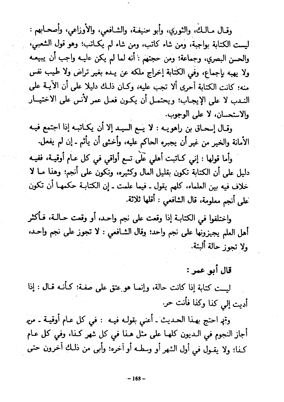 وَقَالَ مَالِكٌ وَالثَّوْرِيُّ وَأَبُو حَنِيفَةَ وَالشَّافِعِيُّ وَالْأَوْزَاعِيُّ وَأَصْحَابُهُمْ لَيْسَتِ الْكِتَابَةُ بِوَاجِبَةٍ وَمَنْ شَاءَ كَاتَبَ وَمَنْ شَاءَ لَمْ يُكَاتِبْ وَهُوَ قَوْلُ الشَّعْبِيِّ وَالْحَسَنِ الْبَصْرِيِّ وَجَمَاعَةٍ وَمِنْ حُجَّتِهِمْ أَنَّهُ لَمَّا لَمْ يَكُنْ عَلَيْهِ وَاجِبٌ أَنْ يَبِيعَهُ وَلَا يَهَبَهُ بِإِجْمَاعٍ وَفِي الْكِتَابَةِ إِخْرَاجُ مِلْكِهِ عَنْ يَدِهِ بِغَيْرِ تَرَاضٍ وَلَا طِيبِ نَفْسٍ مِنْهُ كَانَتِ الْكِتَابَةُ أَحْرَى أَلَّا تَجِبَ عَلَيْهِ وَكَانَ ذَلِكَ دَلِيلًا عَلَى أَنَّ الْآيَةَ عَلَى النَّدْبِ لَا عَلَى الْإِيجَابِ وَيُحْتَمَلُ أَنْ يَكُونَ فِعْلُ عُمَرَ لِأَنَسٍ عَلَى الِاخْتِيَارِ وَالِاسْتِحْسَانِ لَا عَلَى الْوُجُوبِ وَقَالَ إِسْحَاقُ بْنُ رَاهَوَيْهِ لَا يَسَعُ السَّيِّدُ إِلَّا أَنْ يُكَاتِبَهُ إِذَا اجْتَمَعَ فِيهِ الأمانة والخير من غير أن يجبره الحاكم عليه وأخشى أن يأتم إِنْ لَمْ يَفْعَلْ وَأَمَّا قَوْلُهَا إِنِّي كَاتَبْتُ أهلي على تسع أواقي فِي كُلِّ عَامٍ أُوقِيَّةٌ فَفِيهِ دَلِيلٌ عَلَى أَنَّ الْكِتَابَةَ تَكُونُ بِقَلِيلِ الْمَالِ وَكَثِيرِهِ وَتَكُونُ عَلَى أَنْجُمٍ وَهَذَا مَا لَا خِلَافَ فِيهِ بَيْنَ الْعُلَمَاءِ كُلُّهُمْ يَقُولُ فِيمَا عَلِمْتُ إِنَّ الْكِتَابَةَ حُكْمُهَا أَنْ تَكُونَ عَلَى أَنْجُمٍ مَعْلُومَةٍ قَالَ الشَّافِعِيُّ أَقَلُّهَا ثَلَاثَةٌ وَاخْتَلَفُوا فِي الْكِتَابَةِ إِذَا وَقَعَتْ عَلَى نَجْمٍ وَاحِدٍ أَوْ وَقَعَتْ حَالَةً فَأَكْثَرُ أَهْلِ الْعِلْمِ يُجِيزُونَهَا عَلَى نَجْمٍ وَاحِدٍ وَقَالَ الشَّافِعِيُّ لَا تَجُوزُ عَلَى نَجْمٍ وَاحِدٍ وَلَا تَجُوزُ حَالَةً أَلْبَتَّةَ قَالَ أَبُو عُمَرَ لَيْسَتْ كِتَابَةً إِذَا كَانَتْ حَالَةً وَإِنَّمَا هُوَ عِتْقٌ عَلَى صِفَةٍ كَأَنَّهُ قَالَ إِذَا أَدَّيْتَ إِلَيَّ كَذَا وَكَذَا فَأَنْتَ حُرٌّ وَقَدِ احْتَجَّ بِهَذَا الْحَدِيثِ أَعْنِي بِقَوْلِهِ فِيهِ فِي كُلِّ عَامٍ أُوقِيَّةٌ مَنْ أَجَازَ النُّجُومَ فِي الدُّيُونِ كُلِّهَا عَلَى مِثْلِ هَذَا فِي كُلِّ شَهْرٍ كَذَا وَفِي كُلِّ عَامٍ كَذَا وَلَا يَقُولُ فِي أَوَّلِ الشَّهْرِ أَوْ وَسَطِهِ أَوْ آخِرِهِ وَأَبَى مِنْ ذَلِكَ آخَرُونَ حَتَّى