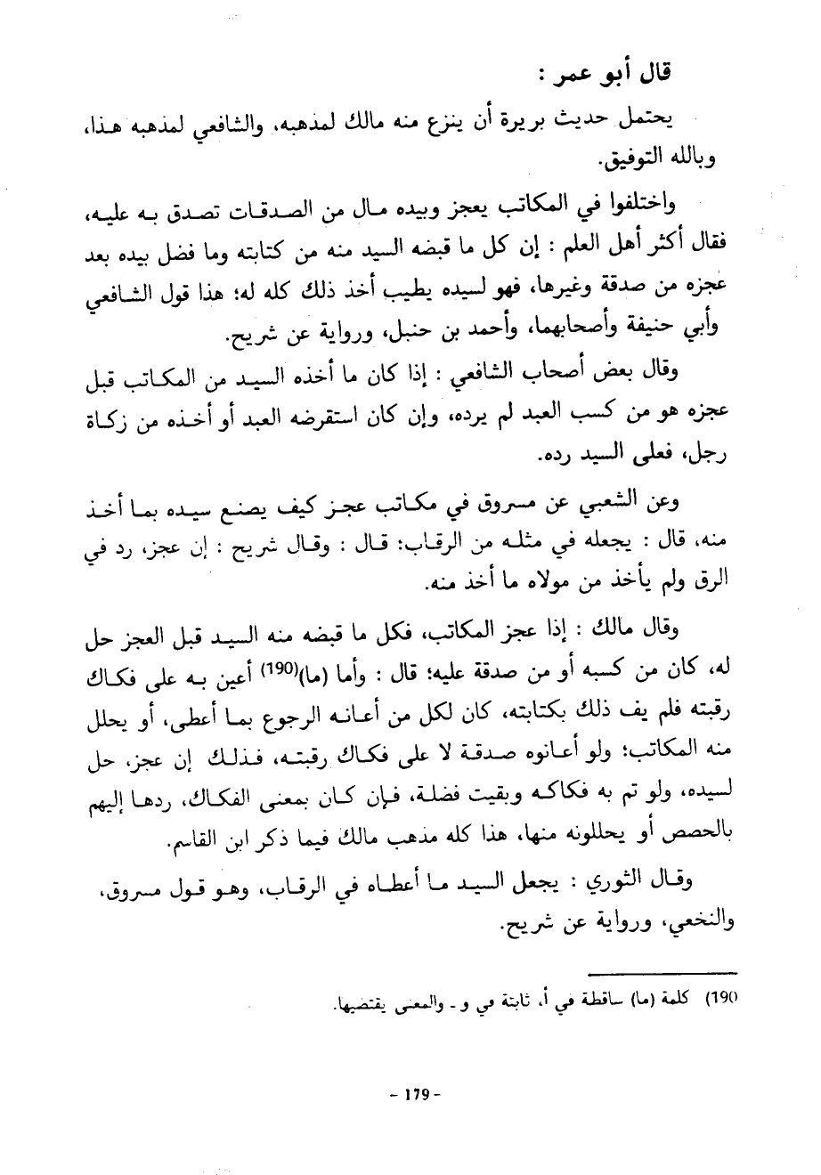 قَالَ أَبُو عُمَرَ يَحْتَمِلُ حَدِيثُ بَرِيرَةَ أَنْ يَنْزِعَ مِنْهُ مَالِكٌ لِمَذْهَبِهِ وَالشَّافِعِيُّ لِمَذْهَبِهِ هَذَا وَبِاللَّهِ التَّوْفِيقُ وَاخْتَلَفُوا فِي الْمُكَاتَبِ يَعْجِزُ وَبِيَدِهِ مَالٌ مِنَ الصَّدَقَاتِ تُصُدِّقَ بِهِ عَلَيْهِ فَقَالَ أَكْثَرُ أَهْلِ الْعِلْمِ إِنَّ كُلَّ مَا قَبَضَهُ السَّيِّدُ مِنْهُ مِنْ كِتَابَتِهِ وَمَا فَضُلَ بِيَدِهِ بَعْدَ عَجْزِهِ مِنْ صَدَقَةٍ وَغَيْرِهَا فَهُوَ لِسَيِّدِهِ يَطِيبُ أَخْذُ ذَلِكَ كُلِّهِ لَهُ هَذَا قَوْلُ الشَّافِعِيِّ وَأَبِي حَنِيفَةَ وَأَصْحَابِهِمَا وَأَحْمَدَ بْنِ حَنْبَلٍ وَرِوَايَةٍ عَنْ شُرَيْحٍ وَقَالَ بَعْضُ أَصْحَابِ الشَّافِعِيِّ إِذَا كَانَ مَا أَخَذَهُ السَّيِّدُ مِنَ الْمُكَاتَبِ قبل عجزه هو من كسب الْعَبْدِ لَمْ يَرُدَّهُ وَإِنْ كَانَ اسْتَقْرَضَهُ الْعَبْدُ أَوْ أَخَذَهُ مِنْ زَكَاةِ رَجُلٍ فَعَلَى السَّيِّدِ رَدُّهُ وَعَنِ الشَّعْبِيِّ عَنْ مَسْرُوقٍ فِي مُكَاتَبٍ عَجَزَ كَيْفَ يَصْنَعُ سَيِّدُهُ بِمَا أَخَذَ مِنْهُ قَالَ يَجْعَلُهُ فِي مِثْلِهِ مِنَ الرِّقَابِ قَالَ وَقَالَ شُرَيْحٌ إِنْ عَجَزَ رُدَّ فِي الرِّقِّ وَلَمْ يَأْخُذْ مِنْ مَوْلَاهُ مَا أَخَذَ مِنْهُ وَقَالَ مَالِكٌ إِذَا عَجَزَ الْمُكَاتَبُ فَكُلُّ مَا قَبَضَهُ مِنْهُ السَّيِّدُ قَبْلَ الْعَجْزِ حَلَّ لَهُ كَانَ مِنْ كَسْبِهِ أَوْ مِنْ صَدَقَةٍ عَلَيْهِ قَالَ وَأَمَّا (مَا) أُعِينُ بِهِ عَلَى فِكَاكِ رَقَبَتِهِ فَلَمْ يَفِ ذَلِكَ بِكِتَابَتِهِ كَانَ لِكُلِّ مَنْ أَعَانَهُ الرُّجُوعُ بِمَا أَعْطَى أَوْ يُحَلَّلُ مِنْهُ الْمُكَاتَبُ وَلَوْ أَعَانُوهُ صَدَقَةً لَا عَلَى فِكَاكِ رَقَبَتِهِ فَذَلِكَ إِنْ عَجَزَ حَلَّ لِسَيِّدِهِ وَلَوْ تَمَّ بِهِ فِكَاكُهُ وَبَقِيَتْ فَضْلَةٌ فَإِنْ كَانَ بِمَعْنَى الْفِكَاكِ رَدَّهَا إِلَيْهِمْ بِالْحِصَصِ أَوْ يُحَلِّلُونَهُ مِنْهَا هَذَا كُلُّهُ مَذْهَبُ مَالِكٍ فِيمَا ذَكَرَ ابْنُ الْقَاسِمِ وَقَالَ الثَّوْرِيُّ يَجْعَلُ السَّيِّدُ مَا أَعْطَاهُ فِي الرِّقَابِ وَهُوَ قَوْلُ مَسْرُوقٍ وَالنَّخَعِيِّ وَرِوَايَةٍ عَنْ شُرَيْحٍ