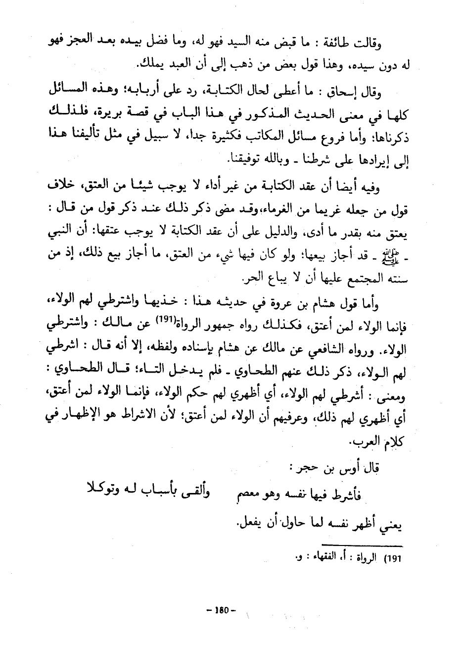 وَقَالَتْ طَائِفَةٌ مَا قَبَضَ مِنْهُ السَّيِّدُ فَهُوَ لَهُ وَمَا فَضَلَ بِيَدِهِ بَعْدَ الْعَجْزِ فَهُوَ لَهُ دُونَ سَيِّدِهِ وَهَذَا قَوْلُ بَعْضِ مَنْ ذَهَبَ إِلَى أَنَّ الْعَبْدَ يَمْلِكُ وَقَالَ إِسْحَاقُ مَا أَعْطَى لِحَالِ الْكِتَابَةِ رَدَّ عَلَى أَرْبَابِهِ وَهَذِهِ الْمَسَائِلُ كُلُّهَا فِي مَعْنَى الْحَدِيثِ الْمَذْكُورِ فِي هَذَا الْبَابِ فِي قِصَّةِ بَرِيرَةَ فَلِذَلِكَ ذَكَرْنَاهَا وَأَمَّا فُرُوعُ مَسَائِلِ الْمُكَاتَبِ فَكَثِيرَةٌ جِدًّا لَا سَبِيلَ فِي مِثْلِ تَأْلِيفِنَا هَذَا إِلَى إِيرَادِهَا عَلَى شَرْطِنَا وَبِاللَّهِ تَوْفِيقُنَا وَفِيهِ أَيْضًا أن عقد الكتابة من غير أَدَاءٌ لَا يُوجِبُ شَيْئًا مِنَ الْعِتْقِ خِلَافَ قَوْلِ مَنْ جَعَلَهُ غَرِيمًا مِنَ الْغُرَمَاءِ وَقَدْ مَضَى ذِكْرُ ذَلِكَ عِنْدَ ذِكْرِ قَوْلِ مَنْ قَالَ يُعْتَقُ مِنْهُ بِقَدْرِ مَا أَدَّى وَالدَّلِيلُ عَلَى أَنَّ عَقْدَ الْكِتَابَةِ لَا يُوجِبُ عِتْقَهَا أَنَّ النَّبِيَّ صَلَّى اللَّهُ عَلَيْهِ وَسَلَّمَ قَدْ أَجَازَ بَيْعَهَا وَلَوْ كَانَ فِيهَا شَيْءٌ مِنَ الْعِتْقِ مَا أَجَازَ بَيْعَ ذَلِكَ إِذْ مِنْ سُنَّتِهِ الْمُجْتَمَعِ عَلَيْهَا أَنْ لَا يُبَاعَ الْحُرُّ وَأَمَّا قَوْلُ هِشَامِ بْنِ عُرْوَةَ فِي حَدِيثِهِ هَذَا خُذِيهَا وَاشْتَرِطِي لَهُمُ الْوَلَاءَ فَإِنَّمَا الْوَلَاءُ لِمَنْ أَعْتَقَ فَكَذَلِكَ رَوَاهُ جُمْهُورُ الرُّوَاةِ عَنْ مَالِكٍ وَاشْتَرِطِي الْوَلَاءَ وَرَوَاهُ الشَّافِعِيُّ عَنْ مَالِكٍ عَنْ هِشَامٍ بِإِسْنَادِهِ وَلَفْظِهِ إِلَّا أَنَّهُ قَالَ أَشْرِطِي لَهُمُ الْوَلَاءَ ذَكَرَ ذَلِكَ عَنْهُمُ الطَّحَاوِيُّ فَلَمْ يُدْخِلِ التَّاءَ قَالَ الطَّحَاوِيُّ وَمَعْنَى أَشْرِطِي لَهُمُ الْوَلَاءَ أَيْ أَظْهِرِي لَهُمْ حُكْمَ الْوَلَاءِ فَإِنَّمَا الْوَلَاءُ لِمَنْ أَعْتَقَ أَيْ أَظْهِرِي لَهُمْ ذَلِكَ وَعَرِّفِيهِمْ أَنَّ الْوَلَاءَ لِمَنْ أَعْتَقَ لِأَنَّ الْإِشْرَاطَ هُوَ الْإِظْهَارُ فِي كَلَامِ الْعَرَبِ قَالَ أوس بن حَجَرٍ ... فَأَشْرَطَ فِيهَا نَفْسَهُ وَهُوَ مُعْصِمٌ ... ... وَأَلْقَى بِأَسْبَابٍ لَهُ وَتَوَكَّلَا ... يَعْنِي أَظْهَرَ نَفْسَهُ لَمَّا حَاوَلَ أَنْ يَفْعَلَ