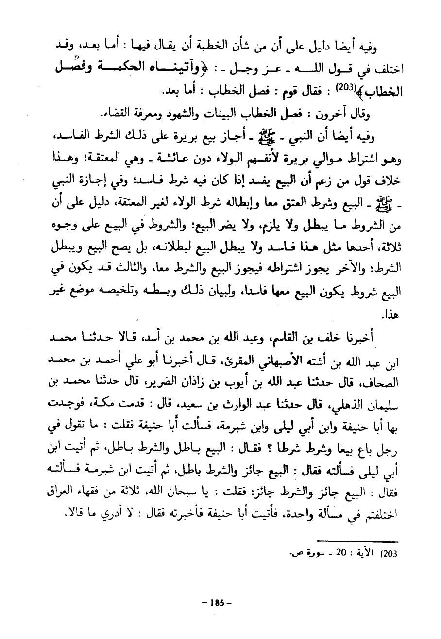 وَفِيهِ أَيْضًا دَلِيلٌ عَلَى أَنَّ مِنْ شَأْنِ الْخُطْبَةِ أَنْ يُقَالَ فِيهَا أَمَّا بَعْدُ وَقَدِ اخْتُلِفَ فِي قَوْلِ اللَّهِ عَزَّ وَجَلَّ وَآتَيْنَاهُ الْحِكْمَةَ وَفَصْلَ الْخِطَابِ فَقَالَ قَوْمٌ فَصْلُ الْخِطَابِ أَمَّا بَعْدُ وَقَالَ آخَرُونَ فَصْلُ الْخِطَابِ الْبَيِّنَاتُ وَالشُّهُودُ وَمَعْرِفَةُ الْقَضَاءِ وَفِيهِ أَيْضًا أَنَّ النَّبِيَّ صَلَّى اللَّهُ عَلَيْهِ وَسَلَّمَ أَجَازَ بَيْعَ بَرِيرَةَ عَلَى ذَلِكَ الشَّرْطِ الْفَاسِدِ وَهُوَ اشْتِرَاطُ مَوَالِي بَرِيرَةَ لِأَنْفُسِهِمُ الْوَلَاءَ دُونَ عَائِشَةَ وَهِيَ الْمُعْتِقَةُ وَهَذَا خِلَافُ قَوْلِ مَنْ زَعَمَ أَنَّ الْبَيْعَ يَفْسُدُ إِذَا كَانَ فِيهِ شَرْطٌ فَاسِدٌ وَفِي إِجَازَةِ النَّبِيِّ صَلَّى اللَّهُ عَلَيْهِ وَسَلَّمَ الْبَيْعَ وَشَرْطَ الْعِتْقِ مَعًا وَإِبْطَالِهِ شَرْطَ الْوَلَاءِ لِغَيْرِ الْمُعْتِقَةِ دَلِيلٌ عَلَى أَنَّ مِنَ الشُّرُوطِ مَا يَبْطُلُ وَلَا يَلْزَمُ وَلَا يَضُرُّ الْبَيْعَ وَالشُّرُوطُ فِي الْبَيْعِ عَلَى وُجُوهٍ ثَلَاثَةٍ أَحَدُهَا مِثْلُ هَذَا فَاسِدٌ وَلَا يَبْطُلُ الْبَيْعُ لِبُطْلَانِهِ بَلْ يَصِحُّ الْبَيْعُ وَيَبْطُلُ الشَّرْطُ وَالْآخَرُ يَجُوزُ اشْتِرَاطُهُ فَيَجُوزُ الْبَيْعُ وَالشَّرْطُ مَعًا وَالثَّالِثُ قَدْ يَكُونُ فِي الْبَيْعِ شُرُوطٌ يَكُونُ الْبَيْعُ مَعَهَا فَاسِدًا وَلِبَيَانِ ذَلِكَ وَبَسْطِهِ وَتَلْخِيصِهِ مَوْضِعٌ غَيْرُ هَذَا أَخْبَرَنَا خَلَفُ بْنُ الْقَاسِمِ وَعَبْدُ اللَّهِ بْنُ محمد بن اسد قالا حدثنا محمد ابن عَبْدِ اللَّهِ بْنِ أَشْتَهْ الْأَصْبِهَانِيُّ الْمُقْرِئُ قَالَ أَخْبَرَنَا أَبُو عَلِيٍّ أَحْمَدُ بْنُ مُحَمَّدٍ الصَّحَّافُ قَالَ حَدَّثَنَا عَبْدُ اللَّهِ بْنُ أَيُّوبَ بْنِ زَاذَانَ الضَّرِيرُ قَالَ حَدَّثَنَا مُحَمَّدُ بْنُ سُلَيْمَانَ الذُّهْلِيُّ قَالَ حَدَّثَنَا عَبْدُ الْوَارِثِ بْنُ سَعِيدٍ قَالَ قَدِمْتُ مَكَّةَ فَوَجَدْتُ بِهَا أَبَا حَنِيفَةَ وَابْنَ أَبِي لَيْلَى وَابْنَ شُبْرُمَةَ فَسَأَلْتُ أَبَا حَنِيفَةَ فَقُلْتُ مَا تَقُولُ فِي رَجُلٍ بَاعَ بَيْعًا وَشَرَطَ شَرْطًا فَقَالَ الْبَيْعُ بَاطِلٌ وَالشَّرْطُ بَاطِلٌ ثُمَّ أَتَيْتُ ابْنَ أَبِي لَيْلَى فَسَأَلْتُهُ فَقَالَ الْبَيْعُ جَائِزٌ وَالشَّرْطُ بَاطِلٌ ثُمَّ أَتَيْتُ ابْنَ شُبْرُمَةَ فَسَأَلْتُهُ فَقَالَ الْبَيْعُ جَائِزٌ وَالشَّرْطُ جَائِزٌ فَقُلْتُ يَا سُبْحَانَ اللَّهِ ثَلَاثَةٌ مِنْ فُقَهَاءِ الْعِرَاقِ اخْتَلَفْتُمْ فِي مَسْأَلَةٍ وَاحِدَةٍ فَأَتَيْتُ أَبَا حَنِيفَةَ فَأَخْبَرْتُهُ فَقَالَ لَا أَدْرِي مَا قالا