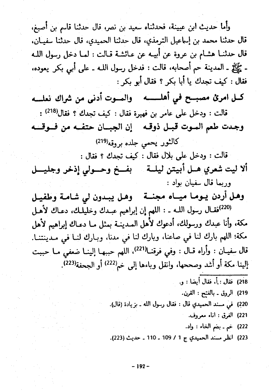 وَأَمَّا حَدِيثُ ابْنِ عُيَيْنَةَ فَحَدَّثَنَاهُ سَعِيدُ بْنُ نَصْرٍ قَالَ حَدَّثَنَا قَاسِمُ بْنُ أَصْبَغَ قَالَ حَدَّثَنَا مُحَمَّدُ بْنُ إِسْمَاعِيلَ التِّرْمِذِيُّ قَالَ حَدَّثَنَا الْحُمَيْدِيُّ قَالَ حَدَّثَنَا سُفْيَانُ قَالَ حَدَّثَنَا هِشَامُ بْنُ عُرْوَةَ عَنْ أَبِيهِ عَنْ عائشة قالت لَمَّا دَخَلَ رَسُولُ اللَّهِ صَلَّى اللَّهُ عَلَيْهِ وَسَلَّمَ الْمَدِينَةَ حُمَّ أَصْحَابُهُ قَالَتْ فَدَخَلَ رَسُولُ اللَّهِ عَلَى أَبِي بَكْرٍ يَعُودُهُ فَقَالَ كَيْفَ تَجِدُكَ يَا أَبَا بَكْرٍ فَقَالَ أَبُو بَكْرٍ ... كُلُّ امْرِئٍ مُصْبَّحٌ فِي أَهْلِهِ ... ... وَالْمَوْتُ أَدْنَى مِنْ شِرَاكِ نَعْلِهِ ... قَالَتْ وَدَخَلَ عَلَى عَامِرِ بْنِ فُهَيْرَةَ فَقَالَ كَيْفَ تَجِدُكَ فَقَالَ ... وَجَدْتُ طَعْمَ الْمَوْتِ قَبْلَ ذَوْقِهِ ... إِنَّ الْجَبَانَ حَتْفُهُ مِنْ فَوْقِهِ ... كَالثَّوْرِ يَحْمِي جِلْدَهُ بِرَوْقِهِ ... قَالَتْ وَدَخَلَ عَلَى بِلَالٍ فَقَالَ كَيْفَ تَجِدُكَ فَقَالَ ... أَلَا لَيْتَ شِعْرِي هَلْ أَبِيتَنَّ لَيْلَةً ... بِفَخٍّ وَحَوْلِي إِذْخِرٌ وَجَلِيلُ ... وَرُبَّمَا قَالَ سُفْيَانُ بِوَادٍ ... وَهَلْ أَرِدَنْ يَوْمًا مِيَاهَ مَجَنَّةٍ ... وَهَلْ يَبْدُوَنْ لِي شَامَةٌ وَطَفِيلُ ... فَقَالَ رَسُولُ اللَّهِ اللَّهُمَّ إن إبراهيم عبد وَخَلِيلَكَ دَعَاكَ لِأَهْلِ مَكَّةَ وَأَنَا عَبْدُكَ وَرَسُولُكَ أَدْعُوكَ لِأَهْلِ الْمَدِينَةِ بِمِثْلِ مَا دَعَاكَ إِبْرَاهِيمُ لأهل مكة الله بَارِكْ لَنَا فِي صَاعِنَا وَبَارِكْ لَنَا فِي مُدِّنَا وَبَارِكْ لَنَا فِي مَدِينَتِنَا قَالَ سُفْيَانُ وَأَرَاهُ قَالَ وَفِي فَرَقِنَا اللَّهُمَّ حَبِّبْهَا إِلَيْنَا ضِعْفَيْ مَا حَبَّبَتْ إِلَيْنَا مَكَّةَ أَوْ أَشَدَّ وَصَحِّحْهَا وَانْقُلْ وَبَاءَهَا إِلَى خُمٍّ أَوِ الْجُحْفَةِ