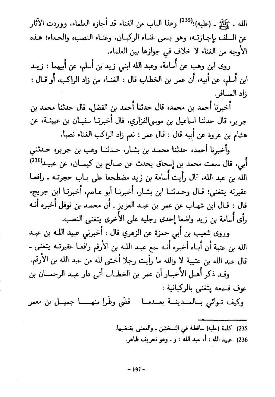 اللَّهِ صَلَّى اللَّهُ عَلَيْهِ وَسَلَّمَ (عَلَيْهِ) وَهَذَا الْبَابُ مِنَ الْغِنَاءِ قَدْ أَجَازَهُ الْعُلَمَاءُ وَوَرَدَتِ الْآثَارُ عَنِ السَّلَفِ بِإِجَازَتِهِ وَهُوَ يُسَمَّى غِنَاءَ الركبان وغناء النصب والحذاء هَذِهِ الْأَوْجَهُ مِنَ الْغِنَاءِ لَا خِلَافَ فِي جَوَازِهَا بَيْنَ الْعُلَمَاءِ رَوَى ابْنُ وَهْبٍ عَنْ أُسَامَةَ وَعَبْدِ اللَّهِ ابْنَيْ زَيْدِ بْنِ أَسْلَمَ عن أبيهما زيد ابن أَسْلَمَ عَنْ أَبِيهِ أَنَّ عُمَرَ بْنَ الْخَطَّابِ قَالَ الْغِنَاءُ مِنْ زَادِ الرَّاكِبِ أَوْ قَالَ زَادِ الْمُسَافِرِ أَخْبَرَنَا أَحْمَدُ بْنُ مُحَمَّدٍ قَالَ حَدَّثَنَا أَحْمَدُ بْنُ الْفَضْلِ قَالَ حَدَّثَنَا مُحَمَّدُ بْنُ جَرِيرٍ قَالَ حَدَّثَنَا إِسْمَاعِيلُ بْنُ مُوسَى الْفَزَارِيُّ قَالَ أَخْبَرَنَا سُفْيَانُ بْنُ عُيَيْنَةَ عَنْ هِشَامِ بْنِ عُرْوَةَ عَنْ أَبِيهِ قَالَ قَالَ عُمَرُ نَعَمْ زَادُ الرَّاكِبِ الْغِنَاءُ نَصْبًا وَأَخْبَرَنَا أَحْمَدُ حَدَّثَنَا مُحَمَّدُ بْنُ بَشَّارٍ حَدَّثَنَا وَهْبُ بْنُ جَرِيرٍ حَدَّثَنِي أَبِي قَالَ سَمِعْتُ مُحَمَّدَ بْنَ إِسْحَاقَ يُحَدِّثُ عَنْ صَالِحِ بْنِ كَيْسَانَ عَنْ عُبَيْدِ اللَّهِ بْنِ عَبْدِ اللَّهِ قَالَ رَأَيْتُ أُسَامَةَ بْنَ زَيْدٍ مُضْطَجِعًا عَلَى بَابِ حُجْرَتِهِ رَافِعًا عَقِيرَتَهُ يَتَغَنَّى قَالَ وَحَدَّثَنَا ابْنُ بَشَّارٍ أَخْبَرَنَا أَبُو عَاصِمٍ أَخْبَرَنَا ابْنُ جُرَيْجٍ قَالَ قَالَ ابْنِ شِهَابٍ عَنْ عُمَرُ بْنُ عَبْدِ الْعَزِيزِ أَنَّ مُحَمَّدَ بْنَ نَوْفَلٍ أَخْبَرَهُ أَنَّهُ رَأَى أُسَامَةَ بْنَ زَيْدِ وَاضِعًا إِحْدَى رِجْلَيْهِ عَلَى الْأُخْرَى يَتَغَنَّى النَّصْبَ وَرَوَى شُعَيْبُ بْنُ أَبِي حَمْزَةَ عَنِ الزُّهْرِيِّ قَالَ أَخْبَرَنِي عُبَيْدُ اللَّهِ بْنُ عَبْدِ اللَّهِ بْنِ عُتْبَةَ أَنَّ أَبَاهُ أَخْبَرَهُ أَنَّهُ سَمِعَ عَبْدَ اللَّهِ بْنَ الْأَرْقَمِ رَافِعًا عَقِيرَتَهُ يَتَغَنَّى قَالَ عَبْدُ اللَّهِ بْنُ عُتَيْبَةَ لَا وَاللَّهِ مَا رَأَيْتُ رَجُلًا أَخْشَى لِلَّهِ مِنْ عَبْدِ اللَّهِ بْنِ الْأَرْقَمِ وَقَدْ ذَكَرَ أَهْلُ الْأَخْبَارِ أَنَّ عُمَرَ بن الخطاب أتى دار عبد الرحمان بن عوف فسمعه يتغنى بالركبانية ... وكيف توائي بِالْمَدِينَةِ بَعْدَمَا ... ... قَضَى وَطَرًا مِنْهَا جَمِيلُ بْنُ معمر