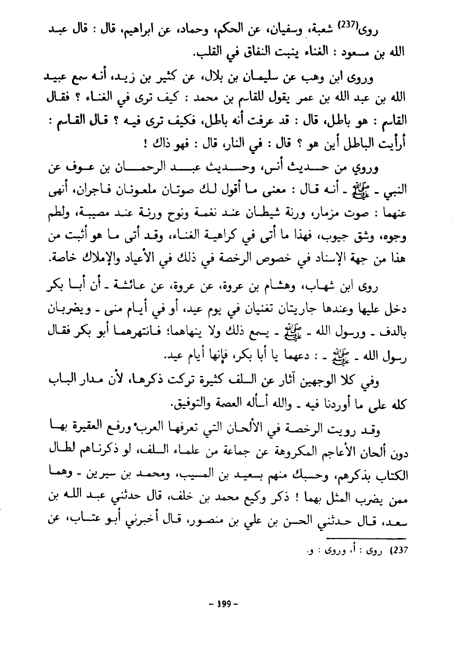 رَوَى شُعْبَةُ وَسُفْيَانُ عَنِ الْحَكَمِ وَحَمَّادٍ عَنْ إِبْرَاهِيمَ قَالَ قَالَ عَبْدُ اللَّهِ بْنُ مَسْعُودٍ الْغِنَاءُ يُنْبِتُ النِّفَاقَ فِي الْقَلْبِ وَرَوَى ابْنُ وَهْبٍ عَنْ سُلَيْمَانُ بْنُ بِلَالٍ عَنْ كَثِيرِ بْنِ زَيْدٍ أَنَّهُ سَمِعَ عُبَيْدِ اللَّهِ بْنِ عَبْدِ اللَّهِ بْنِ عُمَرَ يَقُولُ لِلْقَاسِمِ بْنِ مُحَمَّدٍ كَيْفَ تَرَى فِي الْغِنَاءِ فَقَالَ الْقَاسِمُ هُوَ بَاطِلٌ قَالَ قَدْ عَرَفْتُ أَنَّهُ بَاطِلٌ فَكَيْفَ تَرَى فِيهِ قَالَ الْقَاسِمُ أَرَأَيْتَ الْبَاطِلَ أَيْنَ هُوَ قَالَ فِي النَّارِ قَالَ فَهُوَ ذَاكَ وَرُوِيَ مِنْ حَدِيثِ أَنَسٍ وَحَدِيثِ عَبْدِ الرحمان بْنِ عَوْفٍ عَنِ النَّبِيِّ صَلَّى اللَّهُ عَلَيْهِ وَسَلَّمَ أَنَّهُ قَالَ مَعْنَى مَا أَقُولُ لَكَ صوتان ملعونان فاجران أنهى عنهما صوت مِزْمَارٌ وَرَنَّةُ شَيْطَانٍ عِنْدَ نَغَمَةٍ وَنَوْحٍ وَرَنَّةٌ عِنْدَ مُصِيبَةٍ وَلَطْمُ وَجُوهٍ وَشَقُّ جُيُوبٍ فَهَذَا مَا أَتَى فِي كَرَاهِيَةِ الْغِنَاءِ وَقَدْ أَتَى مَا هُوَ أَثْبَتُ مِنْ هَذَا مِنْ جِهَةِ الْإِسْنَادِ فِي خُصُوصِ الرُّخْصَةِ فِي ذَلِكَ فِي الْأَعْيَادِ وَالْإِمْلَاكِ خَاصَّةً رَوَى ابْنُ شِهَابٍ وَهِشَامُ بْنُ عُرْوَةَ عَنْ عُرْوَةَ عَنْ عَائِشَةَ أَنَّ أَبَا بَكْرٍ دَخَلَ عَلَيْهَا وَعِنْدَهَا جَارِيَتَانِ تُغَنِّيَانِ فِي يَوْمِ عِيدٍ أَوْ فِي أَيَّامِ مِنًى وَيَضْرِبَانِ بِالدُّفِّ وَرَسُولُ اللَّهِ صَلَّى اللَّهُ عَلَيْهِ وَسَلَّمَ يَسْمَعُ ذَلِكَ وَلَا يَنْهَاهُمَا فَانْتَهَرَهُمَا أَبُو بَكْرٍ فَقَالَ رَسُولُ اللَّهِ صَلَّى اللَّهُ عَلَيْهِ وَسَلَّمَ دَعْهُمَا يَا أَبَا بَكْرٍ فَإِنَّهَا أَيَّامُ عِيدٍ وَفِي كِلَا الْوَجْهَيْنِ آثَارٌ عَنِ السَّلَفِ كَثِيرَةٌ تَرَكْتُ ذِكْرَهَا لِأَنَّ مَدَارَ الْبَابِ كُلَّهُ عَلَى مَا أَوْرَدْنَا فِيهِ وَاللَّهَ أَسْأَلُهُ الْعِصْمَةَ وَالتَّوْفِيقَ وَقَدْ رَوَيْتُ الرُّخْصَةَ فِي الْأَلْحَانِ الَّتِي تَعْرِفُهَا الْعَرَبُ وَرَفْعَ الْعَقِيرَةِ بِهَا دُونَ أَلْحَانِ الْأَعَاجِمِ الْمَكْرُوهَةِ عَنْ جَمَاعَةٍ مِنْ عُلَمَاءِ السَّلَفِ لَوْ ذَكَرْنَاهُمْ لَطَالَ الْكِتَابُ بِذِكْرِهِمْ وَحَسْبُكَ مِنْهُمْ بِسَعِيدِ بْنِ الْمُسَيَّبِ وَمُحَمَّدِ بْنِ سِيرِينَ وَهُمَا مِمَّنْ يُضْرَبُ الْمَثَلُ بِهِمَا ذَكَرَ وَكِيعٌ مُحَمَّدُ بْنُ خَلَفٍ قَالَ حَدَّثَنِي عَبْدُ اللَّهِ بْنُ سَعْدٍ قَالَ حَدَّثَنِي الْحَسَنُ بْنُ عَلِيِّ بْنِ مَنْصُورٍ قَالَ أَخْبَرَنِي أَبُو عَتَّابٍ عَنْ