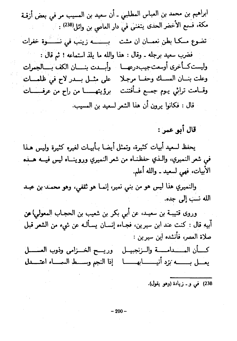 إِبْرَاهِيمَ بْنِ مُحَمَّدِ بْنِ الْعَبَّاسِ الْمُطَّلِبِيِّ أَنَّ سَعِيدَ بْنَ الْمُسَيَّبِ مَرَّ فِي بَعْضِ أَزِقَّةِ مَكَّةَ فَسَمِعَ الْأَخْضَرَ الْحَدِيَّ يَتَغَنَّى فِي دَارِ الْعَاصِي بْنِ وَائِلٍ ... تَضَوَّعَ مِسْكًا بَطْنُ نَعْمَانَ أَنْ مَشَتْ ... بِهِ زَيْنَبُ فِي نِسْوَةٍ خَفِرَاتِ ... فَضَرَبَ سَعِيدٌ بِرِجْلِهِ وَقَالَ هَذَا وَاللَّهِ مَا يَلَذُّ اسْتِمَاعُهُ ثُمَّ قَالَ ... وَلَيْسَتْ كَأُخْرَى أَوْسَعَتْ جَيْبَ دِرْعِهَا وَأَبْدَتْ بَنَانَ الْكَفِّ بِالْجَمَرَاتِ ... ... ... وَعَلَتْ بَنَانَ الْمِسْكِ وَحَفَا مُرَجَّلًا ... عَلَى مِثْلِ بَدْرٍ لَاحَ فِي ظُلُمَاتِ ... ... وَقَامَتْ تَرَائِي يَوْمَ جَمْعٍ فَأَفْتَنَتْ ... ... بِرُؤْيَتِهَا مَنْ رَاحَ مِنْ عَرَفَاتِ ... قَالَ فَكَانُوا يَرَوْنَ أَنَّ هَذَا الشِّعْرَ لِسَعِيدِ بْنِ الْمُسَيَّبِ قَالَ أَبُو عُمَرَ يُحْفَظُ لِسَعِيدٍ أَبْيَاتٌ كَثِيرَةٌ وَتَمَثَّلَ أَيْضًا بِأَبْيَاتٍ لِغَيْرِهِ كَثِيرَةٍ وَلَيْسَ هَذَا فِي شِعْرِ النُّمَيْرِيِّ وَالَّذِي حَفِظْنَاهُ مِنْ شَعْرِ النُّمَيْرِيِّ وَرُوِّينَاهُ لَيْسَ فِيهِ هَذِهِ الْأَبْيَاتُ فَهِيَ لِسَعِيدٍ وَاللَّهُ أَعْلَمُ وَالنُّمَيْرِيُّ هَذَا لَيْسَ هُوَ مِنْ بَنِي نُمَيْرٍ إِنَّمَا هُوَ ثَقَفِيٌّ وَهُوَ مُحَمَّدُ بْنُ عَبْدِ اللَّهِ نُسِبَ إِلَى جَدِّهِ وَرَوَى قُتَيْبَةُ بْنُ سَعِيدٍ عَنْ أَبِي بَكْرِ بْنِ شُعَيْبِ بْنِ الْحَجَّابِ الْمِعْوَلِيِّ عَنْ أَبِيهِ قَالَ كُنْتُ عِنْدَ ابْنِ سِيرِينَ فَجَاءَهُ إِنْسَانٌ يَسْأَلُهُ عَنْ شَيْءٍ مِنَ الشِّعْرِ قَبْلَ صَلَاةِ الْعَصْرِ فَأَنْشَدَهُ ابْنُ سِيرِينَ ... كَأَنَّ الْمُدَامَةَ وَالزَّنْجَبِيلْ ... وَرِيحَ الْخُزَامَى وَذَوْبَ الْعَسَلْ ... ... ... يَعِلُّ بِهِ بَرْدُ أَنْيَابِهَا ... إِذَا النَّجْمُ وَسَطَ الْمَسَاءِ اعتدل