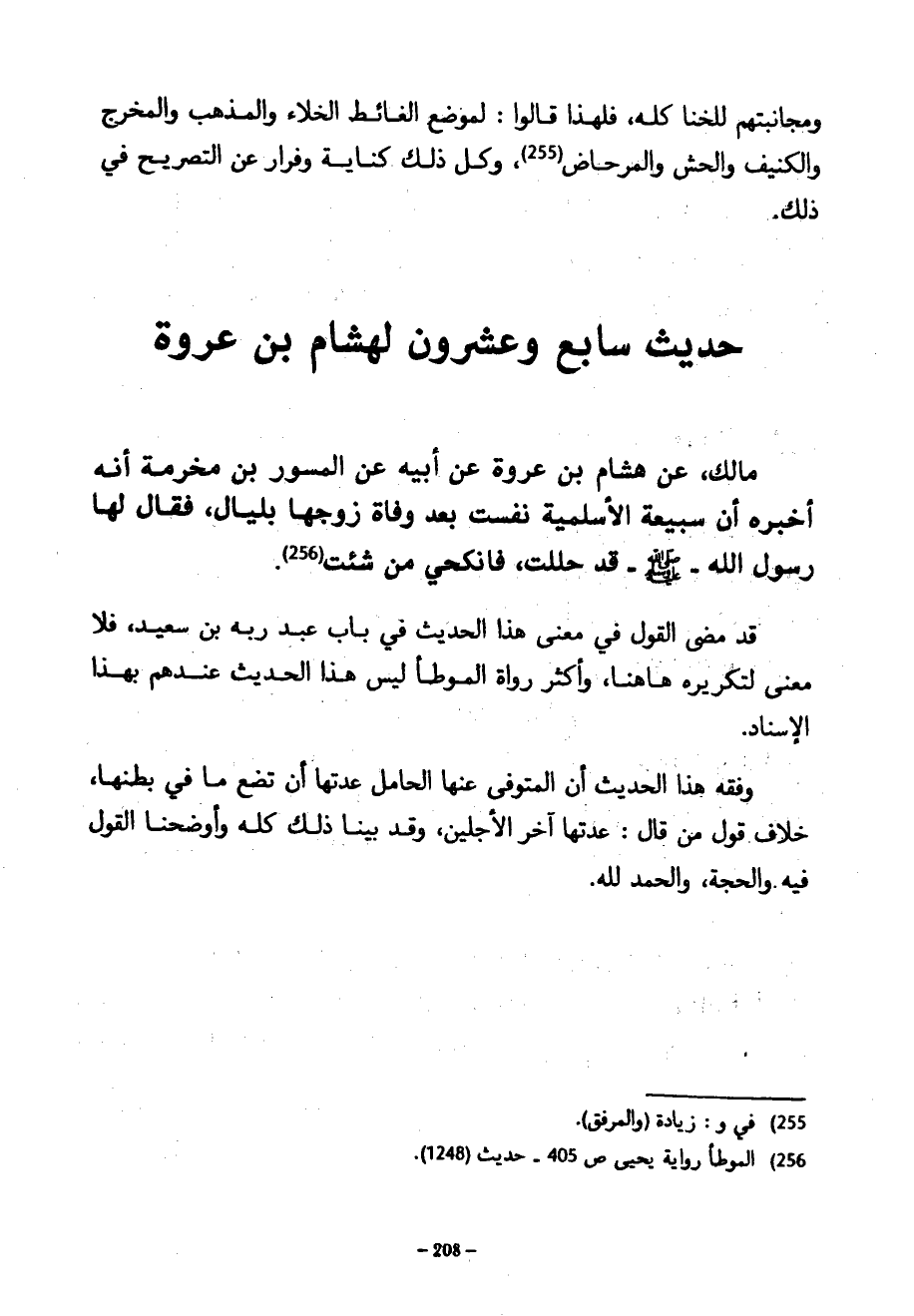 حَدِيثٌ سَابِعٌ وَعِشْرُونَ لِهِشَامِ بْنِ عُرْوَةَ مَالِكٍ عَنْ هِشَامِ بْنِ عُرْوَةَ عَنْ أَبِيهِ عن المسور بن مخرمة أَنَّهُ أَخْبَرَهُ أَنَّ سُبَيْعَةَ الْأَسْلَمِيَّةَ نَفَسَتْ بَعْدَ وَفَاةِ زَوْجِهَا بِلَيَالٍ فَقَالَ لَهَا رَسُولُ اللَّهِ صَلَّى اللَّهُ عَلَيْهِ وَسَلَّمَ قَدْ حَلَلْتِ فَانْكِحِي مَنْ شِئْتِ قَدْ مَضَى الْقَوْلُ فِي مَعْنَى هَذَا الْحَدِيثِ فِي بَابِ عَبْدِ رَبِّهِ بْنِ سعيد فلا معنى لتكريره ها هنا وَأَكْثَرُ رُوَاةِ الْمُوَطَّأِ لَيْسَ هَذَا الْحَدِيثُ عِنْدَهُمْ بِهَذَا الْإِسْنَادِ وَفِقْهُ هَذَا الْحَدِيثِ أَنَّ الْمُتَوَفَّى عَنْهَا الْحَامِلَ عِدَّتُهَا تَضَعُ مَا فِي بَطْنِهَا خِلَافَ قَوْلِ مَنْ قَالَ عِدَّتُهَا آخِرُ الْأَجَلَيْنِ وَقَدْ بَيَّنَّا ذَلِكَ كُلَّهُ وَأَوْضَحْنَا الْقَوْلَ فِيهِ وَالْحُجَّةَ وَالْحَمْدُ لِلَّهِ