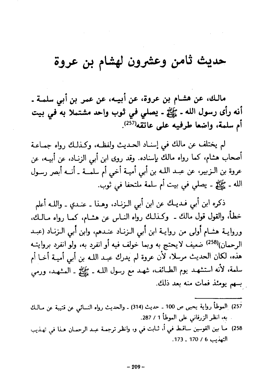 حَدِيثٌ ثَامِنٌ وَعِشْرُونَ لِهِشَامِ بْنِ عُرْوَةَ مَالِكٍ عَنْ هِشَامِ بْنِ عُرْوَةَ عَنْ أَبِيهِ عَنْ عُمَرَ بْنِ أَبِي سَلَمَةَ أَنَّهُ رَأَى رَسُولَ اللَّهِ صَلَّى اللَّهُ عَلَيْهِ وَسَلَّمَ يُصَلِّي فِي ثَوْبٍ وَاحِدٍ مُشْتَمِلًا بِهِ فِي بَيْتِ أُمِّ سَلَمَةَ وَاضِعًا طَرَفَيْهِ عَلَى عَاتِقِهِ لَمْ يُخْتَلَفْ عَنْ مَالِكٍ فِي إِسْنَادِ الْحَدِيثِ وَلَفْظِهِ وَكَذَلِكَ رَوَاهُ جَمَاعَةُ أَصْحَابِ هِشَامٍ كَمَا رَوَاهُ مَالِكٌ بِإِسْنَادِهِ وَقَدْ رَوَى ابْنُ أَبِي الزِّنَادِ عَنْ أَبِيهِ عَنْ عُرْوَةَ بْنِ الزُّبَيْرِ عَنْ عَبْدِ اللَّهِ بْنِ أَبِي أُمَيَّةَ أَخِي أُمِّ سَلَمَةَ أَنَّهُ أَبْصَرَ رَسُولُ اللَّهِ صَلَّى اللَّهُ عَلَيْهِ وَسَلَّمَ يُصَلِّي فِي بَيْتِ أُمِّ سَلَمَةَ مُلْتَحِفًا فِي ثَوْبٍ ذَكَرَهُ ابْنُ أَبِي فُدَيْكٍ عَنِ ابْنِ أَبِي الزِّنَادِ وَهَذَا عِنْدِي وَاللَّهُ أَعْلَمُ خَطَأٌ وَالْقَوْلُ قَوْلُ مَالِكٍ وَكَذَلِكَ رَوَاهُ النَّاسُ عَنْ هِشَامٍ كَمَا رَوَاهُ مَالِكٌ وَرِوَايَةُ هِشَامٍ أَوْلَى مِنْ رِوَايَةِ ابْنِ أَبِي الزِّنَادِ عِنْدَهُمْ وابن أبي الزناد (عبد الرحمان) ضَعِيفٌ لَا يُحْتَجُّ بِهِ وَبِمَا خُولِفَ فِيهِ أَوِ انْفَرَدَ بِهِ وَلَوِ انْفَرَدَ بِرِوَايَتِهِ هَذِهِ لَكَانَ الْحَدِيثُ مُرْسَلًا لِأَنَّ عُرْوَةَ لَمْ يُدْرِكْ عَبْدَ اللَّهِ بْنَ أَبِي أُمَيَّةَ أَخَا أُمِّ سَلَمَةَ لِأَنَّهُ اسْتُشْهِدَ يَوْمَ الطَّائِفِ شَهِدَ مَعَ رَسُولِ اللَّهِ صَلَّى اللَّهُ عَلَيْهِ وَسَلَّمَ الْمَشْهَدَ وَرُمِيَ بِسَهْمٍ يَوْمَئِذٍ فَمَاتَ مِنْهُ بَعْدَ ذَلِكَ