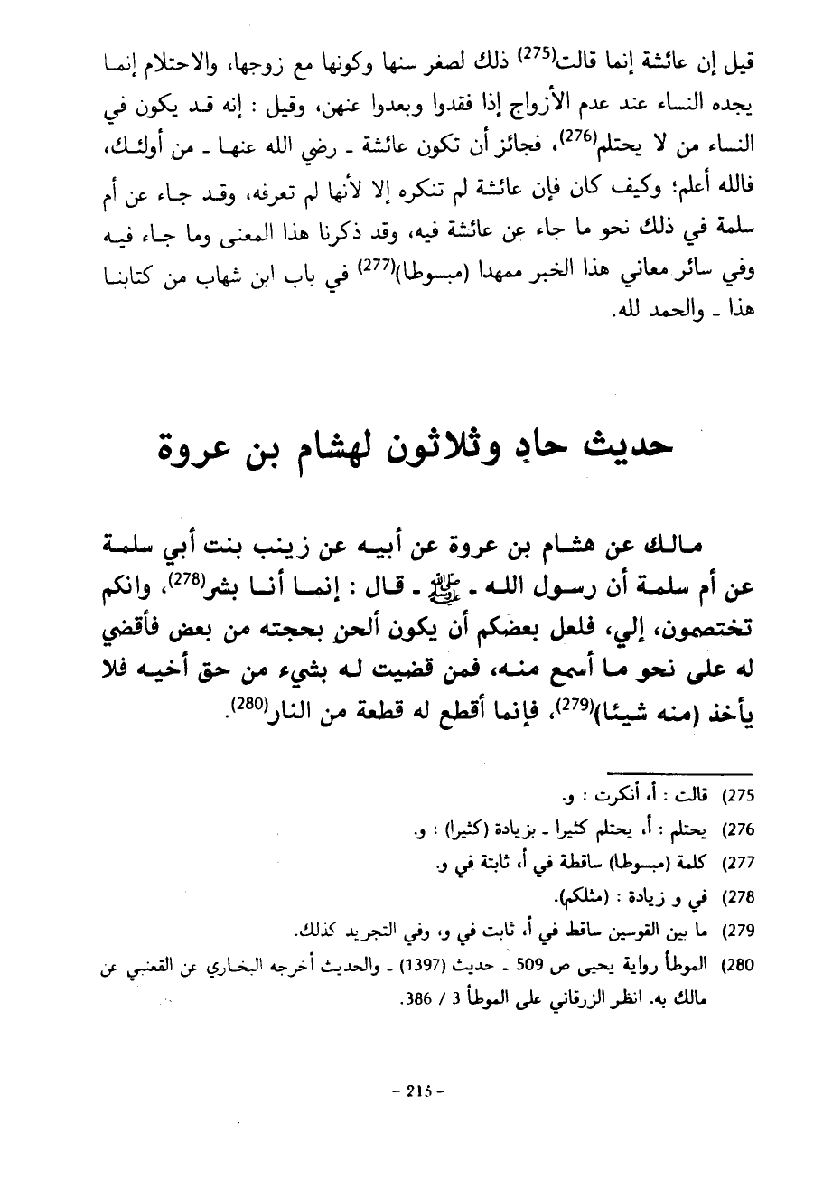 حَدِيثٌ حَادٍ وَثَلَاثُونَ لِهِشَامِ بْنِ عُرْوَةَ مَالِكٍ عَنْ هِشَامِ بْنِ عُرْوَةَ عَنْ أَبِيهِ عَنْ زَيْنَبَ بِنْتِ أَبِي سَلَمَةَ عَنْ أُمِّ سَلَمَةَ أَنَّ رَسُولَ اللَّهِ صَلَّى اللَّهُ عَلَيْهِ وَسَلَّمَ قَالَ إِنَّمَا أَنَا بَشَرٌ وَإِنَّكُمْ تَخْتَصِمُونَ إِلَيَّ فَلَعَلَّ بَعْضَكُمْ أَنْ يكون ألحن بحجته من بعض فَأَقْضِي لَهُ عَلَى نَحْوِ مَا أَسْمَعُ مِنْهُ فَمَنْ قَضَيْتُ لَهُ بِشَيْءٍ مِنْ حَقِّ أَخِيهِ فَلَا يَأْخُذْ (مِنْهُ شَيْئًا) فَإِنَّمَا أَقْطَعُ لَهُ قِطْعَةً مِنَ النار