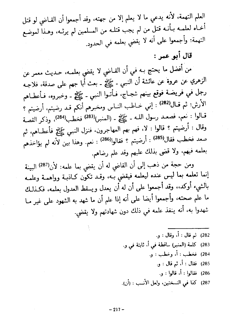 الْعِلْمِ التُّهْمَةَ لِأَنَّهُ يَدَّعِي مَا لَا يَعْلَمُ إِلَّا مِنْ جِهَتِهِ وَقَدْ أَجْمَعُوا أَنَّ الْقَاضِيَ لَوْ قَتَلَ أَخَاهُ لِعِلْمِهِ بِأَنَّهُ قَتَلَ مَنْ لَمْ يَجِبْ قَتْلُهُ مِنَ الْمُسْلِمِينَ لَمْ يَرِثْهُ وَهَذَا لِمَوْضِعِ التُّهْمَةِ وَأَجْمَعُوا عَلَى أَنَّهُ لَا يَقْضِي بِعِلْمِهِ فِي الْحُدُودِ قَالَ أَبُو عُمَرَ مِنْ أَفْضَلِ مَا يُحْتَجُّ بِهِ فِي أَنَّ الْقَاضِيَ لَا يَقْضِي بِعِلْمِهِ حَدِيثُ مَعْمَرٍ عَنِ الزُّهْرِيِّ عَنْ عُرْوَةَ عَنْ عَائِشَةَ أَنَّ النَّبِيَّ صَلَّى اللَّهُ عَلَيْهِ وَسَلَّمَ بَعَثَ أَبَا جَهْمٍ عَلَى صَدَقَةٍ فَلَاجَّهُ رَجُلٌ فِي فَرِيضَةٍ فَوَقَعَ بَيْنَهُمْ شِجَاجٌ فَأَتَوُا النَّبِيَّ صَلَّى اللَّهُ عَلَيْهِ وسلم وخبروه فأعطاهم لأرش ثُمَّ قَالَ إِنِّي خَاطِبُ النَّاسِ وَمُخْبِرُهُمْ أَنَّكُمْ قَدْ رَضِيتُمْ أَرَضِيتُمْ قَالُوا نَعَمْ فَصَعِدَ رَسُولُ اللَّهِ صَلَّى اللَّهُ عَلَيْهِ وَسَلَّمَ (الْمِنْبَرَ) فَخَطَبَ (2849 وَذَكَرَ الْقِصَّةَ وَقَالَ أَرَضِيتُمْ قَالُوا لَا فَهَمَّ بِهِمُ الْمُهَاجِرُونَ فَنَزَلَ النَّبِيُّ صَلَّى اللَّهُ عَلَيْهِ وَسَلَّمَ فَأَعْطَاهُمْ ثُمَّ صَعِدَ فَخَطَبَ فَقَالَ (285) أَرَضِيتُمْ فَقَالُوا نَعَمْ وَهَذَا بَيِّنٌ لِأَنَّهُ لَمْ يُؤَاخِذْهُمْ بِعِلْمِهِ فِيهِمْ وَلَا قَضَى بِذَلِكَ عَلَيْهِمْ وَقَدْ عَلِمَ رِضَاهُمْ وَمِنْ حُجَّةِ مَنْ ذَهَبَ إِلَى أَنَّ الْقَاضِيَ لَهُ أَنْ يَقْضِيَ بِمَا عَلِمَهُ لِأَنَّ الْبَيِّنَةَ إِنَّمَا تُعْلِمُهُ بِمَا لَيْسَ عِنْدَهُ لِيَعْلَمَهُ فَيَقْضِيَ بِهِ وَقَدْ تَكُونُ كَاذِبَةً وَوَاهِمَةً وَعِلْمُهُ بِالشَّيْءِ أَوْكَدُ وَقَدْ أَجْمَعُوا عَلَى أَنَّ له أن يعدل ويسقط العدول بعلمه فكذلك ماعلم صِحَّتَهُ وَأَجْمَعُوا أَيْضًا عَلَى أَنَّهُ إِذَا عَلِمَ أَنَّ مَا شَهِدَ بِهِ الشُّهُودُ عَلَى غَيْرِ مَا شَهِدُوا بِهِ أَنَّهُ يُنَفِّذُ عِلْمَهُ فِي ذَلِكَ دُونَ شَهَادَتِهِمْ وَلَا يَقْضِي