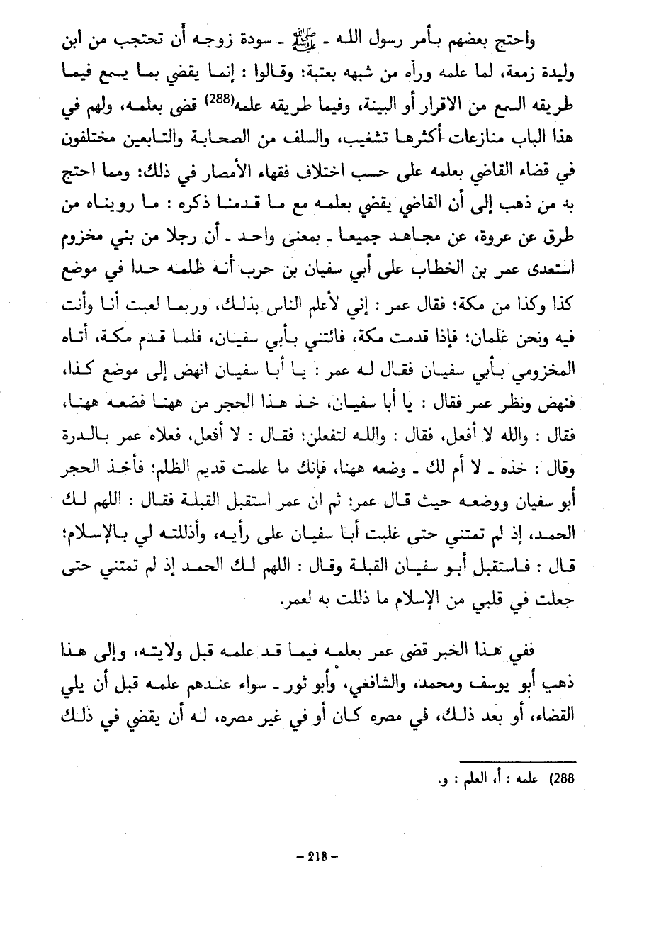 وَاحْتَجَّ بَعْضُهُمْ بِأَمْرِ رَسُولِ اللَّهِ صَلَّى اللَّهُ عَلَيْهِ وَسَلَّمَ سَوْدَةَ زَوْجَهُ أَنْ تَحْتَجِبَ مِنِ ابْنِ وَلِيدَةِ زَمْعَةَ لِمَا عَلِمَهُ وَرَآهُ مِنْ شِبْهِهِ بِعُتْبَةَ وَقَالُوا إِنَّمَا يَقْضِي بِمَا يَسْمَعُ فِيمَا طَرِيقُهُ السَّمْعُ مِنَ الْإِقْرَارِ أَوِ الْبَيِّنَةِ وَفِيمَا طَرِيقُهُ عِلْمُهُ قَضَى بِعِلْمِهِ وَلَهُمْ فِي هَذَا الْبَابِ مُنَازَعَاتٌ أَكْثَرُهَا تَشْغِيبٌ وَالسَّلَفُ مِنَ الصَّحَابَةِ وَالتَّابِعِينَ مُخْتَلِفُونَ فِي قَضَاءِ الْقَاضِي بِعِلْمِهِ عَلَى حَسَبِ اخْتِلَافِ فُقَهَاءِ الْأَمْصَارِ فِي ذَلِكَ وَمِمَّا احْتَجَّ بِهِ مَنْ ذَهَبَ إِلَى أَنَّ الْقَاضِيَ يَقْضِي بِعِلْمِهِ مَعَ مَا قَدَّمْنَا ذِكْرَهُ مَا رُوِّينَاهُ مِنْ طُرُقٍ عَنْ عُرْوَةَ عَنْ مُجَاهِدٍ جَمِيعًا بِمَعْنًى وَاحِدٍ أَنَّ رَجُلًا مِنْ بَنِي مَخْزُومٍ اسْتَعْدَى عُمَرَ بْنَ الْخَطَّابٍ عَلَى أَبِي سُفْيَانَ بْنِ حَرْبٍ أَنَّهُ ظَلَمَهُ حَدًّا فِي مَوْضِعِ كَذَا وَكَذَا مِنْ مَكَّةَ فَقَالَ عُمَرُ إِنِّي لَأَعْلَمُ النَّاسِ بِذَلِكَ وَرُبَّمَا لَعِبْتُ أَنَا وَأَنْتَ فِيهِ وَنَحْنُ غِلْمَانُ فَإِذَا قَدِمْتَ مَكَّةَ فَائْتِنِي بِأَبِي سُفْيَانَ فَلَمَّا قَدِمَ مَكَّةَ أَتَاهُ الْمَخْزُومِيُّ بِأَبِي سُفْيَانَ فَقَالَ لَهُ عُمَرُ يَا أَبَا سُفْيَانَ انْهَضْ إِلَى مَوْضِعِ كَذَا فَنَهَضَ وَنَظَرَ عُمَرُ فَقَالَ يَا أَبَا سُفْيَانَ خذ هذا الحجر من ههنا فضعه ههنا فَقَالَ وَاللَّهِ لَا أَفْعَلُ فَقَالَ وَاللَّهِ لَتَفْعَلَنَّ فَقَالَ لَا أَفْعَلُ فَعَلَاهُ عُمَرُ بِالدُّرَّةِ وَقَالَ خذه لا أم لك وضعه ههنا فَإِنَّكَ مَا عَلِمْتَ قَدِيمَ الظُّلْمِ فَأَخَذَ الْحَجَرَ أَبُو سُفْيَانَ وَوَضَعَهُ حَيْثُ قَالَ عُمَرُ ثُمَّ إِنَّ عُمَرَ اسْتَقْبَلَ الْقِبْلَةَ فَقَالَ اللَّهُمَّ لَكَ الْحَمْدُ إِذْ لَمْ تَمُتْنِي حَتَّى غَلَبْتَ أَبَا سُفْيَانَ عَلَى رَأْيِهِ وَأَذْلَلْتَهُ لِي بِالْإِسْلَامِ قَالَ فَاسْتَقْبَلَ أَبُو سُفْيَانَ الْقِبْلَةَ وَقَالَ اللَّهُمَّ لَكَ الْحَمْدُ إِذْ لَمْ تَمُتْنِي حَتَّى جَعَلْتَ فِي قَلْبِي مِنَ الْإِسْلَامِ مَا ذَلَلْتُ بِهِ لِعُمَرَ فَفِي هَذَا الْخَبَرِ قَضَى عُمَرُ بِعِلْمِهِ فِيمَا قَدْ عَلِمَهُ قَبْلَ وِلَايَتِهِ وَإِلَى هَذَا ذَهَبَ أَبُو يُوسُفَ وَمُحَمَّدٌ وَالشَّافِعِيُّ وَأَبُو ثَوْرٍ سَوَاءً عِنْدَهُمْ عَلِمَهُ قَبْلَ أَنْ يَلِيَ الْقَضَاءَ أَوْ بَعْدَ ذَلِكَ فِي مِصْرِهِ كَانَ أَوْ فِي غَيْرِ مِصْرِهِ لَهُ أَنْ يَقْضِيَ فِي ذَلِكَ