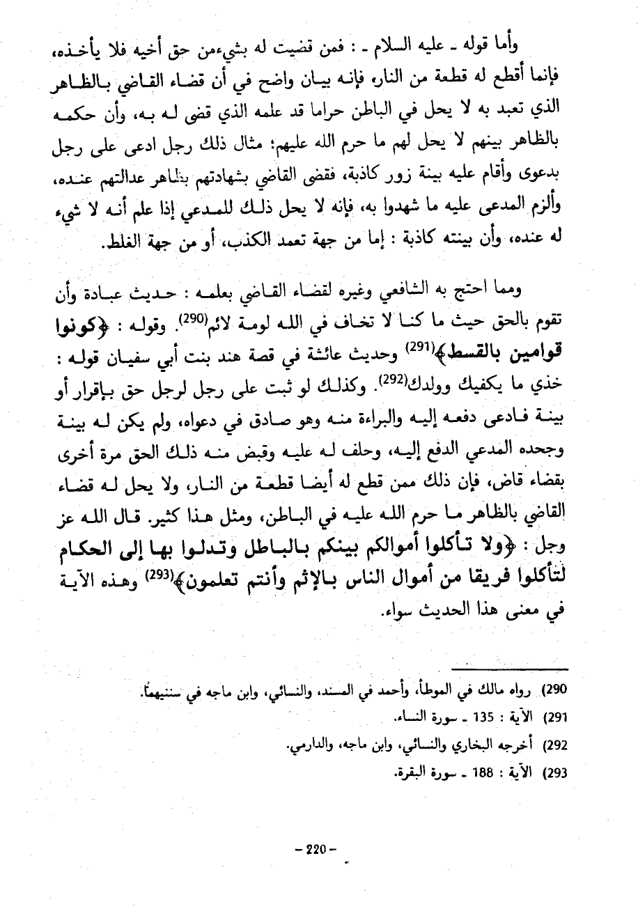 وَأَمَّا قَوْلُهُ عَلَيْهِ السَّلَامُ فَمَنْ قَضَيْتُ لَهُ بِشَيْءٍ مِنْ حَقِّ أَخِيهِ فَلَا يَأْخُذْهُ فَإِنَّمَا أَقْطَعُ لَهُ قِطْعَةً مِنَ النَّارِ فَإِنَّهُ بَيَانٌ وَاضِحٌ فِي أَنَّ قَضَاءَ الْقَاضِي بِالظَّاهِرِ الَّذِي تَعْبَّدَ بِهِ لَا يَحِلُّ فِي الْبَاطِنِ حَرَامًا قَدْ عَلِمَهُ الَّذِي قَضَى لَهُ بِهِ وَأَنَّ حُكْمَهُ بِالظَّاهِرِ بَيْنَهُمْ لَا يَحِلُّ لَهُمْ مَا حَرَّمَ اللَّهُ عَلَيْهِمْ مِثَالُ ذَلِكَ رَجُلٌ ادَّعَى على رجل بدعوى وأقام عليه بنية زُورٍ كَاذِبَةً فَقَضَى الْقَاضِي بِشَهَادَتِهِمْ بِظَاهِرِ عَدَالَتِهِمْ عِنْدَهُ وَأَلْزَمَ الْمُدَّعَى عَلَيْهِ مَا شَهِدُوا بِهِ فَإِنَّهُ لَا يَحِلُّ ذَلِكَ لِلْمُدَّعِي إِذَا عَلِمَ أَنَّهُ لَا شَيْءَ لَهُ عِنْدَهُ وَأَنَّ بَيِّنَتَهُ كَاذِبَةٌ إِمَّا مِنْ جِهَةِ تَعَمُّدِ الْكَذِبِ أَوْ مِنْ جِهَةِ الْغَلَطِ وَمِمَّا احْتَجَّ بِهِ الشَّافِعِيُّ وَغَيْرُهُ لِقَضَاءِ الْقَاضِي بِعِلْمِهِ حَدِيثُ عُبَادَةَ وَأَنْ تَقُومَ بِالْحَقِّ حَيْثُ مَا كُنَّا لَا تَخَافُ فِي اللَّهِ لَوْمَةَ لَائِمٍ وَقَوْلُهُ كُونُوا قَوَّامِينَ بِالْقِسْطِ وَحَدِيثُ عَائِشَةَ فِي قِصَّةِ هِنْدٍ بِنْتِ أَبِي سُفْيَانَ قَوْلُهُ خُذِي مَا يَكْفِيكِ وَوَلَدِكِ وَكَذَلِكَ لَوْ ثَبَتَ عَلَى رَجُلٍ لِرَجُلٍ حَقٌّ بِإِقْرَارٍ أَوْ بَيِّنَةٍ فَادَّعَى دَفْعَهُ إِلَيْهِ وَالْبَرَاءَةَ مِنْهُ وَهُوَ صَادِقٌ فِي دَعْوَاهُ وَلَمْ يَكُنْ لَهُ بَيِّنَةٌ وَجَحَدَهُ الْمُدَّعِي الدَّفْعَ إِلَيْهِ وَحَلَفَ لَهُ عَلَيْهِ وَقَبَضَ مِنْهُ ذَلِكَ الْحَقَّ مَرَّةً أُخْرَى بِقَضَاءِ قَاضٍ فَإِنَّ ذَلِكَ مِمَّنْ قَطَعَ لَهُ أَيْضًا قِطْعَةً مِنَ النَّارِ وَلَا يَحِلُّ لَهُ قَضَاءُ الْقَاضِي بِالظَّاهِرِ مَا حَرَّمَ اللَّهُ عَلَيْهِ فِي الْبَاطِنِ وَمِثْلُ هَذَا كَثِيرٌ قَالَ اللَّهُ عَزَّ وَجَلَّ وَلَا تَأْكُلُوا أَمْوَالَكُمْ بَيْنَكُمْ بِالْبَاطِلِ وَتُدْلُوا بِهَا إِلَى الْحُكَّامِ لِتَأْكُلُوا فَرِيقًا مِنْ أَمْوَالِ النَّاسِ بِالْإِثْمِ وَأَنْتُمْ تَعْلَمُونَ وَهَذِهِ الْآيَةُ فِي مَعْنَى هَذَا الْحَدِيثِ سَوَاءً