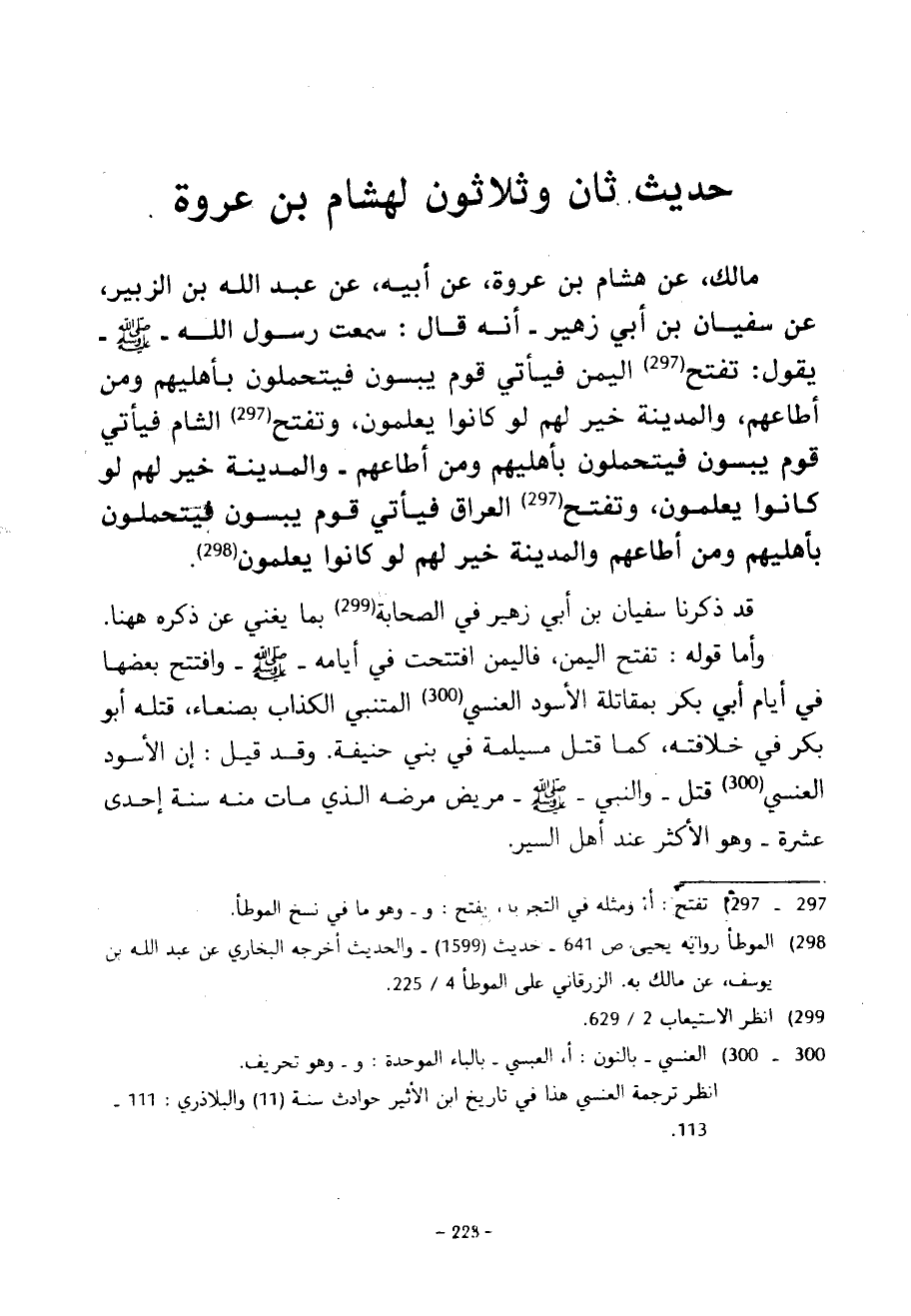 حَدِيثٌ ثَانٍ وَثَلَاثُونَ لِهِشَامِ بْنِ عُرْوَةَ مَالِكٍ عَنْ هِشَامِ بْنِ عُرْوَةَ عَنْ أَبِيهِ عَنْ عَبْدِ اللَّهِ بْنِ الزُّبَيْرِ عَنْ سُفْيَانَ بْنِ أَبِي زُهَيْرٍ أَنَّهُ قَالَ سَمِعْتُ رَسُولَ اللَّهِ صَلَّى اللَّهُ عَلَيْهِ وَسَلَّمَ يَقُولُ تُفْتَحُ الْيَمَنُ فَيَأْتِي قَوْمٌ يُبِسُّونَ فَيَتَحَمَّلُونَ بِأَهْلِيهِمْ وَمَنْ أَطَاعَهُمْ وَالْمَدِينَةُ خَيْرٌ لَهُمْ لَوْ كَانُوا يَعْلَمُونَ وَتُفْتَحُ الشَّامُ فَيَأْتِي قَوْمٌ يُبِسُّونَ فَيَتَحَمَّلُونَ بِأَهْلِيهِمْ وَمَنْ أَطَاعَهُمْ وَالْمَدِينَةُ خَيْرٌ لَهُمْ لَوْ كَانُوا يَعْلَمُونَ وَتُفْتَحُ الْعِرَاقُ فَيَأْتِي قَوْمٌ يُبِسُّونَ فَيَتَحَمَّلُونَ بِأَهْلِيهِمْ وَمَنْ أَطَاعَهُمْ وَالْمَدِينَةُ خَيْرٌ لَهُمْ لَوْ كَانُوا يَعْلَمُونَ قَدْ ذَكَرْنَا سُفْيَانَ بْنَ أَبِي زُهَيْرٍ فِي الصَّحَابَةِ بِمَا يُغْنِي عَنْ ذِكْرِهِ هَهُنَا وَأَمَّا قَوْلُهُ تُفْتَحُ الْيَمَنُ فَالْيَمَنُ افْتُتِحَتْ فِي أَيَّامِهِ صَلَّى اللَّهُ عَلَيْهِ وَسَلَّمَ وَافْتُتِحَ بَعْضُهَا فِي أَيَّامِ أَبِي بَكْرٍ بِمُقَاتَلَةِ الْأَسْوَدِ الْعَنْسِيِّ الْمُتَنَبِّي الْكَذَّابِ بِصَنْعَاءَ قَتَلَهُ أَبُو بَكْرٍ فِي خِلَافَتِهِ كَمَا قَتَلَ مُسَيْلِمَةَ فِي بَنِي حَنِيفَةَ وَقَدْ قِيلَ إِنَّ الْأَسْوَدَ الْعَنْسِيَّ قُتِلَ وَالنَّبِيُّ صَلَّى اللَّهُ عَلَيْهِ وَسَلَّمَ مَرِيضٌ مَرَضَهُ الَّذِي مَاتَ مِنْهُ سَنَةَ إِحْدَى عَشْرَةَ وَهُوَ الْأَكْثَرُ عِنْدَ أَهْلِ السِّيَرِ