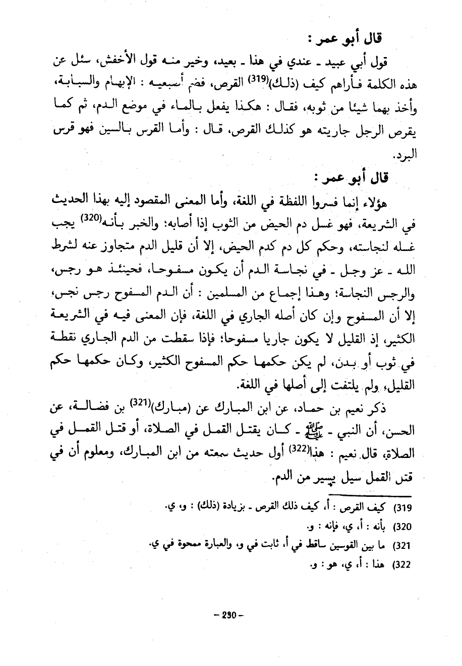 قَالَ أَبُو عُمَرَ قَوْلُ أَبِي عُبَيْدٍ عِنْدِي فِي هَذَا بَعِيدٌ وَخَيْرٌ مِنْهُ قَوْلُ الْأَخْفَشِ سُئِلَ عَنْ هَذِهِ الْكَلِمَةِ فَأَرَاهُمْ كَيْفَ (ذَلِكَ) الْقُرْصُ فَضَمَّ أُصْبُعَيْهِ الْإِبْهَامَ وَالسَّبَّابَةَ وَأَخَذَ بِهِمَا شَيْئًا مِنْ ثَوْبِهِ فَقَالَ هَكَذَا يُفْعَلُ بِالْمَاءِ فِي مَوْضِعِ الدَّمِ ثُمَّ كَمَا يُقَرِّصُ الرَّجُلُ جَارَيْتَهُ هُوَ كَذَلِكَ الْقُرْصُ قَالَ وَأَمَّا الْقَرْسُ بِالسِّينِ فَهُوَ قَرْسُ الْبَرْدِ قَالَ أَبُو عُمَرَ هَؤُلَاءِ إِنَّمَا فَسَّرُوا اللَّفْظَةَ فِي اللُّغَةِ وَأَمَّا الْمَعْنَى الْمَقْصُودُ إِلَيْهِ بِهَذَا الْحَدِيثِ فِي الشَّرِيعَةِ فَهُوَ غَسْلُ دَمِ الْحَيْضِ مِنَ الثَّوْبِ إِذَا أَصَابَهُ وَالْخَبَرُ بِأَنَّهُ يَجِبُ غَسْلُهُ لِنَجَاسَتِهِ وَحُكْمُ كُلِّ دَمٍ كَدَمِ الْحَيْضِ إِلَّا أَنَّ قَلِيلَ الدَّمِ مُتَجَاوِزٌ عَنْهُ لِشَرْطِ اللَّهِ عَزَّ وَجَلَّ فِي نَجَاسَةِ الدَّمِ أَنْ يَكُونَ مَسْفُوحًا فَحِينَئِذٍ هُوَ رِجْسٌ وَالرِّجْسُ النَّجَاسَةُ وَهَذَا إِجْمَاعٌ مِنَ الْمُسْلِمِينَ أَنَّ الدَّمَ الْمَسْفُوحَ رِجْسٌ نَجِسٌ إِلَّا أَنَّ الْمَسْفُوحَ وَإِنْ كَانَ أَصْلُهُ الْجَارِي فِي اللُّغَةِ فَإِنَّ الْمَعْنَى فِيهِ فِي الشَّرِيعَةِ الْكَثِيرُ إِذِ الْقَلِيلُ لَا يَكُونُ جَارِيًا مَسْفُوحًا فَإِذَا سَقَطَتْ مِنَ الدَّمِ الْجَارِي نُقْطَةٌ فِي ثَوْبٍ أَوْ بَدَنٍ لَمْ يَكُنْ حُكْمُهَا حُكْمَ الْمَسْفُوحِ الْكَثِيرِ وَكَانَ حُكْمُهَا حُكْمَ الْقَلِيلِ وَلَمْ يُلْتَفَتْ إِلَى أَصْلِهَا فِي اللُّغَةِ ذَكَرَ نُعَيْمُ بْنُ حَمَّادٍ عَنِ ابْنِ الْمُبَارَكِ عَنْ (مُبَارَكِ) بْنِ فَضَالَةَ عَنِ الْحَسَنِ أَنَّ النَّبِيَّ صَلَّى اللَّهُ عَلَيْهِ وَسَلَّمَ كَانَ يَقْتُلُ الْقَمْلَ فِي الصَّلَاةِ أَوْ قَتَلَ الْقَمْلَ فِي الصَّلَاةِ قَالَ نُعَيْمٌ هَذَا أَوَّلُ حَدِيثٍ سَمِعْتُهُ مِنَ ابْنِ الْمُبَارَكِ وَمَعْلُومٌ أَنَّ فِي قَتْلِ الْقَمْلِ سَيْلَ يَسِيرٍ من الدم