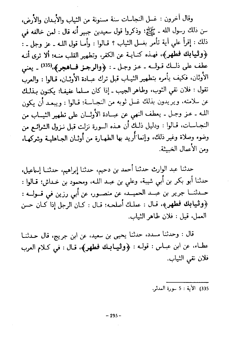 وَقَالَ آخَرُونَ غَسْلُ النَّجَاسَاتِ سُنَّةٌ مَسْنُونَةٌ مِنَ الثِّيَابِ وَالْأَبْدَانِ وَالْأَرْضِ سَنَّ ذَلِكَ رَسُولُ اللَّهِ صَلَّى اللَّهُ عَلَيْهِ وَسَلَّمَ وَذَكَرُوا قَوْلَ سَعِيدِ بْنِ جُبَيْرٍ أَنَّهُ قَالَ لِمَنْ خَالَفَهُ فِي ذَلِكَ اقْرَأْ عَلَيَّ آيَةً تَأْمُرُ بِغَسْلِ الثِّيَابِ قَالُوا وَأَمَّا قَوْلُ اللَّهِ عَزَّ وَجَلَّ وَثِيَابَكَ فَطَهِّرْ فَهَذِهِ كِنَايَةٌ عَنِ الْكُفْرِ وَتَطْهِيرِ الْقَلْبِ مِنْهُ أَلَا تَرَى أَنَّهُ عَطَفَ عَلَى ذَلِكَ قَوْلُهُ عَزَّ وَجَلَّ وَالرُّجْزَ فَاهْجُرْ يَعْنِي الْأَوْثَانَ فَكَيْفَ يَأْمُرُهُ بِتَطْهِيرِ الثِّيَابِ قَبْلَ تَرْكِ عِبَادَةِ الْأَوْثَانِ قَالُوا وَالْعَرَبُ تَقُولُ فُلَانٌ نَقِيُّ الثَّوْبِ وَطَاهِرُ الْجَيْبِ إِذَا كَانَ مُسْلِمًا عَفِيفًا يُكَنُّونَ بِذَلِكَ عَنْ سَلَامَتِهِ وَيُرِيدُونَ بِذَلِكَ غَسْلَ ثَوْبِهِ مِنَ النَّجَاسَةِ قَالُوا وَيَبْعُدُ أَنْ يَكُونَ اللَّهُ عَزَّ وَجَلَّ يَعْطِفُ النَّهْيَ عَنْ عِبَادَةِ الْأَوْثَانِ عَلَى تَطْهِيرِ الثِّيَابِ مِنَ النَّجَاسَاتِ قَالُوا وَدَلِيلُ ذَلِكَ أَنَّ هَذِهِ السُّورَةَ نَزَلَتْ قَبْلَ نُزُولِ الشَّرَائِعِ مِنْ وُضُوءٍ وَصَلَاةٍ وَغَيْرِ ذَلِكَ وَإِنَّمَا أُرِيدَ بِهَا الطَّهَارَةُ مِنْ أَوْثَانِ الْجَاهِلِيَّةِ وَشِرْكِهَا وَمِنَ الْأَعْمَالِ الْخَبِيثَةِ حَدَّثَنَا عَبْدُ الْوَارِثِ حَدَّثَنَا أَحْمَدُ بْنُ دُحَيْمٍ حَدَّثَنَا إِبْرَاهِيمُ حَدَّثَنَا إِسْمَاعِيلُ حَدَّثَنَا أَبُو بَكْرِ بْنُ أَبِي شَيْبَةَ وَعَلِيُّ بْنُ عَبْدِ اللَّهِ وَمَحْمُودُ بْنُ خِدَاشٍ قَالُوا حَدَّثَنَا جَرِيرُ بْنُ عَبْدِ الْحَمِيدِ عَنْ مَنْصُورٍ عَنْ أَبِي رَزِينٍ فِي قَوْلِهِ وَثِيَابَكَ فَطَهِّرْ قَالَ عَمَلُكَ أَصْلِحْهُ قَالَ كَانَ الرَّجُلُ إِذَا كَانَ حَسَنَ الْعَمَلِ قِيلَ فُلَانٌ طَاهِرُ الثِّيَابِ قَالَ وَحَدَّثَنَا مُسَدَّدٌ حَدَّثَنَا يَحْيَى بْنُ سَعِيدٍ عَنِ ابْنِ جُرَيْجٍ قَالَ حَدَّثَنَا عَطَاءٌ عَنِ ابْنِ عَبَّاسٍ قَوْلُهُ وَثِيَابَكَ فَطَهِّرْ قَالَ فِي كَلَامِ الْعَرَبِ فُلَانٌ نَقِيُّ الثِّيَابِ
