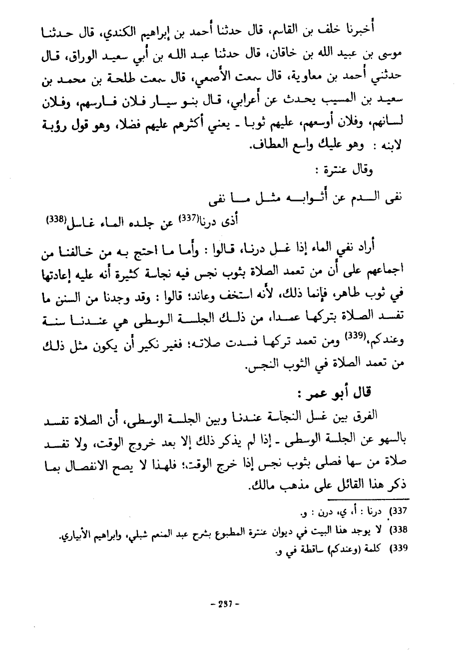 أَخْبَرَنَا خَلَفُ بْنُ الْقَاسِمِ قَالَ حَدَّثَنَا أَحْمَدُ بْنُ إِبْرَاهِيمَ الْكِنْدِيُّ قَالَ حَدَّثَنَا مُوسَى بْنُ عُبَيْدِ اللَّهِ بْنِ خَاقَانَ قَالَ حَدَّثَنَا عَبْدُ اللَّهِ بْنُ أَبِي سَعِيدٍ الْوَرَّاقُ قَالَ حَدَّثَنِي أَحْمَدُ بْنُ مُعَاوِيَةَ قَالَ سَمِعْتُ الْأَصْمَعِيَّ قَالَ سَمِعْتُ طَلْحَةَ بْنَ مُحَمَّدِ بْنِ سَعِيدِ بْنِ الْمُسَيَّبِ يُحَدِّثُ عَنْ أَعْرَابِيٍّ قَالَ بَنُو سَيَّارٍ فُلَانٌ فَارِسُهُمْ وَفُلَانٌ لِسَانُهُمْ وَفُلَانٌ أَوْسَعُهُمْ عَلَيْهِمْ ثَوْبًا يَعْنِي أَكْثَرَهُمْ عَلَيْهِمْ فَضْلًا وَهُوَ قَوْلُ رؤية لِابْنِهِ وَهُوَ عَلَيْكَ وَاسِعُ الْعِطَافِ وَقَالَ عَنْتَرَةُ ... نَفَى الدَّمَ عَنْ أَثْوَابِهِ مِثْلَ مَا نَفَى ... ... أَذَى دَرَنَا عَنْ جِلْدِهِ الْمَاءُ غَاسِلُ ... أَرَادَ نَفْيَ الْمَاءِ إِذَا غَسَلَ دَرَنًا قَالُوا وَأَمَّا مَا احْتَجَّ بِهِ مَنْ خَالَفَنَا مِنْ إِجْمَاعِهِمْ عَلَى أَنَّ مَنْ تَعَمَّدَ الصَّلَاةَ بِثَوْبٍ نَجِسٍ فِيهِ نَجَاسَةٌ كَثِيرَةٌ أَنَّهُ عَلَيْهِ إِعَادَتُهَا فِي ثَوْبٍ طَاهِرٍ فَإِنَّمَا ذَلِكَ لِأَنَّهُ اسْتَخَفَّ وَعَانَدَ قَالُوا وَقَدْ وَجَدْنَا مِنَ السُّنَنِ مَا تَفْسُدُ الصَّلَاةُ بِتَرْكِهَا عَمْدًا مِنْ ذَلِكَ الْجَلْسَةُ الْوُسْطَى هِيَ عِنْدَنَا سُنَّةٌ وَعِنْدَكُمْ وَمَنْ تَعَمَّدَ تَرْكَهَا فَسَدَتْ صَلَاتُهُ فَغَيْرُ نَكِيرٍ أَنْ يَكُونَ مِثْلَ ذَلِكَ مِنْ تَعَمُّدِ الصَّلَاةِ فِي الثَّوْبِ النَّجِسِ قَالَ أَبُو عُمَرَ الْفَرْقُ بَيْنَ غَسْلِ النَّجَاسَةِ عِنْدَنَا وَبَيْنَ الْجَلْسَةِ الْوُسْطَى أَنَّ الصَّلَاةَ تَفْسُدُ بِالسَّهْوِ عَنِ الْجَلْسَةِ الْوُسْطَى إِذَا لَمْ يَذْكُرْ ذَلِكَ إِلَّا بَعْدَ خُرُوجِ الْوَقْتِ وَلَا تَفْسُدُ صَلَاةُ مَنْ سَهَا فَصَلَّى بِثَوْبٍ نَجِسٍ إِذَا خَرَجَ الْوَقْتُ فَلِهَذَا لَا يَصِحُّ الِانْفِصَالُ بِمَا ذَكَرَ هَذَا الْقَائِلُ عَلَى مَذْهَبِ مَالِكٍ