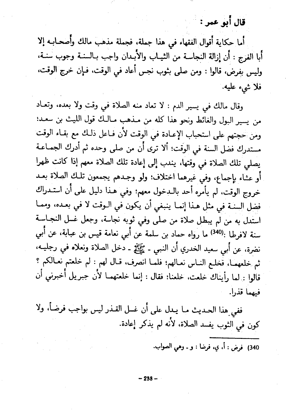 قَالَ أَبُو عُمَرَ أَمَّا حِكَايَةُ أَقْوَالِ الْفُقَهَاءِ فِي هَذَا جُمْلَةً فَجُمْلَةُ مَذْهَبِ مَالِكٍ وَأَصْحَابِهِ إِلَّا أَبَا الْفَرَجِ أَنَّ إِزَالَةَ النَّجَاسَةِ مِنَ الثِّيَابِ وَالْأَبْدَانِ وَاجِبٌ بِالسُّنَّةِ وُجُوبَ سُنَّةٍ وَلَيْسَ بِفَرْضٍ قَالُوا وَمَنْ صَلَّى بِثَوْبٍ نَجِسٍ أَعَادَ فِي الْوَقْتِ فَإِنْ خَرَجَ الْوَقْتُ فَلَا شَيْءَ عَلَيْهِ وَقَالَ مَالِكٌ فِي يَسِيرِ الدَّمِ لَا تُعَادُ مِنْهُ الصَّلَاةُ فِي وَقْتٍ وَلَا بَعْدَهُ وَتُعَادُ مَنْ يَسِيرِ الْبَوْلِ وَالْغَائِطِ وَنَحْوَ هَذَا كُلِّهِ مِنْ مَذْهَبِ مَالِكٍ قَوْلُ اللَّيْثِ بْنِ سَعْدٍ وَمِنْ حُجَّتِهِمْ عَلَى اسْتِحْبَابِ الْإِعَادَةِ فِي الْوَقْتِ لِأَنَّ فَاعِلَ ذَلِكَ مَعَ بَقَاءِ الْوَقْتِ مُسْتَدْرَكُ فَضْلِ السُّنَّةِ فِي الْوَقْتِ أَلَا تَرَى أَنَّ مَنْ صَلَّى وَحْدَهُ ثُمَّ أَدْرَكَ الْجَمَاعَةَ يُصَلِّي تِلْكَ الصَّلَاةَ فِي وَقْتِهَا يَنْدُبُ إِلَى إِعَادَةِ تِلْكَ الصَّلَاةِ مَعَهُمْ إِذَا كَانَتْ ظُهْرًا أَوْ عِشَاءً بِإِجْمَاعٍ وَفِي غَيْرِهِمَا اخْتِلَافٌ وَلَوْ وجدهم بجمعون تِلْكَ الصَّلَاةَ بَعْدَ خُرُوجِ الْوَقْتِ لَمْ يَأْمُرْهُ أَحَدٌ بِالدُّخُولِ مَعَهُمْ وَفِي هَذَا دَلِيلٌ عَلَى أَنَّ اسْتِدْرَاكَ فَضْلِ السُّنَّةِ فِي مِثْلِ هَذَا إِنَّمَا يَنْبَغِي أَنْ يَكُونَ فِي الْوَقْتِ لَا فِي بَعْدِهِ وَمِمَّا اسْتَدَلَّ بِهِ مَنْ لَمْ يُبْطِلْ صَلَاةَ مَنْ صَلَّى وَفِي ثَوْبِهِ نَجَاسَةٌ وجعل غسل النجاسة سنة لا فرطا مَا رَوَاهُ حَمَّادُ بْنُ سَلَمَةَ عَنْ أَبِي نَعَامَةَ قَيْسِ بْنِ عُبَابَةَ عَنْ أَبِي نَضْرَةَ عَنْ أَبِي سَعِيدٍ الْخُدْرِيِّ أَنَّ النَّبِيَّ صَلَّى اللَّهُ عَلَيْهِ وَسَلَّمَ دَخَلَ الصَّلَاةَ وَنَعْلَاهُ فِي رِجْلَيْهِ ثُمَّ خَلَعَهُمَا فَخَلَعَ النَّاسُ نِعَالَهُمْ فَلَمَّا انْصَرَفَ قَالَ لَهُمْ لِمَ خَلَعْتُمْ نِعَالَكُمْ قَالُوا لَمَّا رَأَيْنَاكَ خَلَعْتَ خَلَعْنَا فَقَالَ إِنَّمَا خَلَعْتُهُمَا لِأَنَّ جِبْرِيلَ أَخْبَرَنِي أَنَّ فِيهِمَا قَذَرًا فَفِي هَذَا الْحَدِيثِ مَا يَدُلُّ عَلَى أَنَّ غَسْلَ القذر ليس بواجب فرضا ولا كون فِي الثَّوْبِ يُفْسِدُ الصَّلَاةَ لِأَنَّهُ لَمْ يَذْكُرْ إعادة