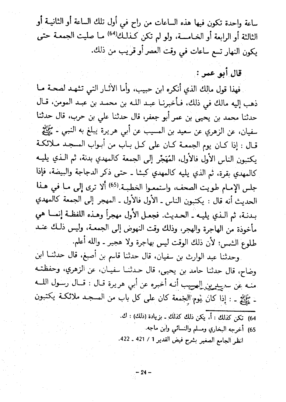 سَاعَةً وَاحِدَةً تَكُونُ فِيهَا هَذِهِ السَّاعَاتُ مَنْ رَاحَ فِي أَوَّلِ تِلْكَ السَّاعَةِ أَوِ الثَّانِيَةِ أَوِ الثَّالِثَةِ أَوِ الرَّابِعَةِ أَوِ الْخَامِسَةِ وَلَوْ لَمْ تَكُنْ كَذَلِكَ مَا صُلِّيَتِ الْجُمُعَةُ حَتَّى يَكُونَ النَّهَارُ تِسْعَ سَاعَاتٍ فِي وَقْتِ الْعَصْرِ أَوْ قَرِيبٍ مِنْ ذَلِكَ قَالَ أَبُو عُمَرَ فَهَذَا قَوْلُ مَالِكٍ الَّذِي أَنْكَرَهُ ابْنُ حَبِيبٍ وَأَمَّا الْآثَارُ الَّتِي تَشْهَدُ لِصِحَّةِ مَا ذَهَبَ إِلَيْهِ مَالِكٌ فِي ذَلِكَ فَأَخْبَرَنَا عَبْدُ اللَّهِ بْنُ مُحَمَّدِ بْنِ عَبْدِ الْمُؤْمِنِ قَالَ حَدَّثَنَا مُحَمَّدُ بْنُ يَحْيَى بْنِ عُمَرَ أَبُو جَعْفَرٍ قَالَ حَدَّثَنَا عَلِيُّ بْنُ حَرْبٍ قَالَ حَدَّثَنَا سُفْيَانُ عَنِ الزُّهْرِيِّ عَنْ سَعِيدِ بْنِ الْمُسَيَّبِ عَنْ أَبِي هُرَيْرَةَ يَبْلُغْ بِهِ النَّبِيَّ صَلَّى اللَّهُ عَلَيْهِ وَسَلَّمَ قَالَ إِذَا كَانَ يَوْمُ الْجُمُعَةِ كَانَ عَلَى كُلِّ بَابٍ مِنْ أَبْوَابِ الْمَسْجِدِ مَلَائِكَةٌ يَكْتُبُونَ النَّاسَ الْأَوَّلَ فَالْأَوَّلَ الْمُهَجِّرُ إِلَى الْجُمُعَةِ كَالْمُهْدِي بَدَنَةً ثُمَّ الَّذِي يَلِيهِ كَالْمُهْدِي بَقَرَةً ثُمَّ الَّذِي يَلِيهِ كَالْمُهْدِي كَبْشًا حَتَّى ذَكَرَ الدَّجَاجَةَ وَالْبَيْضَةَ فَإِذَا جَلَسَ الْإِمَامُ طُوِيَتِ الصُّحُفَ وَاسْتَمَعُوا الْخُطْبَةَ أَلَا تَرَى إِلَى مَا فِي هَذَا الْحَدِيثِ أَنَّهُ قَالَ يَكْتُبُونَ النَّاسَ الْأَوَّلَ فَالْأَوَّلَ الْمُهَجِّرُ إِلَى الْجُمُعَةِ كَالْمُهْدِي بَدَنَةً ثُمَّ الَّذِي يَلِيهِ الْحَدِيثَ فَجَعَلَ الْأَوَّلَ مهجرا وهذه اللفظة إنما هي مأخذوة مِنَ الْهَاجِرَةِ وَالْهَجْرِ وَذَلِكَ وَقْتُ النُّهُوضِ إِلَى الْجُمُعَةِ وَلَيْسَ ذَلِكَ عِنْدَ طُلُوعِ الشَّمْسِ لِأَنَّ ذَلِكَ الْوَقْتَ لَيْسَ بِهَاجِرَةٍ وَلَا هَجِيرٍ وَاللَّهُ أَعْلَمُ وَحَدَّثَنَا عَبْدُ الْوَارِثِ بْنُ سُفْيَانَ قَالَ حَدَّثَنَا قَاسِمُ بْنُ أَصْبَغَ قَالَ حَدَّثَنَا ابْنُ وَضَّاحٍ قَالَ حَدَّثَنَا حَامِدُ بْنُ يَحْيَى قَالَ حَدَّثَنَا سُفْيَانُ عَنِ الزُّهْرِيِّ وَحَفِظْتُهُ مِنْهُ عَنْ سَعِيدِ بْنِ الْمُسَيَّبِ أَنَّهُ أَخْبَرَهُ عَنْ أَبِي هُرَيْرَةَ قَالَ قَالَ رَسُولُ اللَّهِ صَلَّى اللَّهُ عَلَيْهِ وَسَلَّمَ إِذَا كَانَ يَوْمُ الْجُمُعَةِ كَانَ عَلَى كُلِّ بَابٍ مِنَ الْمَسْجِدِ مَلَائِكَةٌ يَكْتُبُونَ