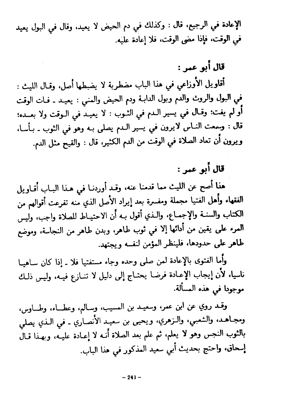 الْإِعَادَةُ فِي الرَّجِيعِ قَالَ وَكَذَلِكَ فِي دَمِ الْحَيْضِ لَا يُعِيدُ وَقَالَ فِي الْبَوْلِ يُعِيدُ فِي الْوَقْتِ فَإِذَا مَضَى الْوَقْتُ فَلَا إِعَادَةَ عَلَيْهِ قَالَ أَبُو عُمَرَ أَقَاوِيلُ الْأَوْزَاعِيِّ فِي هَذَا الْبَابِ مُضْطَرِبَةٌ لَا يَضْبُطُهَا أَصْلٌ وَقَالَ اللَّيْثُ فِي الْبَوْلِ وَالرَّوْثِ وَالدَّمِ وَبَوْلِ الدَّابَّةِ وَدَمِ الْحَيْضِ وَالْمَنِيِّ يُعِيدُ فَاتَ الْوَقْتُ أَوْ لَمْ يَفُتْ وَقَالَ فِي يَسِيرِ الدَّمِ فِي الثَّوْبِ لَا يُعِيدُ فِي الْوَقْتِ وَلَا بَعْدَهُ قَالَ وَسَمِعْتُ النَّاسَ لَا يَرَوْنَ فِي يَسِيرِ الدَّمِ يُصَلِّي بِهِ وَهُوَ فِي الثَّوْبِ بَأْسًا وَيَرَوْنَ أَنْ تُعَادَ الصَّلَاةُ فِي الْوَقْتِ مِنَ الدَّمِ الْكَثِيرِ قَالَ وَالْقَيْحُ مِثْلُ الدَّمِ قَالَ أَبُو عُمَرَ هَذَا أَصَحُّ عَنِ اللَّيْثِ مِمَّا قَدَّمْنَا عَنْهُ وَقَدْ أَوْرَدْنَا فِي هَذَا الْبَابِ أَقَاوِيلَ الْفُقَهَاءِ وَأَهْلَ الْفُتْيَا مُجْمَلَةً وَمُفَسَّرَةً بَعْدَ إِيرَادِ الْأَصْلِ الَّذِي مِنْهُ تَفَرَّعَتْ أَقْوَالُهُمْ مِنَ الْكِتَابِ وَالسُّنَّةِ وَالْإِجْمَاعِ وَالَّذِي أَقُولُ بِهِ أَنَّ الِاحْتِيَاطَ لِلصَّلَاةِ وَاجِبٌ وَلَيْسَ الْمَرْءُ عَلَى يَقِينٍ مِنْ أَدَائِهَا إِلَّا فِي ثَوْبٍ طَاهِرٍ وَبَدَنٍ طَاهِرٍ مِنَ النَّجَاسَةِ وَمَوْضِعٍ طَاهِرٍ عَلَى حُدُودِهَا فَلْيَنْظُرِ الْمُؤْمِنُ لِنَفْسِهِ وَيَجْتَهِدْ وَأَمَّا الْفَتْوَى بِالْإِعَادَةِ لِمَنْ صَلَّى وَحْدَهُ وَجَاءَ مُسْتَفْتِيًا فَلَا إِذَا كَانَ سَاهِيًا نَاسِيًا لِأَنَّ إِيجَابَ الْإِعَادَةِ فَرْضًا يَحْتَاجُ إِلَى دَلِيلٍ لَا تَنَازُعَ فِيهِ وَلَيْسَ ذَلِكَ مَوْجُودًا فِي هَذِهِ الْمَسْأَلَةِ وَقَدْ رُوِيَ عَنِ ابْنِ عُمَرَ وَسَعِيدِ بْنِ الْمُسَيَّبِ وَسَالِمٍ وَعَطَاءٍ وَطَاوُسٍ وَمُجَاهِدٍ وَالشَّعْبِيِّ وَالزُّهْرِيِّ وَيَحْيَى بْنِ سَعِيدٍ الْأَنْصَارِيِّ فِي الَّذِي يُصَلِّي بِالثَّوْبِ النَّجِسِ وَهُوَ لَا يَعْلَمُ ثُمَّ عَلِمَ بَعْدَ الصَّلَاةِ أَنَّهُ لَا إِعَادَةَ عَلَيْهِ وَبِهَذَا قَالَ إِسْحَاقُ وَاحْتَجَّ بِحَدِيثِ أَبِي سَعِيدٍ الْمَذْكُورِ فِي هَذَا الباب
