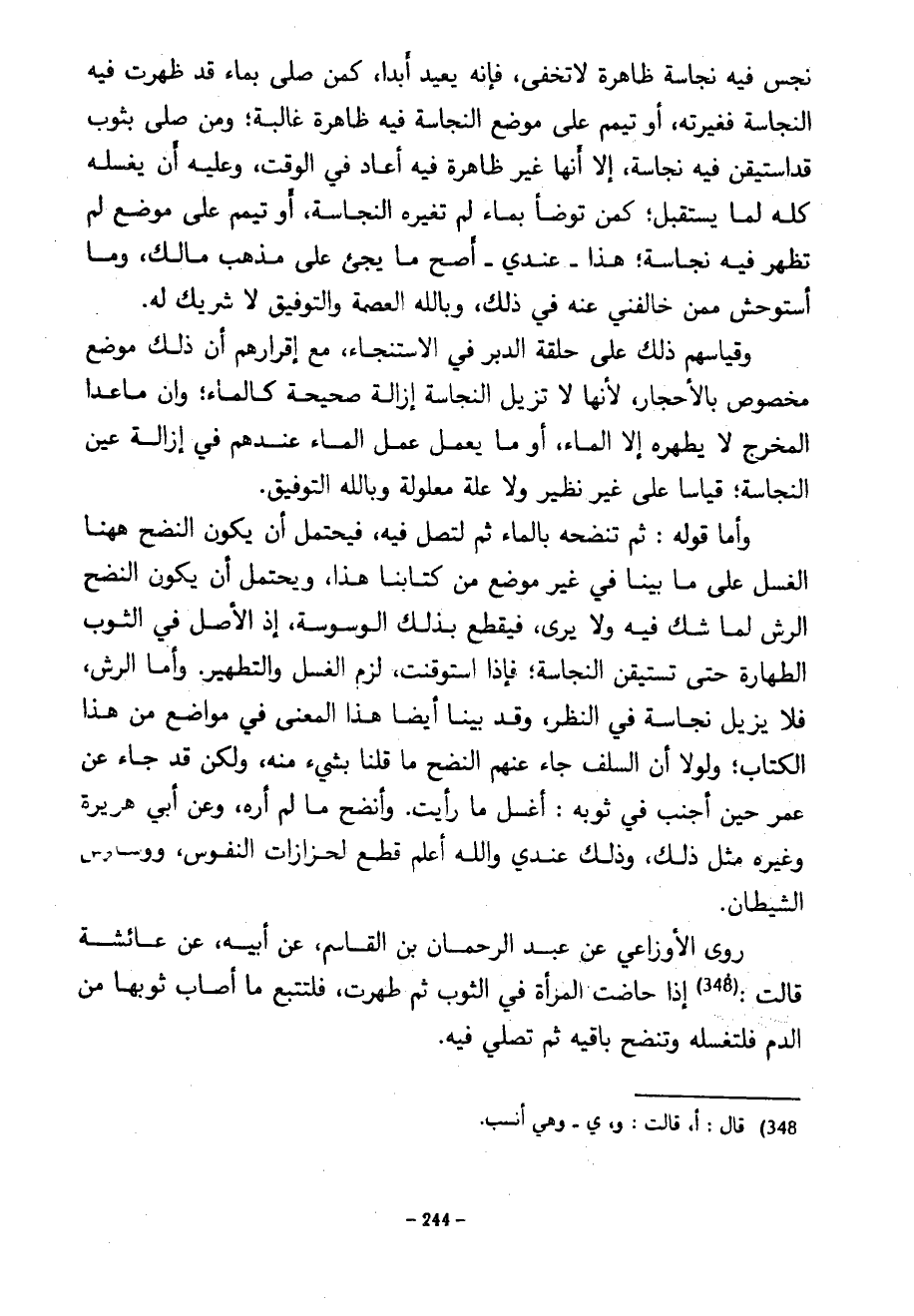نَجِسٍ فِيهِ نَجَاسَةٌ ظَاهِرَةٌ لَا تُخْفَى فَإِنَّهُ يُعِيدُ أَبَدًا كَمَنْ صَلَّى بِمَاءٍ قَدْ ظَهَرَتْ فِيهِ النَّجَاسَةُ فَغَيَّرَتْهُ أَوْ تَيَمَّمَ عَلَى مَوْضِعٍ النَّجَاسَةُ فِيهِ ظَاهِرَةٌ غَالِبَةٌ وَمَنْ صَلَّى بِثَوْبٍ قَدِ اسْتَيْقَنَ فِيهِ نَجَاسَةً إِلَّا أَنَّهَا غَيْرُ ظَاهِرَةٍ فِيهِ أَعَادَ فِي الْوَقْتِ وَعَلَيْهِ أَنْ يَغْسِلَهُ كُلَّهُ لِمَا يَسْتَقْبِلُ كَمَنْ تَوَضَّأَ بِمَاءٍ لَمْ تُغَيِّرْهُ النَّجَاسَةُ أَوْ تَيَمَّمَ عَلَى مَوْضِعٍ لَمْ تَظْهَرْ فِيهِ نَجَاسَةٌ هَذَا عِنْدِي أَصَحُّ مَا يَجِيءُ عَلَى مَذْهَبِ مَالِكٍ وَمَا أَسْتَوْحِشُ مِمَّنْ خَالَفَنِي عَنْهُ فِي ذَلِكَ وَبِاللَّهِ الْعِصْمَةُ وَالتَّوْفِيقُ لَا شَرِيكَ لَهُ وَقِيَاسُهُمْ ذَلِكَ عَلَى حَلْقَةِ الدُّبُرِ فِي الِاسْتِنْجَاءِ مَعَ إِقْرَارِهِمْ أَنَّ ذَلِكَ مَوْضِعٌ مَخْصُوصٌ بِالْأَحْجَارِ لِأَنَّهَا لَا تُزِيلُ النَّجَاسَةَ إِزَالَةً صَحِيحَةً كَالْمَاءِ وَإِنَّ مَا عَدَا الْمَخْرَجَ لَا يُطَهِّرُهُ إِلَّا الْمَاءُ أَوْ مَا يَعْمَلُ عَمَلَ الْمَاءِ عِنْدَهُمْ فِي إِزَالَةِ عَيْنِ النَّجَاسَةِ قِيَاسًا عَلَى غَيْرِ نَظِيرٍ وَلَا عِلَّةٍ مَعْلُولَةٍ وَبِاللَّهِ التَّوْفِيقُ وَأَمَّا قَوْلُهُ ثُمَّ تَنْضَحْهُ بِالْمَاءِ ثُمَّ لْتُصَلِّ فِيهِ فَيُحْتَمَلُ أَنْ يَكُونَ النضح ههنا الْغَسْلَ عَلَى مَا بَيَّنَّا فِي غَيْرِ مَوْضِعٍ مِنْ كِتَابِنَا هَذَا وَيُحْتَمَلُ أَنْ يَكُونَ النَّضْحُ الرَّشَّ لِمَا شَكَّ فِيهِ وَلَا يَرَى فَيَقْطَعُ بِذَلِكَ الْوَسْوَسَةَ إِذِ الْأَصْلُ فِي الثَّوْبِ الطَّهَارَةُ حَتَّى تَسْتَيْقِنَ النَّجَاسَةَ فَإِذَا اسْتُوقِنَتْ لَزِمَ الْغَسْلُ وَالتَّطْهِيرُ وَأَمَّا الرَّشُّ فَلَا يُزِيلُ نَجَاسَةً فِي النَّظَرِ وَقَدْ بَيَّنَّا أَيْضًا هَذَا الْمَعْنَى فِي مَوَاضِعَ مِنْ هَذَا الْكِتَابِ وَلَوْلَا أَنَّ السَّلَفَ جَاءَ عَنْهُمُ النَّضْحُ مَا قُلْنَا بِشَيْءٍ مِنْهُ وَلَكِنْ قَدْ جَاءَ عَنْ عُمَرَ حِينَ أَجْنَبَ فِي ثَوْبِهِ أَغْسِلُ مَا رَأَيْتُ وَأَنْضَحُ مَا لَمْ أَرَهُ وَعَنْ أَبِي هُرَيْرَةَ وَغَيْرِهِ مِثْلُ ذَلِكَ وَذَلِكَ عِنْدِي وَاللَّهُ أَعْلَمُ قَطْعٌ لِحَزَازَاتِ النُّفُوسِ وَوَسَاوِسِ الشَّيْطَانِ رَوَى الْأَوْزَاعِيُّ عَنْ عَبْدِ الرحمان بْنِ الْقَاسِمِ عَنْ أَبِيهِ عَنْ عَائِشَةَ قَالَتْ إِذَا حَاضَتِ الْمَرْأَةُ فِي الثَّوْبِ ثُمَّ طَهُرَتْ فَلْتَتْبَعْ مَا أَصَابَ ثَوْبَهَا مِنَ الدَّمِ فَلْتَغْسِلْهُ وَتَنْضَحْ بَاقِيَهُ ثُمَّ تُصَلِّي فِيهِ
