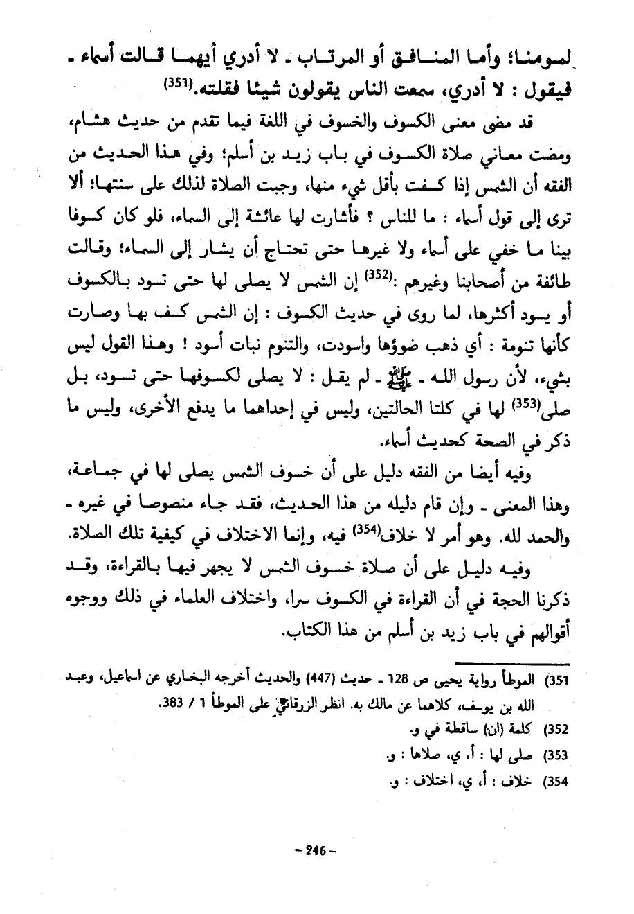 لَمُؤْمِنًا وَأَمَّا الْمُنَافِقُ أَوِ الْمُرْتَابُ لَا أَدْرِي أَيُّهُمَا قَالَتْ أَسْمَاءُ فَيَقُولُ لَا أَدْرِي سَمِعْتُ النَّاسَ يَقُولُونَ شَيْئًا فَقُلْتُهُ قَدْ مَضَى مَعْنَى الْكُسُوفِ وَالْخُسُوفِ فِي اللُّغَةِ فِيمَا تَقَدَّمَ مِنْ حَدِيثِ هِشَامٍ وَمَضَتْ مَعَانِي صَلَاةِ الْكُسُوفِ فِي بَابِ زَيْدِ بْنِ أَسْلَمَ وَفِي هَذَا الْحَدِيثِ مِنَ الْفِقْهِ أَنَّ الشَّمْسَ إِذَا كُسِفَتْ بِأَقَلِّ شَيْءٍ مِنْهَا وَجَبَتِ الصَّلَاةُ لِذَلِكَ عَلَى سُنَّتِهَا أَلَا تَرَى إِلَى قَوْلِ أَسْمَاءَ مَا لِلنَّاسِ فَأَشَارَتْ لَهَا عَائِشَةُ إِلَى السَّمَاءِ فَلَوْ كَانَ كُسُوفًا بَيِّنًا مَا خَفِيَ عَلَى أَسْمَاءَ وَلَا غَيْرِهَا حَتَّى تَحْتَاجَ أَنْ يُشَارَ إِلَى السَّمَاءِ وَقَالَتْ طَائِفَةٌ مِنْ أَصْحَابِنَا وَغَيْرِهِمْ إِنَّ الشَّمْسَ لَا يُصَلَّى لَهَا حَتَّى تَسْوَدَّ بِالْكُسُوفِ أَوْ يَسْوَدَّ أَكْثَرُهَا لِمَا رُوِيَ فِي حَدِيثِ الْكُسُوفِ إِنَّ الشَّمْسَ كَسْفٌ بِهَا وَصَارَتْ كَأَنَّهَا تَنُّومَةٌ أَيْ ذَهَبَ ضَوْؤُهَا وَاسْوَدَّتْ وَالتَّنُّومُ نَبَاتٌ أَسْوَدُ وَهَذَا الْقَوْلُ لَيْسَ بِشَيْءٍ لِأَنَّ رَسُولَ اللَّهِ صَلَّى اللَّهُ عَلَيْهِ وَسَلَّمَ لَمْ يَقُلْ لَا يُصَلَّى لِكُسُوفِهَا حَتَّى تَسْوَدَّ بَلْ صَلَّى لَهَا فِي كِلْتَا الْحَالَتَيْنِ وَلَيْسَ فِي إِحْدَاهِمَا مَا يَدْفَعُ الْأُخْرَى وَلَيْسَ مَا ذُكِرَ فِي الصِّحَّةِ كَحَدِيثِ أَسْمَاءَ وَفِيهِ أَيْضًا مِنَ الْفِقْهِ دَلِيلٌ عَلَى أَنَّ خُسُوفَ الشَّمْسِ يُصَلِّي لَهَا فِي جَمَاعَةٍ وَهَذَا الْمَعْنَى وَإِنْ قَامَ دَلِيلُهُ مِنْ هَذَا الْحَدِيثِ فَقَدْ جَاءَ مَنْصُوصًا فِي غَيْرِهِ وَالْحَمْدُ لِلَّهِ وَهُوَ أَمْرٌ لَا خِلَافَ فِيهِ وَإِنَّمَا الِاخْتِلَافُ فِي كَيْفِيَّةِ تِلْكَ الصَّلَاةِ وَفِيهِ دَلِيلٌ عَلَى أَنَّ صَلَاةَ خُسُوفِ الشَّمْسِ لَا يُجْهَرُ فِيهَا بِالْقِرَاءَةِ وَقَدْ ذَكَرْنَا الْحُجَّةَ فِي أَنَّ الْقِرَاءَةَ فِي الْكُسُوفِ سِرًّا وَاخْتِلَافَ الْعُلَمَاءِ فِي ذَلِكَ وَوُجُوهُ أَقْوَالِهِمْ فِي بَابِ زَيْدِ بْنِ أَسْلَمَ مِنْ هَذَا الْكِتَابِ