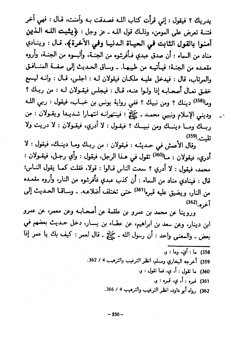 يُدْرِيكَ فَيَقُولُ إِنِّي قَرَأْتُ كِتَابَ اللَّهِ فَصَدَّقْتُ بِهِ وَآمَنْتُ قَالَ فَهِيَ آخِرُ فِتْنَةٍ تُعْرَضُ عَلَى الْمُؤْمِنِ وَذَلِكَ قَوْلُ اللَّهِ عَزَّ وَجَلَّ يُثَبِّتُ اللَّهُ الَّذِينَ آمَنُوا بِالْقَوْلِ الثَّابِتِ فِي الْحَيَاةِ الدُّنْيَا وَفِي الْآخِرَةِ قَالَ وَيُنَادِي مُنَادٍ من السماء أن صدق عبيد فَأَفْرِشُوهُ مِنَ الْجَنَّةِ وَأَلْبِسُوهُ مِنَ الْجَنَّةِ وَأَرُوهُ مَقْعَدَهُ مِنَ الْجَنَّةِ فَيَأْتِيهِ مِنْ طِيبِهَا وَسَاقَ الْحَدِيثَ إِلَى صِفَةِ الْمُنَافِقِ وَالْمُرْتَابِ قَالَ فَيَدْخُلُ عَلَيْهِ مَلَكَانِ فَيَقُولَانِ لَهُ اجْلِسْ قَالَ وَإِنَّهُ ليسمع خفق نعال أصحابه إذ وَلَّوْا عَنْهُ قَالَ فَيَجْلِسُ فَيَقُولَانِ لَهُ مَنْ رَبُّكَ وَمَا دِينُكَ وَمَنْ نَبِيُّكَ فَفِي رِوَايَةِ يُونُسَ بْنِ خَبَّابٍ فَيَقُولُ رَبِّيَ اللَّهُ وَدِينِي الْإِسْلَامُ وَنَبِيِّي مُحَمَّدٌ صَلَّى اللَّهُ عَلَيْهِ وَسَلَّمَ فَيَنْتَهِرَانِهِ انْتِهَارًا شَدِيدًا وَيَقُولَانِ مَنْ رَبُّكَ وَمَا دينك ومن نبيك فقول لَا أَدْرِي فَيَقُولَانِ لَا دَرَيْتَ وَلَا تَلَيْتَ وَقَالَ الْأَعْمَشُ فِي حَدِيثِهِ فَيَقُولَانِ مَنْ رَبُّكَ وما دينك فيقول لاأدري فَيَقُولَانِ مَا تَقُولُ فِي هَذَا الرَّجُلِ فَيَقُولُ وَأَيُّ رَجُلٍ فَيَقُولَانِ مُحَمَّدٌ فَيَقُولُ لَا أَدْرِي سَمِعْتُ النَّاسَ قَالُوا قَوْلًا فَقُلْتُ كَمَا يَقُولُ النَّاسُ قَالَ فَيُنَادِي مُنَادٍ مِنَ السَّمَاءِ أَنْ كَذَبَ عَبْدِي فَأَفْرِشُوهُ مِنَ النَّارِ وَأَرُوهُ مَقْعَدَهُ مِنَ النَّارِ وَيُضَيَّقُ عَلَيْهِ قَبْرُهُ حَتَّى تَخْتَلِفَ أَضْلَاعُهُ وَسَاقَا الْحَدِيثَ إِلَى آخِرِهِ وَرُوِّينَا عَنْ مُحَمَّدِ بْنِ عَمْرِو بْنِ عَلْقَمَةَ عَنْ أَصْحَابِهِ وعن معمر عن عمرو ابن دِينَارٍ وَعَنْ سَعْدُ بْنُ إِبْرَاهِيمَ عَنْ عَطَاءِ بْنِ يَسَارٍ دَخَلَ حَدِيثُ بَعْضِهِمْ فِي بَعْضٍ وَالْمَعْنَى وَاحِدٌ أَنَّ رَسُولَ اللَّهِ صَلَّى اللَّهُ عَلَيْهِ وَسَلَّمَ قَالَ لِعُمَرَ كَيْفَ بِكَ يَا عمر إذا