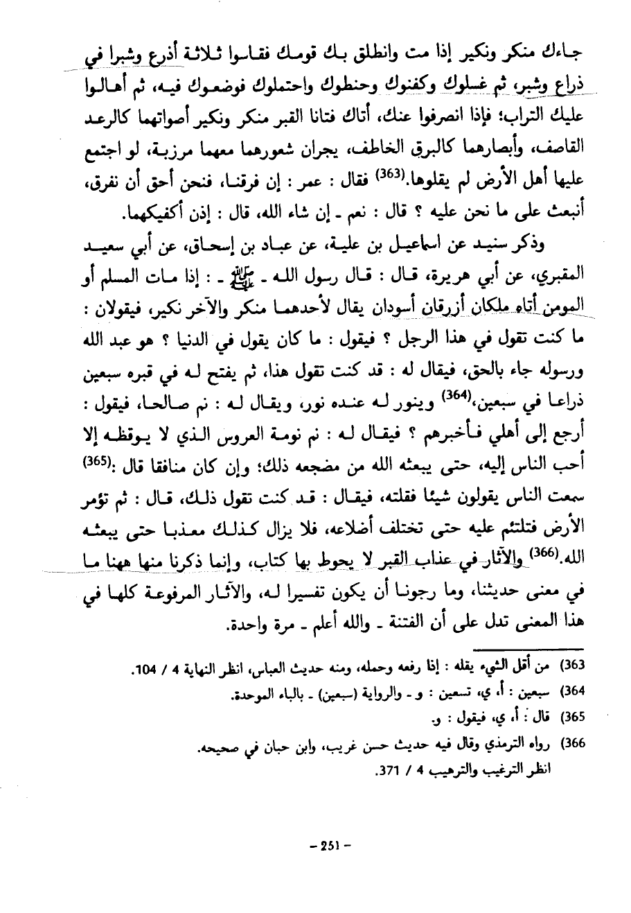 جَاءَكَ مُنْكَرٌ وَنَكِيرٌ إِذَا مِتَّ وَانْطَلَقَ بِكَ قَوْمُكَ فَقَاسُوا ثَلَاثَةَ أَذْرُعٍ وَشِبْرًا فِي ذِرَاعٍ وَشِبْرٍ ثُمَّ غَسَّلُوكَ وَكَفَّنُوكَ وَحَنَّطُوكَ وَاحْتَمَلُوكَ فَوَضَعُوكَ فِيهِ ثُمَّ أَهَالُوا عَلَيْكَ التُّرَابَ فَإِذَا انْصَرَفُوا عَنْكَ أَتَاكَ فَتَّانَا الْقَبْرِ مُنْكَرٌ وَنَكِيرٌ أَصْوَاتُهُمَا كَالرَّعْدِ الْقَاصِفِ وَأَبْصَارُهُمَا كَالْبَرْقِ الْخَاطِفِ يَجُرَّانِ شُعُورَهُمَا مَعَهُمَا مِرْزَبَّةٌ لَوِ اجْتَمَعَ عَلَيْهَا أَهْلُ الْأَرْضِ لَمْ يُقِلُّوهَا فَقَالَ عُمَرُ إِنْ فَرَقْنَا فَنَحْنُ أَحَقُّ أَنْ نَفْرُقَ أَنُبْعَثُ عَلَى مَا نَحْنُ عَلَيْهِ قَالَ نَعَمْ إِنْ شَاءَ اللَّهُ قَالَ إذن أكفيكهما وذكر سنيد عن إسماعيل بن عُلَيَّةَ عَنْ عَبَّادِ بْنِ إِسْحَاقَ عَنْ أَبِي سَعِيدٍ الْمَقْبُرِيِّ عَنْ أَبِي هُرَيْرَةَ قَالَ قَالَ رَسُولُ اللَّهِ صَلَّى اللَّهُ عَلَيْهِ وَسَلَّمَ إِذَا مَاتَ الْمُسْلِمُ أَوِ الْمُؤْمِنُ أَتَاهُ مَلَكَانِ أَزْرَقَانِ أَسْوَدَانِ يُقَالُ لِأَحَدِهِمَا مُنْكَرٌ وَالْآخَرُ نَكِيرٌ فَيَقُولَانِ مَا كُنْتَ تَقُولُ فِي هَذَا الرَّجُلِ فَيَقُولُ مَا كَانَ يَقُولُ فِي الدُّنْيَا هُوَ عَبْدُ اللَّهِ وَرَسُولُهُ جَاءَ بِالْحَقِّ فَيُقَالُ لَهُ قَدْ كُنْتَ تَقُولُ هَذَا ثُمَّ يُفْتَحُ لَهُ فِي قَبْرِهِ سَبْعِينَ ذِرَاعًا فِي سَبْعِينَ وَيُنَوَّرُ لَهُ عِنْدَهُ نُورٌ وَيُقَالُ لَهُ نَمْ صَالِحًا فَيَقُولُ أَرْجِعُ إِلَى أَهْلِي فَأُخْبِرُهُمْ فَيُقَالُ لَهُ نَمْ نَوْمَةَ الْعَرُوسِ الَّذِي لَا يُوقِظُهُ إِلَّا أَحَبُّ النَّاسِ إِلَيْهِ حَتَّى يَبْعَثَهُ اللَّهُ مِنْ مَضْجَعِهِ ذَلِكَ وَإِنْ كَانَ مُنَافِقًا قَالَ سَمِعْتُ النَّاسَ يَقُولُونَ شَيْئًا فَقُلْتُهُ فَيُقَالُ قَدْ كُنْتَ تَقُولُ ذَلِكَ قَالَ ثُمَّ تُؤْمَرُ الْأَرْضُ فَتَلْتَئِمُ عَلَيْهِ حَتَّى تَخْتَلِفَ أَضْلَاعُهُ فَلَا يَزَالُ كَذَلِكَ مُعَذَّبًا حَتَّى يَبْعَثَهُ اللَّهُ وَالْآثَارُ فِي عَذَابِ الْقَبْرِ لَا يَحُوطُ بِهَا كِتَابٌ وَإِنَّمَا ذَكَرْنَا مِنْهَا ههنا مَا فِي مَعْنَى حَدِيثِنَا وَمَا رَجَوْنَا أَنْ يَكُونَ تَفْسِيرًا لَهُ وَالْآثَارُ الْمَرْفُوعَةُ كُلُّهَا فِي هَذَا الْمَعْنَى تَدُلُّ عَلَى أَنَّ الْفِتْنَةَ وَاللَّهُ أَعْلَمُ مَرَّةٌ وَاحِدَةٌ