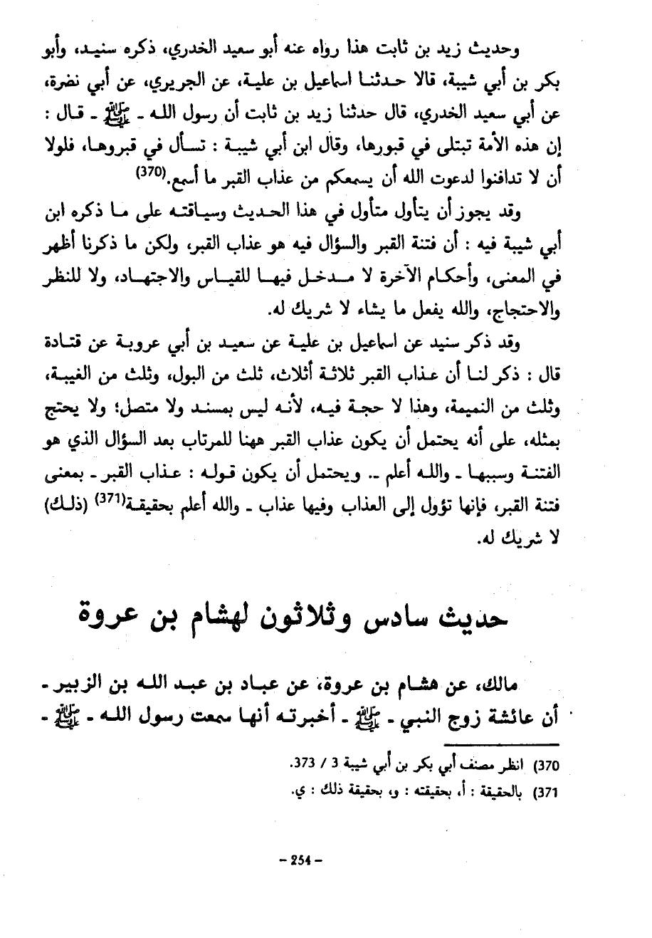 وَحَدِيثُ زَيْدِ بْنِ ثَابِتٍ هَذَا رَوَاهُ عَنْهُ أَبُو سَعِيدٍ الْخُدْرِيُّ ذَكَرَهُ سُنَيْدٌ وَأَبُو بَكْرِ بْنُ أَبِي شَيْبَةَ قَالَا حَدَّثَنَا إِسْمَاعِيلُ بْنُ عُلَيَّةَ عَنِ الْجُرَيْرِيِّ عَنْ أَبِي نَضْرَةَ عَنْ أَبِي سَعِيدٍ الْخُدْرِيِّ قَالَ حَدَّثَنَا زَيْدِ بْنِ ثَابِتٍ أَنَّ رَسُولَ اللَّهِ صَلَّى اللَّهُ عَلَيْهِ وَسَلَّمَ قَالَ إِنَّ هَذِهِ الْأُمَّةَ تُبْتَلَى فِي قُبُورِهَا وَقَالَ ابْنُ أَبِي شَيْبَةَ تُسْأَلُ فِي قبروها فَلَوْلَا أَنْ لَا تَدَافَنُوا لَدَعَوْتُ اللَّهَ أَنْ يُسْمِعَكُمْ مِنْ عَذَابِ الْقَبْرِ مَا أَسْمَعُ وَقَدْ يَجُوزُ أَنْ يَتَأَوَّلَ مُتَأَوِّلٌ فِي هَذَا الْحَدِيثِ وَسِيَاقَتِهِ عَلَى مَا ذَكَرَهُ ابْنُ أَبِي شَيْبَةَ فِيهِ أَنَّ فِتْنَةَ الْقَبْرِ وَالسُّؤَالِ فِيهِ هُوَ عَذَابُ الْقَبْرِ وَلَكِنْ مَا ذَكَرْنَا أَظْهَرُ فِي الْمَعْنَى وَأَحْكَامُ الْآخِرَةِ لَا مَدْخَلَ فِيهَا لِلْقِيَاسِ وَالِاجْتِهَادِ وَلَا لِلنَّظَرِ وَالِاحْتِجَاجِ وَاللَّهُ يَفْعَلُ مَا يَشَاءُ لَا شَرِيكَ لَهُ وَقَدْ ذَكَرَ سُنَيْدٌ عَنْ إِسْمَاعِيلَ بْنِ عُلَيَّةِ عَنْ سَعِيدِ بْنِ أَبِي عَرُوبَةَ عَنْ قَتَادَةَ قَالَ ذَكَرَ لَنَا أَنَّ عَذَابَ الْقَبْرِ ثَلَاثَةُ أَثْلَاثٍ ثُلُثٌ مِنَ الْبَوْلِ وَثُلُثٌ مِنَ الْغِيبَةِ وَثُلُثٌ مِنَ النَّمِيمَةِ وَهَذَا لَا حُجَّةَ فِيهِ لِأَنَّهُ لَيْسَ بِمُسْنَدٍ وَلَا مُتَّصِلٍ وَلَا يُحْتَجُّ بِمِثْلِهِ عَلَى أَنَّهُ يحتمل أن يكون عذاب القبر ههنا لِلْمُرْتَابِ بَعْدَ السُّؤَالِ الَّذِي هُوَ الْفِتْنَةُ وَسَبَبُهَا وَاللَّهُ أَعْلَمُ وَيُحْتَمَلُ أَنْ يَكُونَ قَوْلُهُ عَذَابُ القبر بمعنى فتنة القبر فإنها تؤول إِلَى الْعَذَابِ وَفِيهَا عَذَابٌ وَاللَّهُ أَعْلَمُ بِحَقِيقَةِ (ذَلِكَ) لَا شَرِيكَ لَهُ