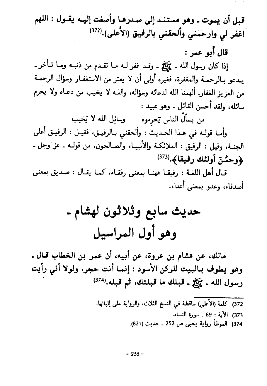حَدِيثٌ سَابِعٌ وَثَلَاثُونَ لِهِشَامٍ وَهُوَ أَوَّلُ الْمَرَاسِيلِ مَالِكٍ عَنْ هِشَامِ بْنِ عُرْوَةَ عَنْ أَبِيهِ أَنَّ عُمَرَ بْنَ الْخَطَّابِ قَالَ وَهُوَ يَطُوفُ بِالْبَيْتِ لِلرُّكْنِ الْأَسْوَدِ إِنَّمَا أَنْتَ حَجَرٌ وَلَوْلَا إِنِّي رَأَيْتُ رَسُولَ اللَّهِ صَلَّى اللَّهُ عَلَيْهِ وَسَلَّمَ قَبَّلَكَ مَا قَبَّلْتُكَ ثم قبلة
