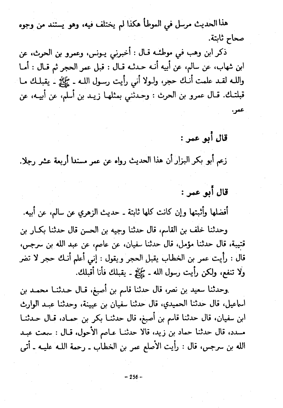 هَذَا الْحَدِيثُ مُرْسَلٌ فِي الْمُوَطَّأِ هَكَذَا لَمْ يُخْتَلَفْ فِيهِ وَهُوَ يَسْتَنِدُ مِنْ وُجُوهٍ صِحَاحٍ ثَابِتَةٍ ذَكَرَ ابْنُ وَهْبٍ فِي مُوَطَّئِهِ قَالَ أخبرني يونس وعمرو بن الحرث عَنِ ابْنِ شِهَابٍ عَنْ سَالِمٍ عَنْ أَبِيهِ أَنَّهُ حَدَّثَهُ قَالَ قَبَّلَ عُمَرُ الْحَجَرَ ثُمَّ قَالَ أَمَا وَاللَّهِ لَقَدْ عَلِمْتُ أَنَّكَ حَجَرٌ وَلَوْلَا إِنِّي رَأَيْتُ رَسُولَ اللَّهِ صَلَّى اللَّهُ عَلَيْهِ وَسَلَّمَ يُقَبِّلُكَ مَا قَبَّلْتُكَ قَالَ عَمْرُو بن الحرث وَحَدَّثَنِي بِمِثْلِهَا زَيْدِ بْنِ أَسْلَمَ عَنْ أَبِيهِ عَنْ عُمَرَ قَالَ أَبُو عُمَرَ زَعَمَ أَبُو بَكْرٍ الْبَزَّارُ أَنَّ هَذَا الْحَدِيثَ رَوَاهُ عَنْ عُمَرَ مُسْنَدًا أَرْبَعَةَ عَشَرَ رَجُلًا قَالَ أَبُو عُمَرَ أَفْضَلُهَا وَأَثْبَتُهَا وَإِنْ كَانَتْ كُلُّهَا ثَابِتَةً حَدِيثُ الزُّهْرِيِّ عَنْ سَالِمٍ عَنْ أَبِيهِ وَحَدَّثَنَا خَلَفُ بْنُ الْقَاسِمِ قَالَ حَدَّثَنَا وَجِيهُ بْنُ الْحَسَنِ قَالَ حَدَّثَنَا بَكَّارُ بْنُ قُتَيْبَةَ قَالَ حَدَّثَنَا مُؤَمَّلٌ قَالَ حَدَّثَنَا سُفْيَانُ عَنْ عَاصِمٍ عَنْ عَبْدِ اللَّهِ بْنِ سَرْجِسَ قَالَ رَأَيْتُ عُمَرَ بْنَ الْخَطَّابِ يُقَبِّلُ الْحَجَرَ وَيَقُولُ إِنِّي أَعْلَمُ أَنَّكَ حَجَرٌ لَا تَضُرُّ وَلَا تَنْفَعُ وَلَكِنْ رَأَيْتُ رَسُولَ اللَّهِ صَلَّى اللَّهُ عَلَيْهِ وَسَلَّمَ يُقَبِّلُكَ فَأَنَا أُقَبِّلُكَ وَحَدَّثَنَا سَعِيدُ بْنُ نَصْرٍ قَالَ حَدَّثَنَا قَاسِمُ بْنُ أَصْبَغَ قَالَ حَدَّثَنَا مُحَمَّدُ بْنُ إِسْمَاعِيلَ قَالَ حَدَّثَنَا الْحُمَيْدِيُّ قَالَ حَدَّثَنَا سُفْيَانُ بْنُ عُيَيْنَةَ وَحَدَّثَنَا عَبْدُ الْوَارِثِ بْنُ سُفْيَانَ قَالَ حَدَّثَنَا قَاسِمُ بْنُ أَصْبَغَ قَالَ حَدَّثَنَا بَكْرُ بْنُ حَمَّادٍ قَالَ حَدَّثَنَا مُسَدَّدٌ قَالَ حَدَّثَنَا حَمَّادُ بْنُ زَيْدٍ قَالَا حَدَّثَنَا عَاصِمٌ الْأَحْوَلُ قَالَ سَمِعْتُ عَبْدَ اللَّهِ بْنَ سَرْجِسَ قَالَ رَأَيْتُ الْأَصْلَعَ عُمَرَ بْنَ الْخَطَّابِ رَحْمَةُ اللَّهِ عَلَيْهِ أَتَى
