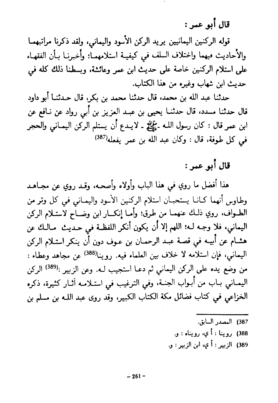 قَالَ أَبُو عُمَرَ قَوْلُهُ الرُّكْنَيْنِ الْيَمَانِيَّيْنِ يُرِيدُ الرُّكْنَ الْأَسْوَدَ وَالْيَمَانِيَّ وَلَقَدْ ذَكَرْنَا مَرَاتِبَهُمَا وَالْأَحَادِيثَ فِيهِمَا وَاخْتِلَافَ السَّلَفِ فِي كَيْفِيَّةِ اسْتِلَامِهِمَا وَأَخْبَرْنَا بِأَنَّ الْفُقَهَاءَ عَلَى اسْتِلَامِ الرُّكْنَيْنِ خَاصَّةً عَلَى حَدِيثِ ابْنِ عُمَرَ وَعَائِشَةَ وَبَسَطْنَا ذَلِكَ كُلَّهُ فِي حَدِيثِ ابْنِ شِهَابٍ وَغَيْرِهِ مِنْ هَذَا الْكِتَابِ حَدَّثَنَا عَبْدُ اللَّهِ بْنُ مُحَمَّدٍ قَالَ حَدَّثَنَا مُحَمَّدُ بْنُ بَكْرٍ قَالَ حَدَّثَنَا أَبُو دَاوُدَ قَالَ حَدَّثَنَا مُسَدَّدٌ قَالَ حَدَّثَنَا يَحْيَى بْنُ عَبْدُ الْعَزِيزِ بْنُ أَبِي رَوَّادٍ عَنْ نَافِعٍ عَنِ ابْنِ عُمَرَ قَالَ كَانَ رَسُولُ اللَّهِ صَلَّى اللَّهُ عَلَيْهِ وَسَلَّمَ لَا يَدَعُ أَنْ يَسْتَلِمَ الرُّكْنَ الْيَمَانِيَّ وَالْحَجَرَ فِي كُلِّ طَوْفَةٍ قَالَ وَكَانَ عَبْدُ اللَّهِ بْنُ عُمَرَ يَفْعَلُهُ قَالَ أَبُو عُمَرَ هَذَا أَفْضَلُ مَا رُوِيَ فِي هَذَا الْبَابِ وَأَوْلَاهُ وَأَصَحُّهُ وَقَدْ رُوِيَ عَنْ مُجَاهِدٍ وَطَاوُسٍ أَنَّهُمَا كَانَا يَسْتَحِبَّانِ اسْتِلَامَ الرُّكْنَيْنِ الْأَسْوَدِ وَالْيَمَانِيِّ فِي كُلِّ وَتْرٍ مِنَ الطَّوَافِ رُوِيَ ذَلِكَ عَنْهُمَا مِنْ طُرُقٍ وَأَمَّا إِنْكَارُ ابْنِ وَضَّاحٍ لِاسْتِلَامِ الرُّكْنِ الْيَمَانِيِّ فَلَا وَجْهَ لَهُ اللَّهُمَّ إِلَّا أَنْ يَكُونَ أَنْكَرَ اللَّفْظَةَ فِي حَدِيثِ مَالِكٍ عَنْ هِشَامٍ عن أبيه في قصة عبد الرحمان بْنِ عَوْفٍ دُونَ أَنْ يُنْكِرَ اسْتِلَامَ الرُّكْنِ الْيَمَانِيِّ فَإِنَّ اسْتِلَامَهُ لَا خِلَافَ بَيْنِ الْعُلَمَاءِ فِيهِ رُوِّينَا عَنْ مُجَاهِدٍ وَعَطَاءٍ مَنْ وَضَعَ يَدَهُ عَلَى الرُّكْنِ الْيَمَانِيِّ ثُمَّ دَعَا اسْتُجِيبَ لَهُ وَعَنِ الزُّبَيْرِ الرُّكْنُ الْيَمَانِيُّ بَابٌ مِنْ أَبْوَابِ الْجَنَّةِ وَفِي التَّرْغِيبِ فِي اسْتِلَامِهِ آثَارٌ كَثِيرَةٌ ذَكَرَهُ الْخُزَاعِيُّ فِي كِتَابِ فَضَائِلِ مَكَّةَ الْكِتَابُ الْكَبِيرِ وَقَدْ رَوَى عَبْدُ اللَّهِ بْنُ مسلم بن