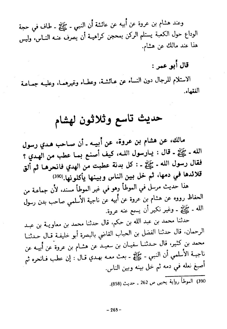 حَدِيثٌ تَاسِعٌ وَثَلَاثُونَ لِهِشَامٍ مَالِكٍ عَنْ هِشَامِ بْنِ عُرْوَةَ عَنْ أَبِيهِ أَنَّ صَاحِبَ هَدْيِ رَسُولِ اللَّهِ صَلَّى اللَّهُ عَلَيْهِ وَسَلَّمَ قَالَ يَا رَسُولَ اللَّهِ كَيْفَ أَصْنَعُ بِمَا عَطِبَ مِنَ الْهَدْيِ فَقَالَ رَسُولُ اللَّهِ صَلَّى اللَّهُ عَلَيْهِ وَسَلَّمَ كُلُّ بَدَنَةٍ عَطِبَتْ مِنَ الْهَدْيِ فَانْحَرْهَا ثُمَّ أَلْقِ قَلَائِدَهَا فِي دَمِهَا ثُمَّ خَلِّ بَيْنَ النَّاسِ وَبَيْنَهَا يَأْكُلُونَهَا هَذَا حَدِيثٌ مُرْسَلٌ فِي الْمُوَطَّأِ وَهُوَ فِي غَيْرِ الْمُوَطَّأِ مُسْنَدٌ لِأَنَّ جَمَاعَةً مِنَ الْحُفَّاظِ رَوَوْهُ عَنْ هِشَامِ بْنِ عُرْوَةَ عَنْ أَبِيهِ عَنْ نَاجِيَةَ الْأَسْلَمِيِّ صَاحِبِ بُدْنِ رَسُولِ اللَّهِ صَلَّى اللَّهُ عَلَيْهِ وَسَلَّمَ وَغَيْرُ نَكِيرٍ أَنْ يَسْمَعَ عَنْهُ عُرْوَةُ حَدَّثَنَا مُحَمَّدُ بْنُ عَبْدِ اللَّهِ بْنِ حَكَمٍ قَالَ حَدَّثَنَا مُحَمَّدُ بْنُ مُعَاوِيَةَ بْنِ عَبْدِ الرحمان قَالَ حَدَّثَنَا الْفَضْلُ بْنُ الْحُبَابِ الْقَاضِي بِالْبَصْرَةِ أَبُو خَلِيفَةَ قَالَ حَدَّثَنَا مُحَمَّدُ بْنُ كَثِيرٍ قَالَ حَدَّثَنَا سُفْيَانُ بْنُ سَعِيدٍ عَنْ هِشَامِ بْنِ عُرْوَةَ عَنْ أَبِيهِ عَنْ نَاجِيَةَ الْأَسْلَمِيِّ أَنَّ النَّبِيَّ صَلَّى اللَّهُ عَلَيْهِ وَسَلَّمَ بَعَثَ مَعَهُ بِهَدْيٍ قَالَ إِنْ عَطِبَ فَانْحَرْهُ ثُمَّ اصْبُغْ نَعْلَهُ فِي دَمِهِ ثُمَّ خَلِّ بَيْنَهُ وبين الناس