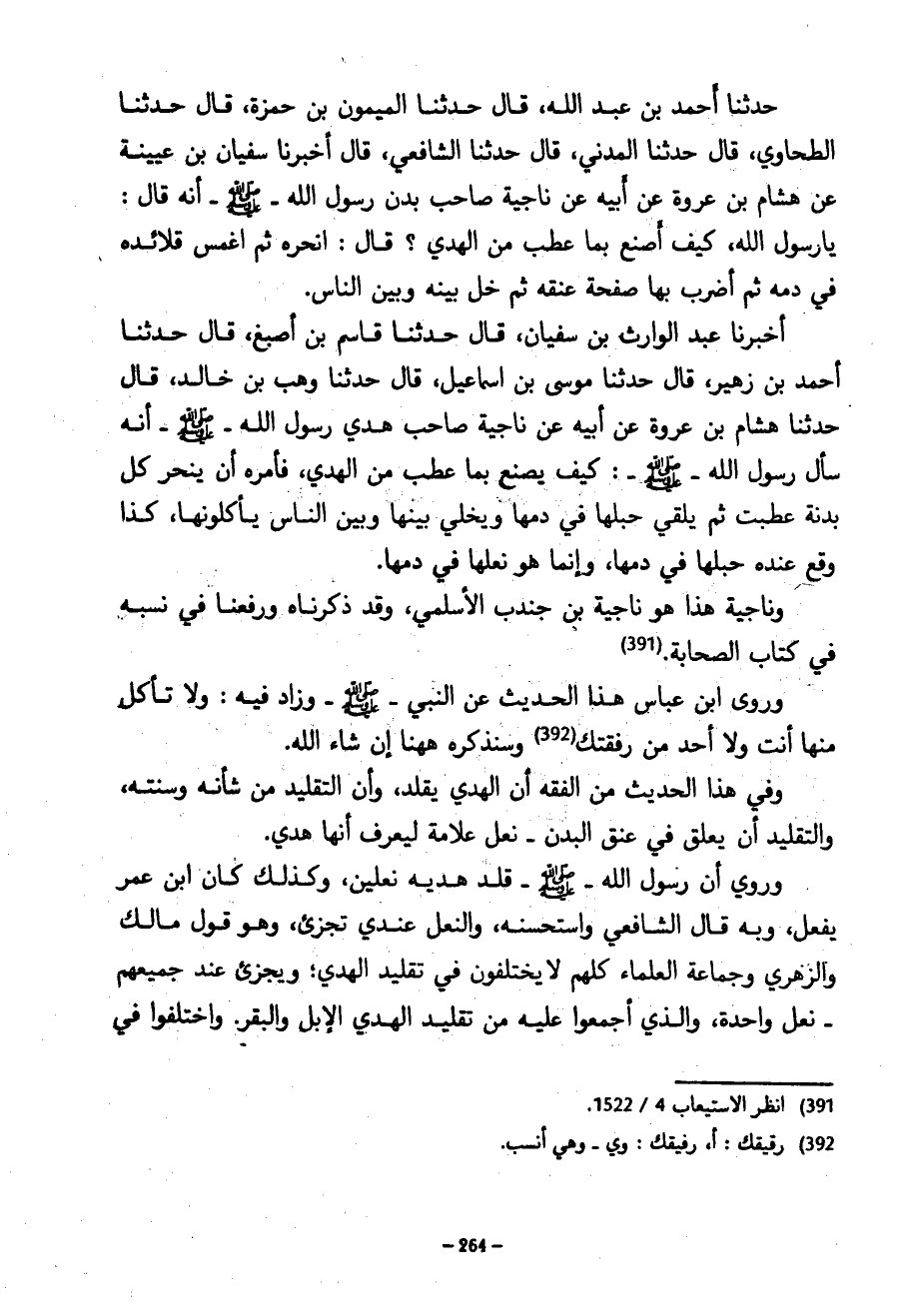 حَدَّثَنَا أَحْمَدُ بْنُ عَبْدِ اللَّهِ قَالَ حَدَّثَنَا الْمَيْمُونُ بْنُ حَمْزَةَ قَالَ حَدَّثَنَا الطَّحَاوِيُّ قَالَ حَدَّثَنَا الْمَدَنِيُّ قَالَ حَدَّثَنَا الشَّافِعِيُّ قَالَ أَخْبَرَنَا سُفْيَانُ بْنُ عُيَيْنَةَ عَنْ هِشَامِ بْنِ عُرْوَةَ عَنْ أَبِيهِ عَنْ نَاجِيَةَ صَاحِبِ بُدْنِ رَسُولِ اللَّهِ صَلَّى اللَّهُ عَلَيْهِ وَسَلَّمَ أَنَّهُ قَالَ يَا رَسُولَ اللَّهِ كَيْفَ أَصْنَعُ بِمَا عَطِبَ مِنَ الْهَدْيِ قَالَ انْحَرْهُ ثُمَّ اغْمِسْ قَلَائِدَهُ فِي دَمِهِ ثُمَّ اضْرِبْ بِهَا صَفْحَةَ عُنُقِهِ ثُمَّ خَلِّ بَيْنَهُ وَبَيْنَ النَّاسِ أَخْبَرَنَا عَبْدُ الْوَارِثِ بْنُ سُفْيَانَ قَالَ حَدَّثَنَا قَاسِمُ بْنُ أَصْبَغَ قَالَ حَدَّثَنَا أَحْمَدُ بْنُ زُهَيْرٍ قَالَ حَدَّثَنَا مُوسَى بْنُ إِسْمَاعِيلَ قَالَ حَدَّثَنَا وَهْبُ بْنُ خَالِدٍ قَالَ حَدَّثَنَا هِشَامُ بْنُ عُرْوَةَ عَنْ أَبِيهِ عَنْ نَاجِيَةَ صَاحِبِ هَدْيِ رَسُولِ اللَّهِ صَلَّى اللَّهُ عَلَيْهِ وَسَلَّمَ أَنَّهُ سَأَلَ رَسُولَ اللَّهِ صَلَّى اللَّهُ عَلَيْهِ وَسَلَّمَ كيف يَصْنَعُ بِمَا عَطِبَ مِنَ الْهَدْيِ فَأَمَرَهُ أَنْ يَنْحَرَ كُلَّ بَدَنَةٍ عَطِبَتْ ثُمَّ يُلْقِيَ حَبْلَهَا فِي دَمِهَا وَيُخَلِّيَ بَيْنَهَا وَبَيْنَ النَّاسِ يَأْكُلُونَهَا كَذَا وَقَعَ عِنْدَهُ حَبْلُهَا فِي دَمِهَا وَإِنَّمَا هُوَ نَعْلُهَا فِي دَمِهَا وَنَاجِيَةُ هَذَا هُوَ نَاجِيَةُ بْنُ جُنْدَبٍ الْأَسْلَمِيُّ وَقَدْ ذَكَرْنَاهُ وَرَفَعْنَا فِي نَسَبِهِ فِي كِتَابِ الصَّحَابَةِ وَرَوَى ابْنُ عَبَّاسٍ هَذَا الْحَدِيثَ عَنِ النَّبِيِّ صَلَّى اللَّهُ عَلَيْهِ وَسَلَّمَ وَزَادَ فِيهِ وَلَا تَأْكُلْ مِنْهَا أنت ولا أحد من رفقتك وسنذكره ههنا إِنْ شَاءَ اللَّهُ وَفِي هَذَا الْحَدِيثِ مِنَ الْفِقْهِ أَنَّ الْهَدْيَ يُقَلَّدُ وَأَنَّ التَّقْلِيدَ مِنْ شَأْنِهِ وَسُنَّتِهِ وَالتَّقْلِيدُ أَنْ يُعَلَّقَ فِي عُنُقِ الْبُدْنِ نَعْلٌ عَلَّامَةً لِيُعْرَفَ أَنَّهَا هَدْيٌ وَرُوِيَ أن رسول الله صلى الله عليه وسلم قَلَّدَ هَدْيَهُ نَعْلَيْنِ وَكَذَلِكَ كَانَ ابْنُ عُمَرَ يَفْعَلُ وَبِهِ قَالَ الشَّافِعِيُّ وَاسْتَحْسَنَهُ وَالنَّعْلُ عِنْدِي تُجْزِئُ وَهُوَ قَوْلُ مَالِكٍ وَالزُّهْرِيِّ وَجَمَاعَةِ الْعُلَمَاءِ كُلُّهُمْ لَا يَخْتَلِفُونَ فِي تَقْلِيدِ الْهَدْيِ وَيُجْزِئُ عِنْدَ جَمِيعِهِمْ نَعْلٌ وَاحِدَةٌ وَالَّذِي أَجْمَعُوا عَلَيْهِ مِنْ تَقْلِيدِ الْهَدْيِ الْإِبِلُ وَالْبَقَرُ وَاخْتَلَفُوا فِي