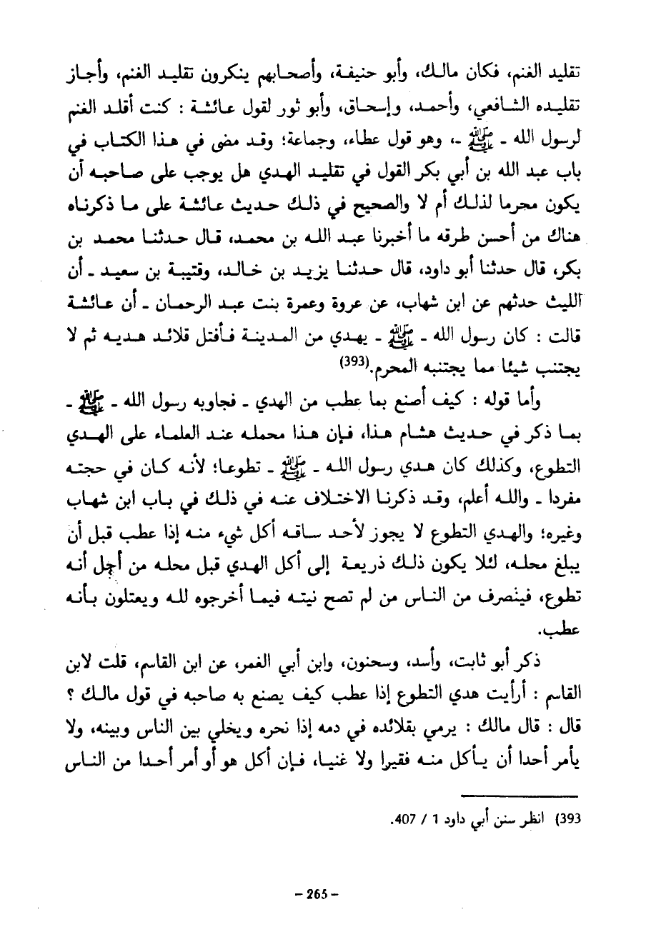 تَقْلِيدِ الْغَنَمِ فَكَانَ مَالِكٌ وَأَبُو حَنِيفَةَ وَأَصْحَابُهُمْ يُنْكِرُونَ تَقْلِيدَ الْغَنَمِ وَأَجَازَ تَقْلِيدَهُ الشَّافِعِيُّ وَأَحْمَدُ وَإِسْحَاقُ وَأَبُو ثَوْرٍ لِقَوْلِ عَائِشَةَ كُنْتُ أُقَلِّدُ الْغَنَمَ لِرَسُولِ اللَّهِ صَلَّى اللَّهُ عَلَيْهِ وَسَلَّمَ وَهُوَ قَوْلُ عَطَاءٍ وَجَمَاعَةٍ وَقَدْ مَضَى فِي هَذَا الْكِتَابِ فِي بَابِ عَبْدِ اللَّهِ بْنِ أَبِي بَكْرٍ الْقَوْلُ فِي تَقْلِيدِ الْهَدْيِ هَلْ يُوجِبُ عَلَى صَاحِبِهِ أَنْ يَكُونَ مُحْرِمًا لِذَلِكَ أَمْ لَا وَالصَّحِيحُ فِي ذَلِكَ حَدِيثُ عَائِشَةَ عَلَى مَا ذَكَرْنَاهُ هُنَاكَ مِنْ أَحْسَنِ طُرُقِهِ مَا أَخْبَرَنَا عَبْدُ اللَّهِ بْنُ مُحَمَّدٍ قَالَ حَدَّثَنَا مُحَمَّدُ بْنُ بَكْرٍ قَالَ حَدَّثَنَا أَبُو دَاوُدَ قَالَ حَدَّثَنَا يَزِيدُ بْنُ خَالِدٍ وَقُتَيْبَةُ بْنُ سَعِيدٍ أَنَّ اللَّيْثَ حَدَّثَهُمْ عَنِ ابْنِ شِهَابٍ عَنْ عُرْوَةَ وَعَمْرَةَ بِنْتِ عبد الرحمان أَنَّ عَائِشَةَ قَالَتْ كَانَ رَسُولُ اللَّهِ صَلَّى اللَّهُ عَلَيْهِ وَسَلَّمَ يَهْدِي مِنَ الْمَدِينَةِ فَأَفْتِلُ قَلَائِدَ هَدْيِهِ ثُمَّ لَا يَجْتَنِبُ شَيْئًا مِمَّا يَجْتَنِبُهُ الْمُحْرِمُ وَأَمَّا قَوْلُهُ كَيْفَ أَصْنَعُ بِمَا عَطِبَ مِنَ الْهَدْيِ فَجَاوَبَهُ رَسُولُ اللَّهِ صَلَّى اللَّهُ عَلَيْهِ وَسَلَّمَ بِمَا ذُكِرَ فِي حَدِيثِ هِشَامٍ هَذَا فَإِنَّ هَذَا مَحْمَلُهُ عِنْدَ الْعُلَمَاءِ عَلَى الْهَدْيِ التَّطَوُّعُ وَكَذَلِكَ كَانَ هَدْيِ رَسُولِ اللَّهِ صَلَّى اللَّهُ عَلَيْهِ وَسَلَّمَ تَطَوُّعًا لِأَنَّهُ كَانَ فِي حَجَّتِهِ مُفْرِدًا وَاللَّهُ أَعْلَمُ وَقَدْ ذَكَرْنَا الِاخْتِلَافَ عَنْهُ فِي ذَلِكَ فِي بَابِ ابْنِ شِهَابٍ وَغَيْرِهِ وَالْهَدْيُ التَّطَوُّعُ لَا يَجُوزُ لِأَحَدٍ سَاقَهُ أَكْلُ شَيْءٍ مِنْهُ إِذَا عَطِبَ قَبْلَ أَنْ يَبْلُغَ مَحِلَّهُ لِئَلَّا يَكُونَ ذَلِكَ ذَرِيعَةً إِلَى أَكْلِ الْهَدْيِ قَبْلَ مَحِلِّهِ مِنْ أَجْلِ أَنَّهُ تَطَوَّعَ فَيَنْصَرِفُ مِنَ النَّاسِ مَنْ لَمْ تَصِحَّ نِيَّتُهُ فِيمَا أَخْرَجُوهُ لِلَّهِ وَيَعْتَلُّونَ بِأَنَّهُ عَطِبٌ ذَكَرَ أَبُو ثَابِتٍ وَأَسَدٌ وَسَحْنُونٌ وَابْنُ أَبِي الْغَمْرِ عَنِ ابْنِ الْقَاسِمِ قُلْتُ لِابْنِ الْقَاسِمِ أَرَأَيْتَ هَدْيَ التَّطَوُّعِ إِذَا عَطِبَ كَيْفَ يَصْنَعُ بِهِ صَاحِبُهُ فِي قَوْلِ مَالِكٍ قَالَ قَالَ مَالِكٌ يَرْمِي بِقَلَائِدِهِ فِي دَمِهِ إذا نحره ويخلي بن النَّاسِ وَبَيْنَهُ وَلَا يَأْمُرُ أَحَدًا أَنْ يَأْكُلَ مِنْهُ فَقِيرًا وَلَا غَنِيًّا فَإِنْ أَكَلَ هُوَ أَوْ أَمَرَ أَحَدًا مِنَ النَّاسِ
