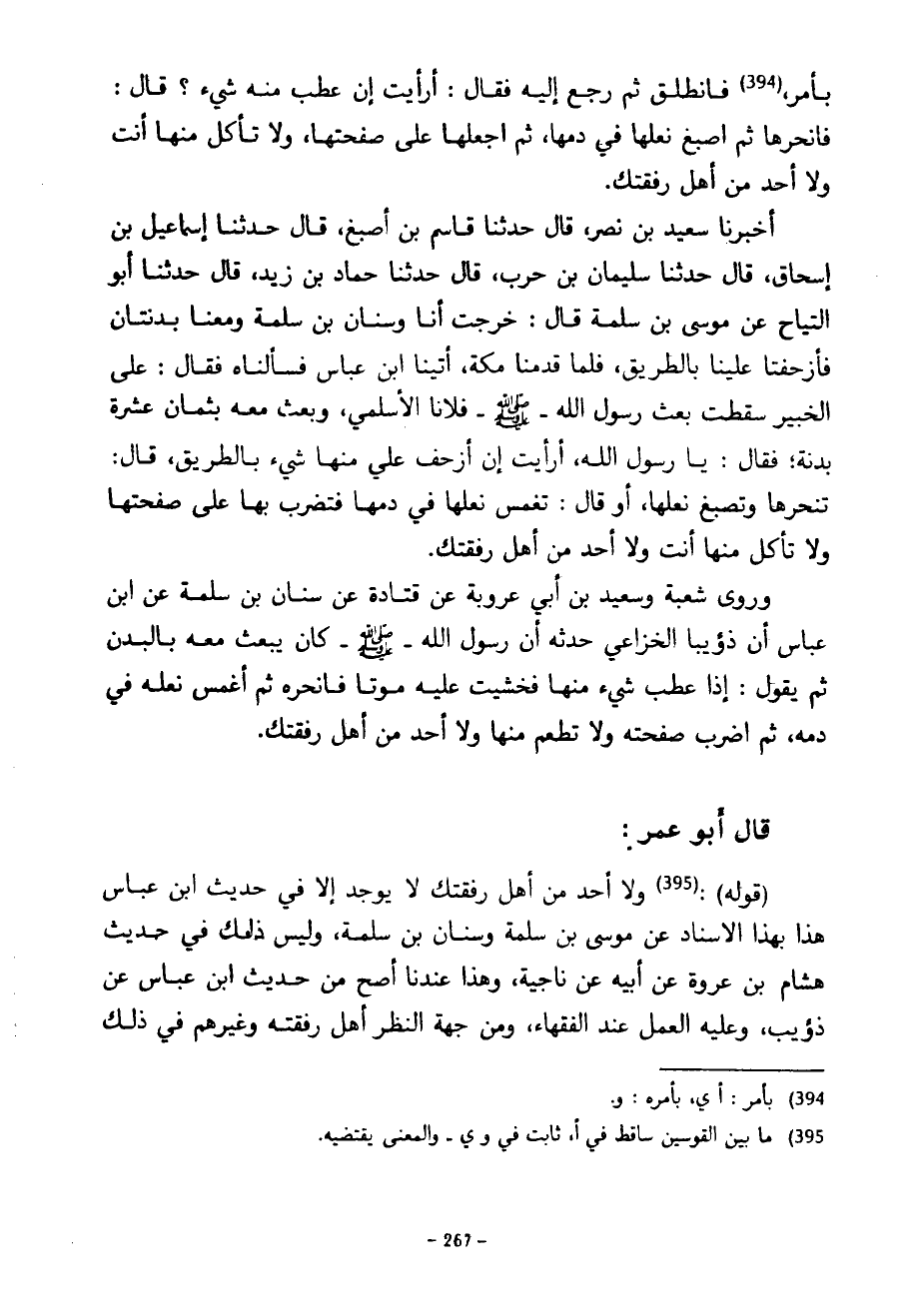 بِأَمْرٍ فَانْطَلَقَ ثُمَّ رَجَعَ إِلَيْهِ فَقَالَ أَرَأَيْتَ إِنْ عَطِبَ مِنْهُ شَيْءٌ قَالَ فَانْحَرْهَا ثُمَّ اصْبُغْ نَعْلَهَا فِي دَمِهَا ثُمَّ اجْعَلْهَا عَلَى صفحتها ولا تأكل منها أنت ولا أحد مِنْ أَهْلِ رُفْقَتِكَ أَخْبَرَنَا سَعِيدُ بْنُ نَصْرٍ قَالَ حَدَّثَنَا قَاسِمُ بْنُ أَصْبَغَ قَالَ حَدَّثَنَا إِسْمَاعِيلُ بْنُ إِسْحَاقَ قَالَ حَدَّثَنَا سُلَيْمَانُ بْنُ حَرْبٍ قَالَ حَدَّثَنَا حَمَّادُ بْنُ زَيْدٍ قَالَ حدثنا أبو النياح عَنْ مُوسَى بْنِ سَلَمَةَ قَالَ خَرَجْتُ أَنَا وَسِنَانُ بْنُ سَلَمَةَ وَمَعَنَا بَدَنَتَانِ فَأَزْحَفَتَا عَلَيْنَا بِالطَّرِيقِ فَلَمَّا قَدِمْنَا مَكَّةَ أَتَيْنَا ابْنَ عَبَّاسٍ فَسَأَلْنَاهُ فَقَالَ عَلَى الْخَبِيرِ سَقَطْتَ بَعَثَ رَسُولُ اللَّهِ صَلَّى اللَّهُ عَلَيْهِ وَسَلَّمَ فُلَانًا الْأَسْلَمِيَّ وبعث معه بثمان عشرة بدنة فَقَالَ يَا رَسُولَ اللَّهِ أَرَأَيْتَ إِنْ أُزْحِفَ عَلَيَّ مِنْهَا شَيْءٌ بِالطَّرِيقِ قَالَ تَنْحَرُهَا وَتَصْبُغُ نَعْلَهَا أَوْ قَالَ تَغْمِسُ نَعْلَهَا فِي دَمِهَا فَتَضْرِبُ بِهَا عَلَى صَفْحَتِهَا وَلَا تَأْكُلُ مِنْهَا أَنْتَ وَلَا أَحَدٌ مِنْ أَهْلِ رُفْقَتِكَ وَرَوَى شُعْبَةُ وَسَعِيدُ بْنُ أَبِي عَرُوبَةَ عَنْ قَتَادَةَ عَنْ سِنَانِ بْنِ سَلَمَةَ عَنِ ابْنِ عَبَّاسٍ أَنَّ ذُؤَيْبًا الْخُزَاعِيَّ حَدَّثَهُ أَنَّ رَسُولَ اللَّهِ صَلَّى اللَّهُ عَلَيْهِ وَسَلَّمَ كَانَ يَبْعَثُ مَعَهُ بِالْبُدْنِ ثُمَّ يَقُولُ إِذَا عَطِبَ شَيْءٌ مِنْهَا فَخَشِيتَ عَلَيْهِ مَوْتًا فَانْحَرْهُ ثُمَّ اغْمِسْ نَعْلَهُ فِي دَمِهِ ثُمَّ اضْرِبْ صَفْحَتَهُ وَلَا تُطْعِمْ مِنْهَا وَلَا أَحَدٌ مِنْ أَهْلِ رُفْقَتِكَ قَالَ أَبُو عُمَرَ (قَوْلُهُ) وَلَا أَحَدٌ مِنْ أَهْلِ رُفْقَتِكَ لَا يُوجَدُ إِلَّا فِي حَدِيثِ ابْنِ عَبَّاسٍ هَذَا بِهَذَا الْإِسْنَادِ عَنْ مُوسَى بْنِ سَلَمَةَ وَسِنَانِ بْنِ سَلَمَةَ وَلَيْسَ ذَلِكَ فِي حَدِيثِ هِشَامِ بْنِ عُرْوَةَ عَنْ أَبِي عَنْ نَاجِيَةَ وَهَذَا عِنْدَنَا أَصَحُّ مِنْ حَدِيثِ ابْنِ عَبَّاسٍ عَنْ ذُؤَيْبٍ وَعَلَيْهِ الْعَمَلُ عِنْدَ الْفُقَهَاءِ وَمِنْ جِهَةِ النَّظَرِ أَهْلُ رُفْقَتِهِ وَغَيْرُهُمْ فِي ذلك