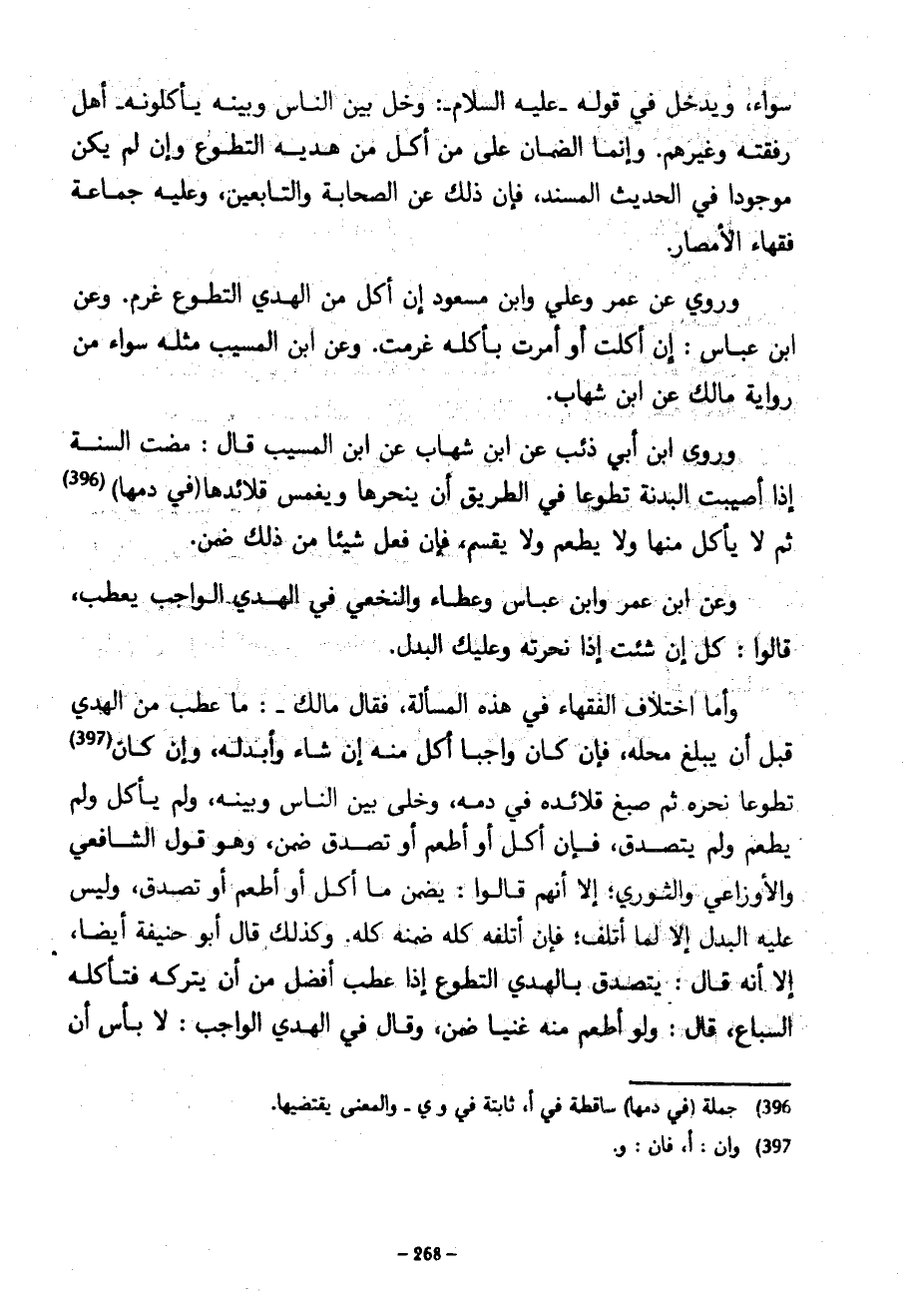 سَوَاءٌ وَيَدْخُلُ فِي قَوْلِهِ عَلَيْهِ السَّلَامُ وَخَلِّ بَيْنَ النَّاسِ وَبَيْنَهُ يَأْكُلُونَهُ أَهْلُ رُفْقَتِهِ وَغَيْرُهُمْ وَإِنَّمَا الضَّمَانُ عَلَى مَنْ أَكَلَ مِنْ هَدْيِهِ التطوع وإن لم يكن موجدا فِي الْحَدِيثِ الْمُسْنَدِ فَإِنَّ ذَلِكَ عَنِ الصَّحَابَةِ وَالتَّابِعِينَ وَعَلَيْهِ جَمَاعَةُ فُقَهَاءِ الْأَمْصَارِ وَرُوِيَ عَنْ عُمَرَ وَعَلِيٍّ وَابْنِ مَسْعُودٍ إِنْ أَكَلَ مِنَ الْهَدْيِ التَّطَوُّعِ غَرِمَ وَعَنِ ابْنِ عَبَّاسٍ إِنِ أكلت أَوْ أَمَرْتَ بِأَكْلِهِ غَرِمْتَ وَعَنِ ابْنِ الْمُسَيَّبِ مِثْلَهُ سَوَاءً مِنْ رِوَايَةِ مَالِكٍ عَنِ ابْنِ شِهَابٍ وَرَوَى ابْنُ أَبِي ذِئْبٍ عَنِ ابْنِ شِهَابٍ عَنِ ابْنِ الْمُسَيَّبِ قَالَ مَضَتِ السُّنَّةُ إِذَا أُصِيبَتِ الْبَدَنَةُ تَطَوُّعًا فِي الطَّرِيقِ أَنْ يَنْحَرَهَا وَيَغْمِسَ قَلَائِدَهَا (فِي دَمِهَا) 396) ثُمَّ لَا يَأْكُلُ مِنْهَا وَلَا يُطْعِمُ وَلَا يُقَسِّمُ فَإِنْ فَعَلَ شَيْئًا مِنْ ذَلِكَ ضَمِنَ وَعَنِ ابْنِ عُمَرَ وَابْنِ عَبَّاسٍ وَعَطَاءٍ وَالنَّخَعِيِّ فِي الْهَدْيِ الْوَاجِبِ يَعْطَبُ قَالُوا كُلْ إِنْ شِئْتَ إِذَا نَحَرْتَهُ وَعَلَيْكَ الْبَدَلُ وَأَمَّا اخْتِلَافُ الْفُقَهَاءِ فِي هَذِهِ الْمَسْأَلَةِ فَقَالَ مَالِكٌ مَا عَطِبَ مِنَ الْهَدْيِ قَبْلَ أَنْ يَبْلُغَ مَحِلَّهُ فَإِنْ كَانَ وَاجِبًا أَكَلَ مِنْهُ إِنْ شَاءَ وَأَبْدَلَهُ وَإِنْ كَانَ تَطَوُّعًا نَحَرَهُ ثُمَّ صَبَغَ قَلَائِدَهُ فِي دَمِهِ وَخَلَّى بَيْنَ النَّاسِ وَبَيْنَهُ وَلَمْ يَأْكُلْ وَلَمْ يُطْعِمْ وَلَمْ يَتَصَدَّقْ فَإِنْ أَكَلَ أَوْ أَطْعَمَ أَوْ تَصَدَّقَ ضَمِنَ وَهُوَ قَوْلُ الشَّافِعِيِّ وَالْأَوْزَاعِيِّ وَالثَّوْرِيِّ إِلَّا أَنَّهُمْ قَالُوا يَضْمَنُ مَا أَكَلَ أَوْ أَطْعَمَ أَوْ تَصَدَّقَ وَلَيْسَ عَلَيْهِ الْبَدَلُ إِلَّا لِمَا أَتْلَفَ فَإِنْ أَتْلَفَهُ كُلَّهُ ضَمِنَهُ كُلَّهُ وَكَذَلِكَ قَالَ أَبُو حَنِيفَةَ أَيْضًا إِلَّا أَنَّهُ قَالَ يَتَصَدَّقُ بِالْهَدْيِ التَّطَوُّعِ إِذَا عَطِبَ أَفْضَلُ مِنْ أَنْ يَتْرُكَهُ فَتَأْكُلَهُ السِّبَاعُ قَالَ وَلَوْ أَطْعَمَ مِنْهُ غَنِيًّا ضَمِنَ وَقَالَ فِي الْهَدْيِ الْوَاجِبِ لَا بَأْسَ أَنْ