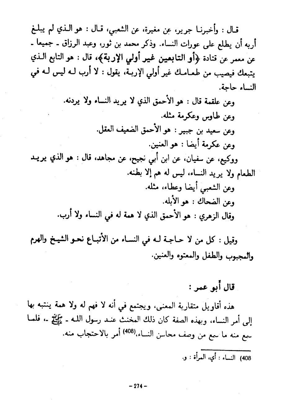 قَالَ وَأَخْبَرَنَا جَرِيرٌ عَنْ مُغِيرَةَ عَنِ الشَّعْبِيِّ قَالَ هُوَ الَّذِي لَمْ يَبْلُغْ أَرَبَهُ أَنْ يَطَّلِعَ عَلَى عَوْرَاتِ النِّسَاءِ وَذَكَرَ مُحَمَّدُ بْنُ ثَوْرٍ وَعَبْدُ الرَّزَّاقِ جَمِيعًا عَنْ مَعْمَرٍ عَنْ قَتَادَةَ أَوِ التَّابِعِينَ غَيْرِ أُولِي الْإِرْبَةِ قَالَ هُوَ التَّابِعُ الَّذِي يَتْبَعُكَ فَيُصِيبُ مِنْ طَعَامِكَ غَيْرُ أُولِي الْإِرْبَةِ يَقُولُ لَا أَرَبَ لَهُ لَيْسَ لَهُ فِي النِّسَاءِ حَاجَةٌ وَعَنْ عَلْقَمَةَ قَالَ هُوَ الْأَحْمَقُ الَّذِي لَا يُرِيدُ النِّسَاءَ وَلَا يُرِدْنَهُ وَعَنْ طَاوُسٍ وَعِكْرِمَةَ مِثْلَهُ وَعَنْ سَعِيدِ بْنِ جُبَيْرٍ هُوَ الْأَحْمَقُ الضَّعِيفُ الْعَقْلِ وَعَنْ عِكْرِمَةَ أَيْضًا هُوَ الْعِنِّينُ وَوَكِيعٌ عَنْ سُفْيَانُ عَنِ ابْنِ أَبِي نَجِيحٍ عَنْ مُجَاهِدٍ قَالَ هُوَ الَّذِي يُرِيدُ الطَّعَامَ وَلَا يُرِيدُ النِّسَاءَ لَيْسَ لَهُ هَمٌّ إِلَّا بَطْنَهُ وَعَنِ الشَّعْبِيِّ أَيْضًا وَعَطَاءٍ مِثْلَهُ وَعَنِ الضَّحَّاكِ هُوَ الْأَبْلَهُ وَقَالَ الزُّهْرِيُّ هُوَ الْأَحْمَقُ الَّذِي لَا هِمَّةَ لَهُ فِي النِّسَاءِ وَلَا أَرَبَ وَقِيلَ كُلُّ مَنْ لَا حَاجَةَ لَهُ فِي النِّسَاءِ مِنَ الْأَتْبَاعِ نَحْوَ الشَّيْخِ وَالْهَرَمِ وَالْمَجْبُوبِ وَالطِّفْلِ وَالْمَعْتُوهِ وَالْعِنِّينِ قَالَ أَبُو عُمَرَ هَذِهِ أَقَاوِيلُ مُتَقَارِبَةُ الْمَعْنَى وَيَجْتَمِعُ فِي أَنَّهُ لَا فَهْمَ له ولاهمة يَنْتَبِهُ بِهَا إِلَى أَمْرِ النِّسَاءِ وَبِهَذِهِ الصِّفَةِ كَانَ ذَلِكَ الْمُخَنَّثُ عِنْدَ رَسُولِ اللَّهِ صَلَّى اللَّهُ عَلَيْهِ وَسَلَّمَ فَلَمَّا سَمِعَ مِنْهُ مَا سَمِعَ مِنْ وَصْفِ مَحَاسِنِ النِّسَاءِ أَمَرَ بِالِاحْتِجَابِ منه