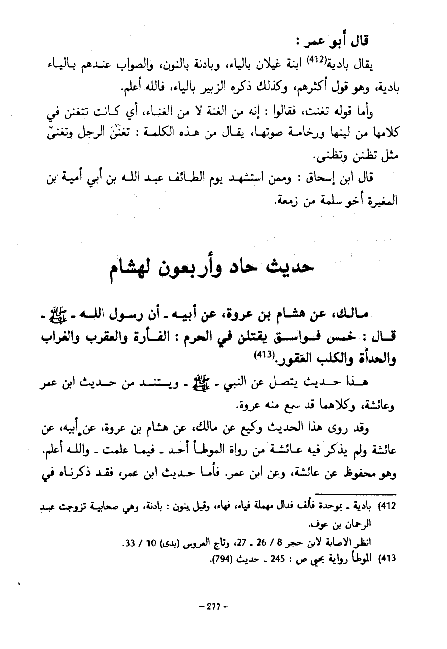 حَدِيثٌ حَادٍ وَأَرْبَعُونَ لِهِشَامٍ مَالِكٍ عَنْ هِشَامِ بْنِ عُرْوَةَ عَنْ أَبِيهِ أَنَّ رَسُولَ اللَّهِ صَلَّى اللَّهُ عَلَيْهِ وَسَلَّمَ قَالَ خَمْسُ فَوَاسِقَ يُقْتَلْنَ فِي الْحَرَمِ الْفَأْرَةُ وَالْعَقْرَبُ وَالْغُرَابُ وَالْحِدَأَةُ وَالْكَلْبُ الْعَقُورُ هَذَا حَدِيثٌ يَتَّصِلُ عَنِ النَّبِيِّ صَلَّى اللَّهُ عَلَيْهِ وَسَلَّمَ وَيَسْتَنِدُ مِنْ حَدِيثِ ابْنِ عُمَرَ وَعَائِشَةَ وَكِلَاهُمَا قَدْ سَمِعَ مِنْهُ عُرْوَةُ وَقَدْ رَوَى هَذَا الْحَدِيثَ وَكِيعٌ عَنْ مَالِكٍ عَنْ هِشَامِ بْنِ عُرْوَةَ عَنْ أَبِيهِ عن عائشة وَلَمْ يَذْكُرْ فِيهِ عَائِشَةَ مِنْ رُوَاةِ الْمُوَطَّأِ أَحَدٌ فِيمَا عَلِمْتُ وَاللَّهُ أَعْلَمُ وَهُوَ مَحْفُوظٌ عَنْ عَائِشَةَ وَعَنِ ابْنِ عُمَرَ فَأَمَّا حَدِيثُ ابْنِ عُمَرَ فَقَدْ ذَكَرْنَاهُ فِي