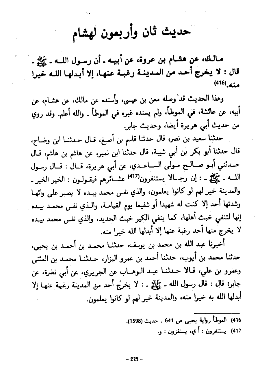 حَدِيثٌ ثَانٍ وَأَرْبَعُونَ لِهِشَامٍ مَالِكٍ عَنْ هِشَامِ بْنِ عُرْوَةَ عَنْ أَبِيهِ أَنَّ رَسُولَ اللَّهِ صَلَّى اللَّهُ عَلَيْهِ وَسَلَّمَ قَالَ لَا يَخْرُجُ أَحَدٌ مِنَ الْمَدِينَةِ رَغْبَةً عَنْهَا إِلَّا أَبْدَلَهَا اللَّهُ خَيْرًا مِنْهُ وَهَذَا الْحَدِيثُ قَدْ وَصَلَهُ مَعْنُ بْنُ عِيسَى وَأَسْنَدَهُ عَنْ مَالِكٍ عَنْ هِشَامٍ عَنْ أَبِيهِ عَنْ عَائِشَةَ فِي الْمُوَطَّأِ وَلَمْ يُسْنِدْهُ غَيْرُهُ فِي الْمُوَطَّأِ وَاللَّهُ أَعْلَمُ وَقَدْ رُوِيَ مِنْ حَدِيثِ أَبِي هُرَيْرَةَ أَيْضًا وَحَدِيثِ جَابِرٍ حَدَّثَنَا سَعِيدُ بْنُ نَصْرٍ قَالَ حَدَّثَنَا قَاسِمُ بْنُ أَصْبَغَ قَالَ حَدَّثَنَا ابْنُ وَضَّاحٍ قَالَ حَدَّثَنَا أَبُو بَكْرِ بْنُ أَبِي شَيْبَةَ قَالَ حَدَّثَنَا ابْنُ نُمَيْرٍ عَنْ هَاشِمِ بْنِ هَاشِمٍ قَالَ حَدَّثَنِي أَبُو صَالِحٍ مَوْلَى السَّاعِدِيِّ عَنْ أَبِي هُرَيْرَةَ قَالَ قَالَ رَسُولُ اللَّهِ صَلَّى اللَّهُ عَلَيْهِ وَسَلَّمَ إِنَّ رِجَالًا يَسْتَنْفِرُونَ عَشَائِرَهُمْ فَيَقُولُونَ الْخَيْرَ الْخَيْرَ وَالْمَدِينَةُ خَيْرٌ لَهُمْ لَوْ كَانُوا يَعْلَمُونَ وَالَّذِي نَفْسُ مُحَمَّدٍ بيده لا يصبر على وائها وَشِدَّتِهَا أَحَدٌ إِلَّا كُنْتُ لَهُ شَهِيدًا أَوْ شَفِيعًا يَوْمَ الْقِيَامَةِ وَالَّذِي نَفْسُ مُحَمَّدٍ بِيَدِهِ إِنَّهَا لَتَنْفِي خُبْثَ أَهْلِهَا كَمَا يَنْفِي الْكِيرُ خُبْثَ الْحَدِيدِ وَالَّذِي نَفْسُ مُحَمَّدٍ بِيَدِهِ لَا يَخْرُجُ مِنْهَا أَحَدٌ رَغْبَةً عَنْهَا إِلَّا أَبْدَلَهَا اللَّهُ خَيْرًا مِنْهُ أَخْبَرَنَا عَبْدُ اللَّهِ بْنُ مُحَمَّدِ بْنِ يُوسُفَ حَدَّثَنَا مُحَمَّدُ بْنُ أَحْمَدَ بْنِ يَحْيَى حَدَّثَنَا مُحَمَّدُ بْنُ أَيُّوبَ حَدَّثَنَا أَحْمَدُ بْنُ عَمْرٍو الْبَزَّارُ حَدَّثَنَا مُحَمَّدُ بْنُ الْمُثَنَّى وَعَمْرُو بْنُ عَلِيٍّ قَالَا حَدَّثَنَا عَبْدُ الْوَهَّابِ عَنِ الْجُرَيْرِيِّ عَنْ أَبِي نَضْرَةَ عَنْ جَابِرٍ قَالَ قَالَ رَسُولُ اللَّهِ صَلَّى اللَّهُ عَلَيْهِ وَسَلَّمَ لَا يَخْرُجُ أَحَدٌ مِنَ الْمَدِينَةِ رَغْبَةً عَنْهَا إِلَّا أَبْدَلَهَا اللَّهُ بِهِ خَيْرًا مِنْهُ وَالْمَدِينَةُ خَيْرٌ لَهُمْ لَوْ كَانُوا يَعْلَمُونَ