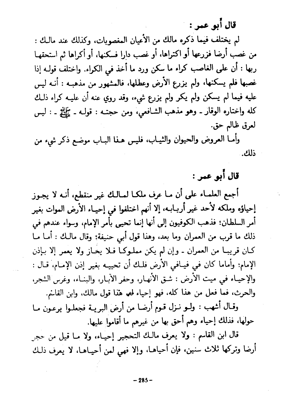 قَالَ أَبُو عُمَرَ لَمْ يَخْتَلِفْ فِيمَا ذَكَرَهُ مَالِكٌ مِنَ الْأَعْيَانِ الْمَغْصُوبَاتِ وَكَذَلِكَ عِنْدَ مَالِكٍ مَنْ غَصَبَ أَرْضًا فَزَرَعَهَا أَوِ اكْتَرَاهَا أَوْ غَصَبَ دَارًا فَسَكَنَهَا أَوْ أَكْرَاهَا ثُمَّ اسْتَحَقَّهَا رَبَّهَا أَنَّ عَلَى الْغَاصِبِ كِرَاءَ مَا سَكَنَ ورد ما أخذ في الكراء واختلف قوله إذا غضبها فَلَمْ يَسْكُنْهَا وَلَمْ يَزْرَعِ الْأَرْضَ وَعَطَّلَهَا فَالْمَشْهُورُ مِنْ مَذْهَبِهِ أَنَّهُ لَيْسَ عَلَيْهِ فِيمَا لَمْ يَسْكُنْ وَلَمْ يُكْرِ وَلَمْ يَزْرَعْ شَيْءٌ وَقَدْ رُوِيَ عَنْهُ أَنَّ عَلَيْهِ كِرَاءَ ذَلِكَ كُلِّهِ وَاخْتَارَهُ الْوَقَّارُ وَهُوَ مَذْهَبُ الشَّافِعِيِّ وَمِنْ حُجَّتِهِ قَوْلُهُ صَلَّى اللَّهُ عَلَيْهِ وَسَلَّمَ لَيْسَ لِعِرْقٍ ظَالِمٍ حَقٌّ وَأَمَّا الْعُرُوضُ وَالْحَيَوَانُ وَالثِّيَابُ فَلَيْسَ هَذَا الْبَابُ مَوْضِعَ ذِكْرِ شَيْءٍ مِنْ ذَلِكَ قَالَ أَبُو عُمَرَ أَجْمَعَ الْعُلَمَاءُ عَلَى أَنَّ مَا عُرِفَ مِلْكًا لِمَالِكٍ غَيْرَ مُنْقَطِعٍ أَنَّهُ لَا يَجُوزُ إِحْيَاؤُهُ وَمِلْكُهُ لِأَحَدٍ غَيْرِ أَرْبَابِهِ إِلَّا أَنَّهُمُ اخْتَلَفُوا فِي إِحْيَاءِ الْأَرْضِ الْمَوَاتِ بِغَيْرِ أَمْرِ السُّلْطَانِ فَذَهَبَ الْكُوفِيُّونَ إِلَى أَنَّهَا إِنَّمَا تُحْيَى بِأَمْرِ الْإِمَامِ وَسَوَاءً عِنْدَهُمْ فِي ذَلِكَ مَا قَرُبَ مِنَ الْعُمْرَانِ وَمَا بَعُدَ وَهَذَا قَوْلُ أَبِي حَنِيفَةَ وَقَالَ مَالِكٌ أَمَّا مَا كَانَ قَرِيبًا مِنَ الْعُمْرَانِ وَإِنْ لَمْ يَكُنْ مَمْلُوكًا فَلَا يُحَازُ وَلَا يُعَمَّرُ إِلَّا بإذن الإمام وأماما كَانَ فِي فَيَافِي الْأَرْضِ فَلَكَ أَنْ تُحْيِيَهُ بِغَيْرِ إِذْنِ الْإِمَامِ قَالَ وَالْإِحْيَاءُ فِي مَيِّتِ الْأَرْضِ شَقُّ الْأَنْهَارِ وَحَفْرُ الْآبَارِ وَالْبِنَاءِ وَغَرْسُ الشَّجَرِ وَالْحَرْثِ فَمَا فُعِلَ مِنْ هَذَا كُلِّهِ فَهُوَ إِحْيَاءٌ هَذَا قَوْلُ مَالِكٍ وَابْنُ الْقَاسِمِ وَقَالَ أَشْهَبُ وَلَوْ نَزَلَ قَوْمٌ أَرْضًا مِنْ أَرْضِ الْبَرِّيَّةِ فَجَعَلُوا يَرْعُونَ مَا حَوْلَهَا فَذَلِكَ إيحاء وَهُمْ أَحَقُّ بِهَا مِنْ غَيْرِهِمْ مَا أَقَامُوا عَلَيْهَا قَالَ ابْنُ الْقَاسِمِ وَلَا يَعْرِفُ مَالِكٌ التَّحْجِيرَ إِحْيَاءً وَلَا مَا قِيلَ مِنْ حِجْرِ أَرْضًا وَتَرْكِهَا ثَلَاثَ سِنِينَ فَإِنْ أَحْيَاهَا وَإِلَّا فَهِيَ لِمَنْ أَحْيَاهَا لَا يَعْرِفُ ذَلِكَ