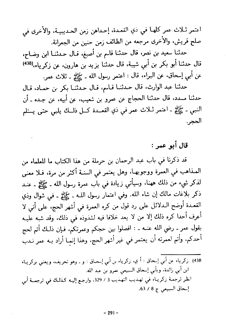 اعْتَمَرَ ثَلَاثَ عُمَرٍ كُلُّهَا فِي ذِي الْقَعْدَةِ إِحْدَاهُنَّ زَمَنَ الْحُدَيْبِيَةِ وَالْأُخْرَى فِي صُلْحِ قُرَيْشٍ والأخرى مرجع مِنَ الطَّائِفِ زَمَنَ حُنَيْنٍ مِنَ الْجِعِرَّانَةِ حَدَّثَنَا سَعِيدُ بْنُ نَصْرٍ قَالَ حَدَّثَنَا قَاسِمُ بْنُ أَصْبَغَ قَالَ حَدَّثَنَا ابْنُ وَضَّاحٍ قَالَ حَدَّثَنَا أَبُو بَكْرِ بْنُ أَبِي شَيْبَةَ قَالَ حدثنا يَزِيدُ بْنُ هَارُونَ عَنْ زَكَرِيَّاءَ عَنْ أَبِي إِسْحَاقَ عَنِ الْبَرَاءِ قَالَ اعْتَمَرَ رَسُولُ اللَّهِ صَلَّى اللَّهُ عَلَيْهِ وَسَلَّمَ ثَلَاثٌ عُمَرٍ حَدَّثَنَا عَبْدُ الْوَارِثِ قَالَ حَدَّثَنَا قَاسِمٌ قَالَ حَدَّثَنَا بَكْرُ بْنُ حَمَّادٍ قَالَ حَدَّثَنَا مُسَدَّدٌ قَالَ حَدَّثَنَا الْحَجَّاجُ عَنْ عَمْرِو بْنِ شُعَيْبٍ عَنْ أَبِيهِ عَنْ جَدِّهِ أَنَّ النَّبِيَّ صَلَّى اللَّهُ عَلَيْهِ وَسَلَّمَ اعْتَمَرَ ثَلَاثَ عُمَرٍ فِي ذِي الْقَعْدَةِ كُلُّ ذَلِكَ يُلَبِّي حَتَّى يَسْتَلِمَ الْحَجَرَ قَالَ أَبُو عُمَرَ قَدْ ذَكَرْنَا فِي بَابِ عبد الرحمان بْنِ حَرْمَلَةَ مِنْ هَذَا الْكِتَابِ مَا لِلْعُلَمَاءِ مِنَ الْمَذَاهِبِ فِي الْعُمْرَةِ وَوُجُوبِهَا وَهَلْ يَعْتَمِرُ فِي السَّنَةِ أَكْثَرَ مِنْ مَرَّةٍ فَلَا مَعْنَى لذكر شيء من ذلك ههنا وَسَيَأْتِي زِيَادَةٌ فِي بَابِ عُمْرَةِ رَسُولُ اللَّهِ صَلَّى اللَّهُ عَلَيْهِ وَسَلَّمَ عِنْدَ ذِكْرِ بَلَاغَاتِ مَالِكٍ إِنْ شَاءَ اللَّهُ وَفِي اعْتِمَارَ رَسُولِ اللَّهِ صَلَّى اللَّهُ عَلَيْهِ وَسَلَّمَ فِي شَوَّالٍ وَذِي الْقَعْدَةِ أَوْضَحُ الدَّلَائِلِ عَلَى رَدِّ قَوْلِ مَنْ كَرِهَ الْعُمْرَةَ فِي أَشْهُرِ الْحَجِّ عَلَى أَنِّي لَا أَعْرِفُ أَحَدًا كَرِهَ ذَلِكَ إِلَّا مَنْ لَا يُعَدُّ خِلَافًا فِيهِ لِشُذُوذِهِ فِي ذَلِكَ وَقَدْ شُبِّهَ عَلَيْهِ بِقَوْلِ عُمَرَ رَضِيَ اللَّهُ عَنْهُ افْصِلُوا بَيْنَ حَجِّكُمْ وَعُمْرَتِكُمْ فَإِنَّ ذَلِكَ أَتَمُّ لِحَجِّ أَحَدِكُمْ وَأَتَمُّ لِعُمْرَتِهِ أَنْ يَعْتَمِرَ فِي غَيْرِ أَشْهُرِ الْحَجِّ وَهَذَا إِنَّمَا أَرَادَ بِهِ عُمَرُ ندب
